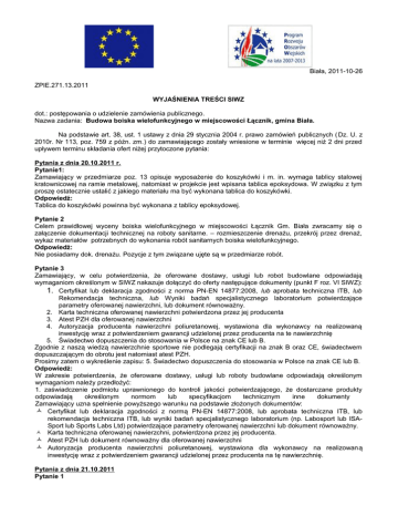 Biała, 2011-10-26 ZPIE.271.13.2011 WYJAŚNIENIA TREŚCI SIWZ dot.: postępowania o udzielenie zamówienia publicznego. Nazwa zadania: Budowa boiska wielofunkcyjnego w miejscowości Łącznik, gmina Biała. Na podstawie art. 38, ust. 1 ustawy z dnia 29 stycznia 2004 r. prawo zamówień publicznych ( Dz. U. z 2010r. Nr 113, poz. 759 z późn. zm.) do zamawiającego zostały wniesione w terminie więcej niż 2 dni przed upływem terminu składania ofert niżej przytoczone pytania: Pytania z dnia 20.10.2011 r. Pytanie1: Zamawiający w przedmiarze poz. 13 opisuje wyposażenie do koszykówki i m. in. wymaga tablicy stalowej kratownicowej na ramie metalowej, natomiast w projekcie jest wpisana tablica epoksydowa. W związku z tym proszę ostatecznie ustalić z jakiego materiału ma być wykonana tablica do koszykówki. Odpowiedź: Tablica do koszykówki powinna być wykonana z tablicy epoksydowej. Pytanie 2 Celem prawidłowej wyceny boiska wielofunkcyjnego w miejscowości Łącznik Gm. Biała zwracamy się o załączenie dokumentacji technicznej na roboty sanitarne. – rozmieszczenie drenażu, przekrój przez drenaż, wykaz materiałów potrzebnych do wykonania robót sanitarnych boiska wielofunkcyjnego. Odpowiedź: Nie posiadamy dok. drenażu. Pozycje z tym związane ujęte są w przedmiarze robót. Pytanie 3 Zamawiający, w celu potwierdzenia, że oferowane dostawy, usługi lub robot budowlane odpowiadają wymaganiom określonym w SIWZ nakazuje dołączyć do oferty następujące dokumenty (punkt F roz. VI SIWZ): 1. Certyfikat lub deklaracja zgodności z norma PN-EN 14877:2008, lub aprobata techniczna ITB, lub Rekomendacja techniczna, lub Wyniki badań specjalistycznego laboratorium potwierdzające parametry oferowanej nawierzchni, lub dokument równoważny. 2. Karta techniczna oferowanej nawierzchni potwierdzona przez jej producenta 3. Atest PZH dla oferowanej nawierzchni 4. Autoryzacja producenta nawierzchni poliuretanowej, wystawiona dla wykonawcy na realizowaną inwestycję wraz z potwierdzeniem gwarancji udzielonej przez producenta na te nawierzchnię 5. Świadectwo dopuszczenia do stosowania w Polsce na znak CE lub B. Zgodnie z naszą wiedzą nawierzchnie sportowe nie podlegają certyfikacji na znak B oraz CE, świadectwem dopuszczającym do obrotu jest natomiast atest PZH. Prosimy zatem o wykreślenie zapisu: 5. Świadectwo dopuszczenia do stosowania w Polsce na znak CE lub B. Odpowiedź: W zakresie potwierdzenia, że oferowane dostawy, usługi lub roboty budowlane odpowiadają określonym wymaganiom należy przedłożyć: 1. zaświadczenie podmiotu uprawnionego do kontroli jakości potwierdzającego, że dostarczane produkty odpowiadają określonym normom lub specyfikacjom technicznym inne dokumenty Zamawiający uzna spełnienie powyższego warunku na podstawie złożonych dokumentów: Certyfikat lub deklaracja zgodności z normą PN-EN 14877:2008, lub aprobata techniczna ITB, lub rekomendacja techniczna ITB, lub wyniki badań specjalistycznego laboratorium (np. Labosport lub ISASport lub Sports Labs Ltd) potwierdzające parametry oferowanej nawierzchni lub dokument równoważny. Karta techniczna oferowanej nawierzchni, potwierdzona przez jej producenta. Atest PZH lub dokument równoważny dla oferowanej nawierzchni Autoryzacja producenta nawierzchni poliuretanowej, wystawiona dla wykonawcy na realizowaną inwestycję wraz z potwierdzeniem gwarancji udzielonej przez producenta na tę nawierzchnię. Pytania z dnia 21.10.2011 Pytanie 1 Panel z siatki zgrzewanej wys. 4,0m i szer. 2,5m jest trudno dostępny ze względu na swoją wysokość. Przy ogrodzeniu panelowym wys. 4,0m stosuje się dwa panele wys. 2,0m. Czy zamawiający wyrazi zgodę na zastosowanie takiego rozwiązania? Odpowiedź: Tak, wyrażamy zgodę 2 x 2m. Pytanie 2 Zamawiający w odpowiedziach z dnia 20.10.2013. do pytania nr 1 z dnia 11.10.2011 umieścił nowe rygorystyczne parametry nawierzchni poliuretanowej wskazując w ten sposób na jednego producenta, taki zapis uniemożliwia zaproponowanie innym oferentom nawierzchni równoważnych, jest to sprzeczne z zasadą uczciwej konkurencji, która musi być przestrzegana zgodnie z Ustawą o Zamówieniach Publicznych. Wymagane przez Zamawiającego parametry zostały spisane z karty technicznej i zostały tak opisane aby wyeliminować innych producentów m. in. poprzez wprowadzenie zakresów wartości poszczególnych parametrów, np. wytrzymałość na rozdzieranie: od 130N do 140N, wydłużenie względne przy zerwaniu: od 67% do 72%. Dodatkowo zamawiający w odpowiedziach do pytania nr 5 umieszcza nowy wykaz dokumentów jakie powinna posiadać nawierzchnia syntetyczna. Zamawiający zażądał m. in. przedstawienia Aprobaty lub Rekomendacji technicznej ITB, Raport l badań przeprowadzonych przez akredytowane laboratorium (Labosport lub ISA-Sport lub Sports Labs Ltd) potwierdzające spełnienie wymagań stawianych przez organizacje IAAF oraz certyfikat FIBA 2 class na zewnętrzną nawierzchnię poliuretanową. Zgodnie z obowiązującym prawem budowlanym dokumentem wystarczającym do wprowadzenia produktu na rynek jest deklaracja zgodności z polską normą wystawiona przez producenta lub autoryzowanego przedstawiciela. Niezrozumiałe jest dlaczego Zamawiający wymaga badań IAAF (lnternational Association of Athletlcs Federations - Międzynarodowe Stowarzyszenie Federacji Lekkoatletycznych) i jednocześnie certyfikatu FIBA (Fédération Internatlonale de Basketball - Międzynarodowa Federacja Koszykówki). IAAF bada nawierzchnie lekkoatletyczne, natomiast certyfikat FIBA jest wydawany dla nawierzchni spełniających normy i wymagania tej organizacji. Przedmiotem zamówienia Jest boisko wielofunkcyjne, na którym nie będą odbywać się międzynarodowe zawody lekkoatletyczne, czy też międzynarodowe rozgrywki w koszykówkę. W związku z powyższym wnosimy o dopuszczenie wszystkich nawierzchni poliuretanowych spełniających wymogi normy PN-EN 14877 oraz o zmianę w zapisie w