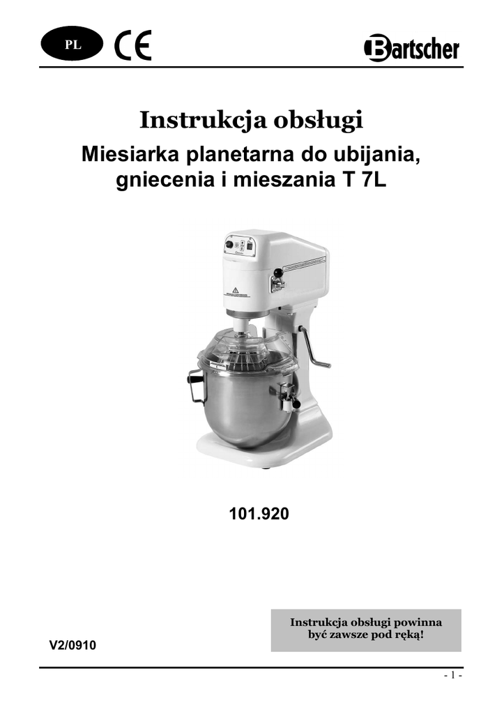 PL Instrukcja obsługi Miesiarka planetarna do ubijania, gniecenia i mieszania T 7L 101.920 Instrukcja obsługi powinna być zawsze pod ręką! V2/0910 -1- -2- 1. Informacje ogólne 1.1 Informacje dotyczące instrukcji obsługi 1.2 Wyjaśnienie symboli 1.3 Odpowiedzialność producenta i gwarancja 1.4 Ochrona praw autorskich 1.5 Deklaracja Zgodności 4 4 4 5 5 5 2. Bezpieczeństwo 2.1 Informacje ogólne 2.2 Wskazówki dotyczące bezpieczeństwa przy zastosowaniach urządzenia 2.3 Użytkowanie zgodnie z przeznaczeniem 6 6 6-7 7 3. Transport, opakowanie i magazynowanie 3.1 Kontrola dostawy 3.2 Opakowanie 3.3 Magazynowanie 8 8 8 8 4. Parametry techniczne 4.1 Dane techniczne 4.2 Zestawienie podzespołów urządzenia 9 9 9 5. Instalacja i obsługa urządzenia 5.1 Wskazówki dotyczące bezpieczeństwa 5.2 Ustawienie i podłączenie urządzenia 10 10 11 1116 5.3 Obsługa 6. Czyszczenie i konserwacja 6.1 Wskazówki dotyczące bezpieczeństwa 6.2 Czyszczenie 6.3 Wskazówki dotyczące bezpieczeństwa podczas konserwacji 16 16 16 17 7. Możliwe usterki 17 8. Utylizacja 18 Bartscher GmbH Franz-Kleine-Straße 28 D-33154 Salzkotten Niemcy Tel.: +49 (0) 5258 971-0 Faks: +49 (0) 5258 971-120 -3- 1. Informacje ogólne 1.1 Informacje dotyczące instrukcji obsługi Niniejsza instrukcja obsługi zawiera opis instalacji urządzenia, jego obsługi oraz konserwacji i służy jako ważne źródło informacji oraz poradnik. Znajomość i przestrzeganie wszystkich zawartych w niej wskazówek dotyczących bezpieczeństwa i obsługi stanowi warunek bezpiecznej i prawidłowej pracy z urządzeniem. Ponadto należy przestrzegać lokalnych przepisów dotyczących zapobiegania wypadkom oraz zasad BHP. Instrukcja obsługi stanowi integralny element urządzenia i należy ją przechowywać w pobliżu urządzenia, aby osoby instalujące urządzenie, prowadzące prace konserwacyjne i obsługujące lub czyszczące urządzenie miały do niej stały dostęp. 1.2 Wyjaśnienie symboli Ważne wskazówki dotyczące bezpieczeństwa oraz kwestii technicznych oznaczono w niniejszej instrukcji obsługi odpowiednimi symbolami. Wskazówek tych należy bezwzględnie przestrzegać, aby uniknąć ewentualnych wypadków, uszczerbku na życiu i zdrowiu osób oraz szkód rzeczowych. UWAGA! Symbol ten oznacza zagrożenia mogące prowadzić do powstania obrażeń ciała. Należy bezwzględnie i skrupulatnie przestrzegać niniejszych wskazówek BHP, a w odpowiednich sytuacjach zachować szczególną ostrożność. NIEBEZPIECZEŃSTWO! Zagrożenie prądem elektrycznym! Symbol ten zwraca uwagę na zagrożenia prądem elektrycznym. Ignorowanie wskazówek dotyczących bezpieczeństwa stwarza niebezpieczeństwo odniesienia obrażeń ciała lub utraty życia. OSTRZEŻENIE! Tym symbolem oznaczono wskazówki, których ignorowanie może, w konsekwencji, doprowadzić do uszkodzenia urządzenia, jego nieprawidłowego działania lub / i awarii. WSKAZÓWKA! Ten symbol wskazuje na porady oraz informacje istotne dla efektywnej i bezawaryjnej pracy urządzenia. -4- 1.3 Odpowiedzialność producenta i gwarancja Wszystkie informacje zawarte w niniejszej instrukcji obsługi zostały zestawione przy uwzględnieniu obowiązujących przepisów, aktualnej wiedzy konstruktorskiej i inżynierskiej oraz naszej wiedzy, a także naszych wieloletnich doświadczeń. Również tłumaczenia instrukcji obsługi zostały wykonane jak najbardziej rzetelnie. Nie możemy jednak przejąć odpowiedzialności za ewentualne błędy w tłumaczeniu. Wersją rozstrzygającą jest załączona instrukcja obsługi w języku niemieckim. W przypadku zamówienia modeli specjalnych lub opcji dodatkowych, oraz w sytuacji zastosowania najnowszych zdobyczy wiedzy technicznej, dostarczone urządzenie może różnić się od objaśnień oraz rysunków zawartych w niniejszej instrukcji obsługi. W razie wątpliwości prosimy o kontakt z producentem. WSKAZÓWKA! Przed rozpoczęciem jakichkolwiek prac, a w szczególności przed uruchomieniem urządzenia, należy dokładnie zapoznać się z treścią niniejszej instrukcji obsługi. Producent nie odpowiada za szkody i uszkodzenia powstałe wskutek nieprzestrzegania informacji zawartych w instrukcji obsługi. Instrukcję obsługi należy przechowywać bezpośrednio przy urządzeniu; ponadto musi być ona dostępna dla wszystkich osób pracujących z urządzeniem. Zastrzegamy sobie prawo do wprowadzania zmian technicznych w produkcie, służących poprawie właściwości użytkowych urządzenia oraz jego ulepszaniu. 1.4 Ochrona praw autorskich Niniejsza instrukcja obsługi oraz zawarte w niej teksty, rysunki, zdjęcia i inne elementy podlegają ochronie prawem autorskim. Bez uzyskania pisemnej zgody producenta, zabrania się powielania treści instrukcji obsługi w jakiejkolwiek formie i w jakikolwiek sposób (także fragmentów), oraz wykorzystywania lub / i przekazywania jej zawartości osobom trzecim. Naruszenia powyższego skutkują obowiązkiem wypłaty odszkodowania. Zastrzegamy sobie prawo do dochodzenia dalszych roszczeń. WSKAZÓWKA! Dane, teksty, rysunki, zdjęcia i inne opisy zawarte w niniejszej instrukcji, podlegają ochronie prawem autorskim oraz prawem ochrony własności przemysłowej. Każde nadużycie w jej wykorzystaniu jest karalne. 1.5 Deklaracja Zgodności Urządzenie spełnia aktualnie obowiązujące normy oraz wytyczne Unii Europejskiej. Powyższe potwierdzamy w Deklaracji Zgodności WE. W razie potrzeby chętnie prześlemy Państwu odpowiednią Deklarację Zgodności. -5- 2. Bezpieczeństwo Niniejszy rozdział zawiera zarys informacji, dotyczących wszystkich istotnych aspektów związanych z bezpieczeństwem. Ponadto poszczególne rozdziały zawierają konkretne wskazówki (oznaczone symbolami), dotyczące bezpieczeństwa i mające zapobiegać powstawaniu zagrożeń. Należy także przestrzegać informacji z piktogramów, tabliczek oraz napisów umieszczonych na urządzeniu i zadbać o to, aby były one czytelne. Przestrzeganie wszys