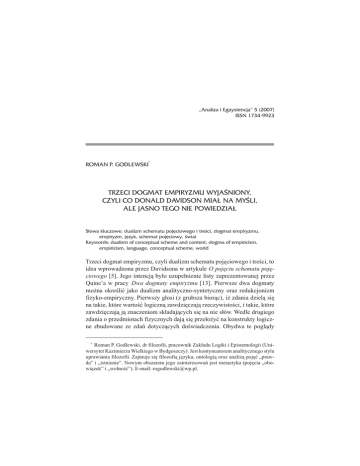 Trzeci dogmat empiryzmu wyjaniony 71 Analiza i Egzystencja 5 (2007) ISSN 1734-9923 ROMAN P. GODLEWSKI* TRZECI DOGMAT EMPIRYZMU WYJANIONY, CZYLI CO DONALD DAVIDSON MIA£ NA MYLI, ALE JASNO TEGO NIE POWIEDZIA£ S³owa kluczowe: dualizm schematu pojêciowego i treci, dogmat empiryzmu, empiryzm, jêzyk, schemat pojêciowy, wiat Keywords: dualism of conceptual scheme and content, dogma of empiricism, empiricism, language, conceptual scheme, world Trzeci dogmat empiryzmu, czyli dualizm schematu pojêciowego i treci, to idea wprowadzona przez Davidsona w artykule O pojêciu schematu pojêciowego [5]. Jego intencj¹ by³o uzupe³nienie listy zaprezentowanej przez Quinea w pracy Dwa dogmaty empiryzmu [13]. Pierwsze dwa dogmaty mo¿na okreliæ jako dualizm analityczno-syntetyczny oraz redukcjonizm fizyko-empiryczny. Pierwszy g³osi (z grubsza bior¹c), i¿ zdania dziel¹ siê na takie, które wartoæ logiczn¹ zawdziêczaj¹ rzeczywistoci, i takie, które zawdziêczaj¹ j¹ znaczeniom sk³adaj¹cych siê na nie s³ów. Wedle drugiego zdania o przedmiotach fizycznych daj¹ siê prze³o¿yæ na konstrukty logiczne zbudowane ze zdañ dotycz¹cych dowiadczenia. Obydwa te pogl¹dy Roman P. Godlewski, dr filozofii, pracownik Zak³adu Logiki i Epistemologii (Uniwersytet Kazimierza Wielkiego w Bydgoszczy). Jest kontynuatorem analitycznego stylu uprawiania filozofii. Zajmuje siê filozofi¹ jêzyka, ontologi¹ oraz analiz¹ pojêæ prawda i istnienie. Nowym obszarem jego zainteresowañ jest metaetyka (pojêcia obowi¹zek i wolnoæ). E-mail: [email protected]. * 72 Roman P. Godlewski Quine zidentyfikowa³ w tradycji empiryzmu zachodniego; orzek³, ¿e s¹ b³êdne i odrzuci³ je. To samo uczyni³ Davidson wzglêdem dogmatu wskazanego przez siebie. Jego praca jednak pozostawia czytelnika z zagadk¹, co dok³adnie mia³ na myli. Podajemy ni¿ej jej rozwi¹zanie. Pierwsz¹ wskazówk¹ jest zapowied Davidsona, i¿ jego intencj¹ jest zniesienie mo¿liwoci relatywizmu. Oznacza to, ¿e wynik interpretacji zawsze musi prowadziæ do tego, ¿e dualizm schematu pojêciowego i treci czyni relatywizm mo¿liwym, za jego odrzucenie powoduje, i¿ dla relatywizmu, przynajmniej w pewnej jego postaci, miejsca ju¿ nie ma. Drug¹ wskazówk¹ jest pointa artyku³u, w której Davidson zaznacza, i¿ odrzucaj¹c pojêcie schematu pojêciowego, nie rezygnuje bynajmniej z pojêcia prawdy obiektywnej, czyli prawdy jednej dla wszystkich. Zasadnicze znaczenie ma równie¿ nacisk, jaki Davidson k³adzie na to, i¿ treæ, o której mowa, mia³aby byæ ca³kowicie nieupostaciowana. Dwukrotnie u¿ywa on w zwi¹zku z tym wyra¿enia nie zinterpretowana [5, s. 285, 297]. Wiele cennych wskazówek zawiera tak¿e fragment, w którym Davidson omawia odpowiadanie jako jedn¹ z mo¿liwych relacji miêdzy jêzykiem a dowiadczeniem lub wiatem [5, s. 292]. Pisze: Problem polega na tym, ¿e pojêcie odpowiadania ogó³owi dowiadczeñ, podobnie jak pojêcie odpowiadania faktom czy bycia prawdziwym wobec faktów, nie dodaje nic zrozumia³ego do prostego pojêcia bycia prawdziwym. Mówienie raczej o dowiadczeniu zmys³owym ni¿ o wiadectwach, czy po prostu o faktach, jest wyrazem pewnego pogl¹du na ród³a albo naturê tych wiadectw i nie dodaje ¿adnego bytu nowego rodzaju do uniwersum, na podstawie którego testuje siê schematy pojêciowe. Ogó³ wiadectw zmys³owych, o ile nie ma innego rodzaju wiadectw, jest tym, czego potrzebujemy, i, co sprawia, ¿e nasze zdania i teorie s¹ prawdziwe. Nic jednak, ¿adna rzecz, nie czyni zdañ ani teorii prawdziwymi: ani dowiadczenie, ani pobudzenia nerwowe, ani wiat. To, ¿e dowiadczenie jest takie-a-takie, ¿e nasza skóra zosta³a ogrzana lub nak³uta, ¿e wszechwiat jest skoñczony, te fakty, jeli wolimy mówiæ w ten sposób, czyni¹ zdania i teorie prawdziwymi. Jeszcze trafniej mo¿na to uj¹æ, nie odwo³uj¹c siê do faktów; zdanie Moja skóra jest ciep³a jest prawdziwe wtedy i tylko wtedy, gdy moja skóra jest ciep³a. Nie ma tu mowy o fakcie, wiecie, dowiadczeniu, czy wiadectwie. [5, s. 292] Trzeci dogmat empiryzmu wyjaniony 73 Jeli dobrze rzecz rozumiemy, Davidson twierdzi tu, ¿e orzeczenie prawdziwoci zdania nie anga¿uje ¿adnych przedmiotów poza nim samym. Jak s¹dzimy, wyra¿a tak myl, i¿ prawdziwoæ nie jest zakamuflowanym stosunkiem, zatem zdania j¹ stwierdzaj¹ce nie g³osz¹ ani stosunku do przedmiotu wyró¿nionego, ani te¿ nie maj¹ charakteru egzystencjalnego. (W³asnoci, które nie s¹ zakamuflowanymi stosunkami, bêdziemy nazywaæ w³asnociami w sensie cis³ym.) By rzecz wyjaniæ, rozpatrzmy obie mo¿liwoci. Odnonie do pierwszej wyjaniamy, ¿e zakamuflowanym stosunkiem do przedmiotu wyró¿nionego jest na przyk³ad prawoæ, jeli rozumieæ j¹ jako odniesion¹ do pewnego konkretnego kodeksu, podobny charakter maj¹ te¿ takie pojêcia, jak: chrzecijañstwo, arystotelizm czy stalinizm. cilej za: P jest zakamuflowanym stosunkiem do przedmiotu wyró¿nionego, gdy istnieje taki stosunek Q i przedmiot wyró¿niony a, ¿e P(x) º Q(x, a). Postawienie sprawy w ten sposób kaza³oby zastanowiæ siê nad statusem takich przedmiotów, jak ogó³ mo¿liwego dowiadczenia, ogó³ faktów [por. 6, s. 41] czy wiat. Bowiem po uznaniu prawdziwoci za w³asnoæ w sensie cis³ym, zgodnoæ zdañ z nimi mo¿e byæ traktowana jedynie metaforycznie. A poniewa¿ nie ma ¿adnych innych wa¿nych kontekstów, w których o rzeczach tego rodzaju mówimy, narzuca siê myl, ¿e byæ mo¿e Davidson sk³onny by³by twierdziæ, ¿e, choæ istnieje jego skóra, nie ma czego takiego, jak wiat rozumiany jako ogó³ tego, co istnieje, jak i to, ¿e, choæ jego skóra zosta³a ogrzana, nie ma czego takiego, jak wiat rozumiany jako ogó³ tego, co ma miejsce; a tak¿e to, i¿, o ile istniej¹ dowiadczenia ciep³a, nie ma czego takiego jak ogó³ mo¿liwego dowiadczenia itd. Zarówno bowiem wiat, jak i ogó³ mo¿liwego dowiadczenia istniej¹ jedynie w metaforze, czyli nie istniej¹ naprawdê. Sam Davidson nie wzdraga siê p