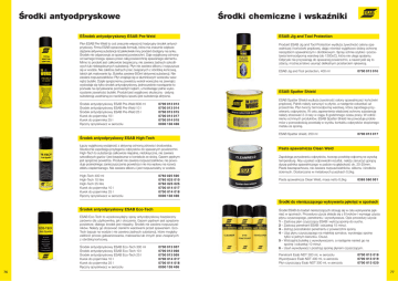 Środki antyodpryskowe Środki chemiczne i wskaźniki EŚrodek antyodpryskowy ESAB Pre-Weld ESAB Jig and Tool Protection Płyn ESAB Pre-Weld to coś znacznie więcej niż tradycyjny środek antyodpryskowy. Firma ESAB opracowała formułę, która ma znacznie większe stężenie aktywnej substancji niż jakikolwiek inny produkt dostępny na rynku. Środek nie odparowuje ze spawanej powierzchni. Daje wyjątkową ochronę od samego brzegu spawu przez całą powierzchnię spawanego elementu. Mimo to produkt jest całkowicie bezpieczny, nie zawiera żadnych szkodliwych lub niebezpiecznych substancji. Płyn nie zawiera silikonu i rozpuszcza się w wodzie. Nie zakłóca żadnych prac związanych z obróbką końcową, takich jak malowanie itp. Butelka zawiera 600ml aktywnej substancji. Nie zawiera rozpuszczalników. Płyn znajduje się w aluminiowym woreczku wewnątrz butelki. Dzięki sprężonemu powietrzu wokół woreczka na zewnątrz wydostaje się tylko środek antyodpryskowy, jednocześnie rozwiązanie to pozwala na opryskiwanie pod każdym kątem, umożliwiając pełne wykorzystanie zawartości butelki. Produkt jest wyjątkowo skuteczny - jedyną substancją uwalnianą po naciśnięciu spustu jest substancja aktywna. Produkt ESAB Jig and Tool Protection wydłuża żywotność osłony spawalniczej i końcówki prądowej, dając również wyjątkowo dobrą ochronę narzędziom spawalniczym i obróbkowym. Spray schnie szybko i pozostawia termoodporną warstwę (do 1300oC), która nie ulega spalaniu. Odpryski nie przywierają do spawanej powierzchni, a nawet jeśli się to zdarzy, można je łatwo usunąć delikatnym przetarciem rękawicą. Środek antyodpryskowy ESAB Pre-Weld 600 ml Środek antyodpryskowy ESAB Pre-Weld 10 l Środek antyodpryskowy ESAB Pre-Weld 25 l Kurek do pojemnika 10 l Kurek do pojemnika 25 l Ręczny spryskiwacz w aerozolu 0700 013 013 0700 013 014 0700 013 015 0700 014 017 0700 014 018 0000 138 408 ESAB Jig and Tool protection, 400 ml 0700 013 016 ESAB Spatter Shield ESAB Spatter Shield wydłuża żywotność osłony spawalniczej i końcówki prądowej. Palnik należy zanurzyć w płynie, a następnie odczekać aż przeschnie. Płyn tworzy termoodporną warstwę, która zapobiega przywieraniu odprysków. W celu zapewnienia właściwej ochrony substancję należy stosować 2-3 razy w ciągu 8-godzinnego czasu pracy. W odróżnieniu od innych produktów, ESAB Spatter Shield nie powoduje problemów z porowatością powstałą w wyniku kontaktu odprysków stopionego metalu ze spoiną. ESAB Spatter shield, 250 ml 0700 013 017 Środek antyodpryskowy ESAB High-Tech Łączy wyjątkową wydajność z aktywną ochroną zdrowia i środowiska. Skutecznie zapobiega przyleganiu odprysków do spawanych powierzchni. High-Tech to substancja całkowicie niepalna, nietoksyczna, nie zawiera szkodliwych gazów i jest bezpieczna w kontakcie ze skórą. Gazem pędnym jest sprężone powietrze. Produkt nie zawiera rozpuszczalników, nie powoduje pośredniego zanieczyszczenia powietrza i nie ma wpływu na rozwój efektu cieplarnianego. Nie zawiera silikonu i jest rozpuszczalny w wodzie. High-Tech 400 ml High-Tech 10 litre High-Tech 25 litre Kurek do pojemnika 10 l Kurek do pojemnika 25 l Ręczny spryskiwacz w aerozolu 0760 025 500 0760 025 010 0760 025 025 0700 014 017 0700 014 018 0000 138 408 Pasta spawalnicza Clean Weld Zapobiega przywieraniu odprysków, tworząc powłokę odporną na wysoką temperaturę. Aby uzyskać odpowiedni rezultat, należy zanurzyć gorącą dyszę palnika spawalniczego w paście na głębokość ok. 20-25mm. Pasta bezzapachowa, nie zawiera rozpuszczalników, silikonu i środków ściernych. Dostarczana w metalowych puszkach 0,5kg. Pasta spawalnicza Clean Weld, masa netto 0,5kg 0365 560 001 Środki do nieniszczącego wykrywania pęknięć w spoinach Środek antyodpryskowy ESAB Eco-Tech ESAB Eco-Tech to wysokowydajny spray antyodpryskowy bezpieczny zarówno dla użytkownika, jak i otoczenia. Gazem pędnym jest sprężone powietrze; dlatego środek jest niepalny. Środek nie zawiera rozpuszczalników. Należy go stosować cienkimi warstwami przed spawaniem. EcoTech bazuje na wodzie i nie zawiera żadnych substancji, które mogłyby zakłócić proces galwanizowania, malowania lub innych prac związanych z obróbką końcową. Środek antyodpryskowy ESAB Eco-Tech 300 ml Środek antyodpryskowy ESAB Eco-Tech 10 l Środek antyodpryskowy ESAB Eco-Tech 25 l Kurek do pojemnika 10 l Kurek do pojemnika 25 l Ręczny spryskiwacz w aerozolu 76 0700 013 007 0700 013 008 0700 013 009 0700 014 017 0700 014 018 0000 138 408 Środki ESAB do badań nieniszczących stosuję się w celu wykrywania pęknięć w spoinach. Procedura użycia składa się z 6 kroków i wymaga użycia płynu czyszczącego, penetrantu i wywoływacza. Opis procedury użycia: 1 – Zastosuj płyn czyszczący ESAB i wytrzyj spoinę do sucha. 2 – Zastosuj penetrant ESAB i odczekaj 15 minut. 3 – Zetrzyj pozostałości penetrantu z powierzchni spoiny 4 – Użyj płynu czyszczącego na miękkiej szmatce, wycierając spoinę tylko w jednym kierunku. Osusz. 5 – Wstrząśnij butelkę z wywoływaczem, a następnie nanieś go na spoinę i odczekaj 10 minut. 6 – Usuń wywoływacz i przetrzyj spoinę płynem czyszczącym. Penetrant Esab NDT 300 ml, w aerozolu Wywoływacz Esab NDT 400 ml, w aerozolu Płyn czyszczący Esab NDT 300 ml, w aerozolu 0700 013 018 0700 013 019 0700 013 020 77 Środki antyodpryskowe Środki chemiczne i wskaźniki EŚrodek antyodpryskowy ESAB Pre-Weld ESAB Jig and Tool Protection Płyn ESAB Pre-Weld to coś znacznie więcej niż tradycyjny środek antyodpryskowy. Firma ESAB opracowała formułę, która ma znacznie większe stężenie aktywnej substancji niż jakikolwiek inny produkt dostępny na rynku. Środek nie odparowuje ze spawanej powierzchni. Daje wyjątkową ochronę od samego brzegu spawu przez całą powierzchnię spawanego elementu. Mimo to produkt jest całkowicie bezpieczny, nie z