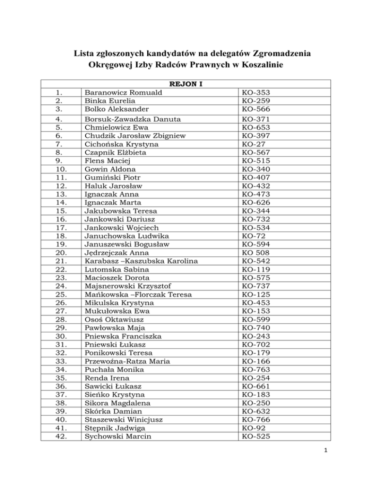 Lista zgłoszonych kandydatów na delegatów Zgromadzenia Okręgowej Izby Radców Prawnych w Koszalinie REJON I 1. 2. 3. 4. 5. 6. 7. 8. 9. 10. 11. 12. 13. 14. 15. 16. 17. 18. 19. 20. 21. 22. 23. 24. 25. 26. 27. 28. 29. 30. 31. 32. 33. 34. 35. 36. 37. 38. 39. 40. 41. 42. Baranowicz Romuald Binka Eurelia Bolko Aleksander Borsuk-Zawadzka Danuta Chmielowicz Ewa Chudzik Jarosław Zbigniew Cichońska Krystyna Czapnik Elżbieta Flens Maciej Gowin Aldona Gumiński Piotr Haluk Jarosław Ignaczak Anna Ignaczak Marta Jakubowska Teresa Jankowski Dariusz Jankowski Wojciech Januchowska Ludwika Januszewski Bogusław Jędrzejczak Anna Karabasz –Kaszubska Karolina Lutomska Sabina Macioszek Dorota Majsnerowski Krzysztof Mańkowska –Florczak Teresa Mikulska Krystyna Mukułowska Ewa Osoś Oktawiusz Pawłowska Maja Pniewska Franciszka Pniewski Łukasz Ponikowski Teresa Przewoźna-Ratza Maria Puchała Monika Renda Irena Sawicki Łukasz Sieńko Krystyna Sikora Magdalena Skórka Damian Staszewski Winicjusz Stępnik Jadwiga Sychowski Marcin KO-353 KO-259 KO-566 KO-371 KO-653 KO-397 KO-27 KO-567 KO-515 KO-340 KO-407 KO-432 KO-473 KO-626 KO-344 KO-732 KO-534 KO-72 KO-594 KO 508 KO-542 KO-119 KO-575 KO-737 KO-125 KO-453 KO-153 KO-599 KO-740 KO-243 KO-702 KO-179 KO-166 KO-763 KO-254 KO-661 KO-183 KO-250 KO-632 KO-766 KO-92 KO-525 1 43. 44. 45. 46. 47. 48. 49. 50. 51. 52. 53. Szewczyk Stanisław Tomaszewska Karolina Tomaszewski Paweł Warkocki Ryszard Winkler Paweł Wiśniewska Barbara Wyszyńska Jolanta Zielezińska Ewa Żebryk Krzysztof Żmuda Joanna Żurowska Teresa KO-361 KO-522 KO-500 KO-392 KO-622 KO-214 SŁ-173 KO- 376 KO-552 KO-406 KO-379 2 Lista zgłoszonych kandydatów na delegatów Zgromadzenia Okręgowej Izby Radców Prawnych w Koszalinie 1. 2. 3. 4. 5. 6. 7. 8. 9. 10. 11. 12. 13. 14. 15. 16. 17. 18. 19. 20. 21. 22. 23. 24. 25. 26. 27. 28. 29. 30. 31. 32. 33. 34. 35. 36. 37. 38. 39. 40. 41. 42. 43. REJON II Chamier-Gliszczyński Wojciech Cieszyński Maciej Dobranowski Rafał Duczmal Maciej Dudź Adam Gastoł Karolina Głowala Bartłomiej Grużewska Krystyna Jakubowska Agata Jankowska-Baranowska Iwona Jankowska-Trzebiatowska Sylwia Juszczyk Czesław Kaczmarek Jolanta Knapik Dariusz Kopeć Małgorzata Koterba Szymon Kowalczyk Lucyna Kowalska Anna Kozłowska Marta Nakonieczna Renata Pierzchalska Katarzyna Piwkowska-Skuza Monika Podruczna Alicja Pohl Maciej Przygodzka-Cieszyńska Małgorzata Radke Mariola Rejmer Aleksandra Rejmer Łukasz Rokita Anna Roman Iwona Rubaj-Królikowska Monika Rzeźniczek-Sałata Małgorzata Agata Sadowska Beata Sobczuk-Jodłowska Anna Soja Anna Szuwalski Przemysław Ścigała Katarzyna Tarnowska Monika Tyburska Aleksandra Wojdygowski Krzysztof Wszółkowski Dariusz Zubka Edyta Zubka Marek SŁ-370 KO-773 SŁ-279 SŁ-230 KO-680 SŁ-309 KO-684 SŁ-219 SŁ-360 SŁ-164 SŁ-294 SŁ-241 SŁ-167 SŁ-201 Ko-734 SŁ-275 KO-694 KO-735 KO-695 SŁ-364 KO-731 SŁ-258 SŁ-371 SŁ-248 KO-706 SŁ-206 SŁ-340 SŁ-357 KO-764 SŁ-208 SŁ-259 SŁ-235 SŁ-165 SŁ-266 KO-717 SŁ-293 SŁ-334 SŁ-314 KO-517 SŁ-247 SŁ-211 SŁ-277 SŁ-304 3 4 Lista zgłoszonych kandydatów na delegatów Zgromadzenia Okręgowej Izby Radców Prawnych w Koszalinie REJON III 1. 2. 3. 4. 5. 6. 7. 8. 9. Adamiak Janusz Czepe Jolanta Flatow Piotr Hołyńska-Ryndak Katarzyna Jagoszewski Andrzej Korczyński Karol Potocka Katarzyna Wilicki Tomasz Żurowska Sylwia KO-280 KO-482 KO-339 KO-341 KO-342 KO-447 KO-628 KO-582 KO-725 5 Lista zgłoszonych kandydatów na delegatów Zgromadzenia Okręgowej Izby Radców Prawnych w Koszalinie REJON IV 1. 2. 3. 4. 5. 6. 7. 8. 9. 10. 11. 12. 13. 14. 15. 16. Bleczyc Teresa Dzieciątkowski Arkadiusz Dziurko Maciej Foryś Waldemar Kisiel Ewa Kołodziej Edyta Kondratowicz Kamilla Kwiatkowska Monika Łata Katarzyna Mieczkowski Jerzy Maria Pietrzycki Sylwester Stępień Michał Szafer Paweł Śleszyńska Małgorzata Turajski Grzegorz Zientala Michał KO-648 KO-413 KO-373 KO-539 KO-502 KO-692 KO-570 KO-487 KO-597 KO-452 KO-742 KO-750 KO-438 KO-193 KO-769 KO-456 6