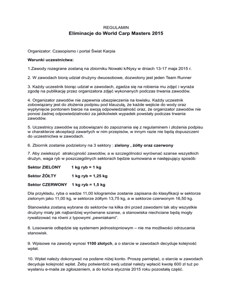 REGULAMIN Eliminacje do World Carp Masters 2015 Organizator: Czasopismo i portal Świat Karpia Warunki uczestnictwa: 1.Zawody rozegrane zostaną na zbiorniku Nowaki k/Nysy w dniach 13-17 maja 2015 r. 2. W zawodach biorą udział drużyny dwuosobowe, dozwolony jest jeden Team Runner 3. Każdy uczestnik biorąc udział w zawodach, zgadza się na robienia mu zdjęć i wyraża zgodę na publikację przez organizatora zdjęć wykonanych podczas trwania zawodów. 4. Organizator zawodów nie zapewnia ubezpieczenia na łowisku. Każdy uczestnik zobowiązany jest do złożenia podpisu pod klauzulą, że każde wejście do wody oraz wypłynięcie pontonem bierze na swoją odpowiedzialność oraz, że organizator zawodów nie ponosi żadnej odpowiedzialności za jakikolwiek wypadek powstały podczas trwania zawodów. 5. Uczestnicy zawodów są zobowiązani do zapoznania się z regulaminem i złożenia podpisu w charakterze akceptacji zawartych w nim przepisów, w innym razie nie będą dopuszczeni do uczestnictwa w zawodach. 6. Zbiornik zostanie podzielony na 3 sektory : zielony , żółty oraz czerwony 7. Aby zwiekszyć atrakcyjność zawodów, a w szczególności wyrównać szanse wszystkich drużyn, waga ryb w poszczególnych sektorach będzie sumowana w następujący sposób: Sektor ZIELONY 1 kg ryb = 1 kg Sektor ŻÓŁTY 1 kg ryb = 1,25 kg Sektor CZERWONY 1 kg ryb = 1,5 kg Dla przykładu, ryba o wadze 11,00 kilogramów zostanie zapisana do klasyfikacji w sektorze zielonym jako 11,00 kg, w sektorze żółtym 13,75 kg, a w sektorze czerwonym 16,50 kg. Stanowiska zostaną wybrane do sektorów na kilka dni przed zawodami tak aby wszystkie drużyny miały jak najbardziej wyrównane szanse, a stanowiska niechciane będą mogły rywalizować na równi z typowymi „pewniakami”. 8. Losowanie odbędzie się systemem jednostopniowym – nie ma możliwości odrzucania stanowisk. 9. Wpisowe na zawody wynosi 1100 złotych, a o starcie w zawodach decyduje kolejność wpłat. 10. Wpłat należy dokonywać na podane niżej konto. Proszę pamiętać, o starcie w zawodach decyduje kolejność wpłat. Żeby potwierdzić swój udział należy wpłacić kwotę 600 zł tuż po wysłaniu e-maila ze zgłoszeniem, a do końca stycznia 2015 roku pozostałą część. Świat Karpia nr konta: 33 1020 5242 0000 2802 0337 1101 z dopiskiem: Eliminacje WCM Postanowienia ogólne: 1. W zawodach liczą się karpie i amury powyżej 2 kg. 2. Obowiązuje konieczność posiadania podbieraka karpiowego oraz dużej maty karpiowej. 3. Organizatorzy i właściciel łowiska proszą o zachowanie ciszy oraz posprzątanie po sobie na stanowisku po zawodach. 4. Rozpalanie ognisk jest zabronione. 5. Po zajęciu stanowisk nie jest możliwe poruszanie się samochodami wokół jeziora. 6. Podczas trwania całych zawodów obowiązują zasady koleżeństwa i rywalizacji fair play. 7. Wszelkie spory rozstrzyga sędzia główny. W trakcie trwania imprezy organizator ma prawo zmienić regulamin oraz w przypadku niekorzystnych warunków atmosferycznych przerwać zawody. Zasady podczas trwania zawodów: 1.Drużyna składa się z dwóch zawodników (opcjonalnie team runner) Jeden team runner na drużynę. Team Runner nie może: holować oraz podbierać ryb. 2. Jedna drużyna może łowić maksymalnie na 4 wędki w obrębie własnego stanowiska. 3. Dozwolone jest wypływanie środkami pływającymi przez cała dobę w celu sondowania dna, stawiania markerów, nęcenia oraz wywożenia zestawów przez dwie osoby. 4. Każda jednostka pływająca obowiązkowo musi być wyposażona w kamizelkę ratunkową. Całkowity zakaz wypływania po spożyciu alkoholu. 5. W przypadku holu ryby, która wpłynie w stanowisko sąsiedniej drużyny, a ta nie zgłosi protestu ryba zostaje zaliczona do zawodów. 6. Dozwolone jest ustawienie maksymalnie dwóch markerów dla jednej drużyny. 7. W momencie opuszczenia stanowiska przez obydwóch zawodników, należy wyjąć zestawy z wody. 8. W razie jednakowej wagi złowionych karpi, o wyższej pozycji będzie decydować waga największej ryby, a w następnej kolejności większa ilość ryb. 9. Dozwolone jest stosowanie przynęt wyłącznie roślinnych. 10. Dozwolone jest łowienie tylko na zestawy gruntowe oraz zig-rig. 11. Ryba holowana przed sygnałem zakończenia zawodów musi być podebrana maksimum do 10 minut po sygnale - koniec zawodów. Procedura zgłaszania złowionych ryb: 1. Do czasu dotarcia sędziego z wagą, ryby muszą być przetrzymywane w workach karpiowych, po jednej sztuce w worku. 2. Ryby po zważeniu oraz sfotografowaniu zostają wypuszczone z powrotem do wody. 3. Ryby ważone są tylko i wyłącznie wagą dostarczoną przez organizatora. Nagrody: Pula wszystkich nagród to ponad 25.000 złotych Nagrodzone zostaną ekipy z miejsc 1, 2 oraz 3, a także Łowca pierwszej ryby Łowca największej ryby Łowca ostatniej ryby oraz zwycięzcy trzech sektorów (w przypadku gdy zwycięzca sektora zajmie miejsca od 1 do 3 w klasyfikacji generalnej, zwycięzcą sektora zostanie następna ekipa)
