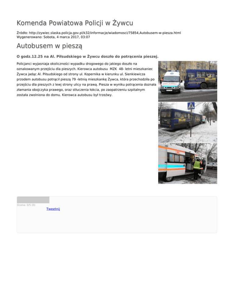 Komenda Powiatowa Policji w Żywcu Źródło: http://zywiec.slaska.policja.gov.pl/k32/informacje/wiadomosci/75854,Autobusem-w-piesza.html Wygenerowano: Sobota, 4 marca 2017, 03:07 Autobusem w pieszą O godz.12.25 na Al. Piłsudskiego w Żywcu doszło do potrącenia pieszej. Policjanci wyjasniaja okoliczności wypadku drogowego do jakiego doszło na oznakowanym przejściu dla pieszych. Kierowca autobusu MZK 48- letni mieszkaniec Żywca jadąc Al. Piłsudskiego od strony ul. Kopernika w kierunku ul. Sienkiewicza przodem autobusu potrącił pieszą 79 -letnią mieszkankę Żywca, która przechodziła po przejściu dla pieszych z lewj strony ulicy na prawą. Piesza w wyniku potrącenia doznała złamania obojczyka prawego, oraz stłuczenia łokcia, po zaopatrzeniu szpitalnym została zwolniona do domu. Kierowca autobusu był trzeźwy. Ocena: 0/5 (0) Tweetnij