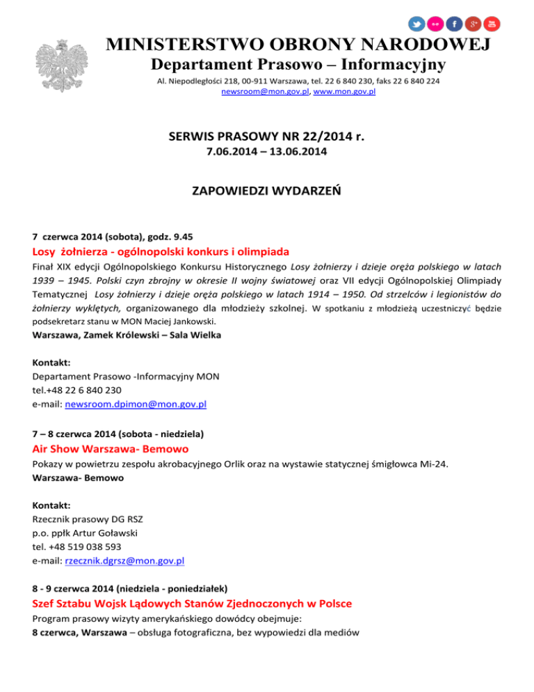 MINISTERSTWO OBRONY NARODOWEJ Departament Prasowo – Informacyjny Al. Niepodległości 218, 00-911 Warszawa, tel. 22 6 840 230, faks 22 6 840 224 [email protected], www.mon.gov.pl SERWIS PRASOWY NR 22/2014 r. 7.06.2014 – 13.06.2014 ZAPOWIEDZI WYDARZEO 7 czerwca 2014 (sobota), godz. 9.45 Losy żołnierza - ogólnopolski konkurs i olimpiada Finał XIX edycji Ogólnopolskiego Konkursu Historycznego Losy żołnierzy i dzieje oręża polskiego w latach 1939 – 1945. Polski czyn zbrojny w okresie II wojny światowej oraz VII edycji Ogólnopolskiej Olimpiady Tematycznej Losy żołnierzy i dzieje oręża polskiego w latach 1914 – 1950. Od strzelców i legionistów do żołnierzy wyklętych, organizowanego dla młodzieży szkolnej. W spotkaniu z młodzieżą uczestniczyd będzie podsekretarz stanu w MON Maciej Jankowski. Warszawa, Zamek Królewski – Sala Wielka Kontakt: Departament Prasowo -Informacyjny MON tel.+48 22 6 840 230 e-mail: [email protected] 7 – 8 czerwca 2014 (sobota - niedziela) Air Show Warszawa- Bemowo Pokazy w powietrzu zespołu akrobacyjnego Orlik oraz na wystawie statycznej śmigłowca Mi-24. Warszawa- Bemowo Kontakt: Rzecznik prasowy DG RSZ p.o. ppłk Artur Goławski tel. +48 519 038 593 e-mail: [email protected] 8 - 9 czerwca 2014 (niedziela - poniedziałek) Szef Sztabu Wojsk Lądowych Stanów Zjednoczonych w Polsce Program prasowy wizyty amerykaoskiego dowódcy obejmuje: 8 czerwca, Warszawa – obsługa fotograficzna, bez wypowiedzi dla mediów 14.40-15.00 – złożenie wieoców przed Grobem Nieznanego Żołnierza, zapoznanie z historią miejsca – delegacje amerykaoska i Dowództwa Generalnego Rodzajów Sił Zbrojnych. 15.10-16.50 – wizyta w Muzeum Powstania Warszawskiego - delegacje amerykaoska i Dowództwa Generalnego RSZ; fotografowanie przez 5 pierwszych minut wizyty. 9 czerwca, Warszawa 7.50-8.20 – oficjalne powitanie w DG RSZ, odznaczenie generała Raymonda Odierno przyznanym przez Prezydenta RP Krzyżem Komandorskim Orderu Zasługi RP. Po zakooczeniu uroczystości oświadczenia dla prasy. Drawsko Pomorskie 12.20-13.50 – wizyta na poligonie, pokaz wspólnego szkolenia polskich i amerykaoskich spadochroniarzy na pasie taktycznym Ziemsko, briefing prasowy. Kontakt i akredytacje: Zgłoszenia akredytacyjne na powitanie generała Odierno w Dowództwie Generalnym RSZ do godz. 18.00 w niedzielę (8 czerwca) przyjmuje mjr Michał Romaoczuk: [email protected] , tel. 602 173 866. Zainteresowane media (tylko obywatele polscy) prosimy o przyjazd w godzinach 7.15-7.45. Zgłoszenia akredytacyjne na pobyt generała Odierno na poligonie w Drawsku Pomorskim (pas taktyczny Ziemsko) do godz. 18.00 w niedzielę (8 czerwca) przyjmuje kpt. Marcin Gil, [email protected] tel. 693 357 110. Zbiórka mediów przed komendą poligonu w Olesznie 9 czerwca do godziny 11.00. 9 czerwca 2014 (poniedziałek), godz. 10.00 Prezydent RP i minister obrony w Świętoszowie Prezydent Bronisław Komorowski i minister obrony narodowej Tomasz Siemoniak przebywad będą w 10 Brygadzie Kawalerii Pancernej w Świętoszowie, gdzie wezmą udział w uroczystości powitania żołnierzy XIV zmiany PKW Afganistan. Świętoszów, ul. Kościelna 2 Kontakt: Szczegółowych informacji udziela oficer prasowy 11 Lubuskiej Dywizji Kawalerii Pancernej mjr Artur Pinkowski, tel. (68) 475 80 08, 695 858 042. Wejście akredytowanych dziennikarzy do sektora prasowego w godz. 8.30 – 9.00 (od strony ul. Kościelnej). Instalacja wozów transmisyjnych do godz. 8.00. 9 – 11 czerwca 2014 (poniedziałek - środa) Zawody w 12DZ Mistrzostwa 12 Dywizji Zmechanizowanej w czwórboju wojskowym. Słupsk Kontakt: 7BOW kpt. Karolina Krzewina Hyc tel. 721 890 408 e-mail: [email protected] 9 – 13 czerwca 2014 (poniedziałek - piątek) „Sprawni jak żołnierze” Finał Centralnych XXXVII zawodów sprawnościowo – obronnych dla młodzieży „Sprawni jak żołnierze”. Zegrze Kontakt: CSŁiI kpt. Krzysztof Baran tel. 722 380 054 e-mail: [email protected] 10 czerwca 2014 (wtorek), godz. 14.00 Wszechnica Bezpieczeostwa AON W ramach Wszechnicy Bezpieczeostwa Akademii Obrony Narodowej odbędzie się spotkanie i debata z udziałem Władysława Frasyniuka na temat: Polska – 25 lat Wolności. Próba bilansu. Warszawa, AON ( al. gen. A. Chruściela) Kontakt: Rzecznik prasowy AON Magdalena Rochnowska tel. 608 023 401 e-mail: [email protected] 10 - 13 czerwca 2014 (wtorek - piątek) Francuzi z wizytą u logistyków Wizyta delegacji z Centrum Szkolenia Logistyki – Bourges (Francja) w Centrum Szkolenia Logistyki. Grudziądz Kontakt: CSLog Grudziądz kpt. Przemysław Grzybowski tel. 727 012 230, e-mail: [email protected] 10 czerwca 2014 (worek), godz. 10.00 – 12.00 CWIX 2014 – testy interoperacyjności – Media Day W JFTC w Bydgoszczy przewidziano „Dzieo dla mediów”. Program obejmuje briefing z wysokim rangą przedstawicielem dowództwa NATO, zwiedzanie wyznaczonego rejonu dwiczenia oraz wywiady z uczestnikami dwiczenia. Bydgoszcz Kontakt: ppłk Christian von Platen tel. . 69 542 74 25 e-mail: [email protected] 11 – 12 czerwca 2014 (środa – czwartek) Szefowie sztabów generalnych V4 w Budapeszcie Szef Sztabu Generalnego WP gen. broni Mieczysław Gocuł weźmie udział w spotkaniu szefów sztabów generalnych państw Grupy Wyszehradzkiej. Budapeszt, Węgry Kontakt: Rzecznik prasowy SG WP płk Tomasz Szulejko tel. 22 6 870 807, kom. 602 431 294, e-mail: [email protected] 12 czerwca 2014 (czwartek) Zapraszamy do zwiedzania! Dzieo otwartych koszar w 4 pułku przeciwlotniczym. Czerwieosk Kontakt: 4pplot kpt. Paweł Kierach tel. 785 208 659 e-mail: [email protected] 12 – 30 czerwca 2014 (czwartek - poniedziałek) „BIEBRZA-14” Trening sztabowy pk. „BIEBRZA-14”. Giżycko/Orzysz Kontakt: 15BZ kpt. Dariusz Guzenda tel. 605 201 371, e-mail: [email protected] 13 czerwca 2014 (piątek), godz. 13.00 Święto Żandarmerii Wojskowej Komendant Główny Żandarmerii Wojskowej gen. dyw. dr Mirosław Rozmus zaprasza byłych i 