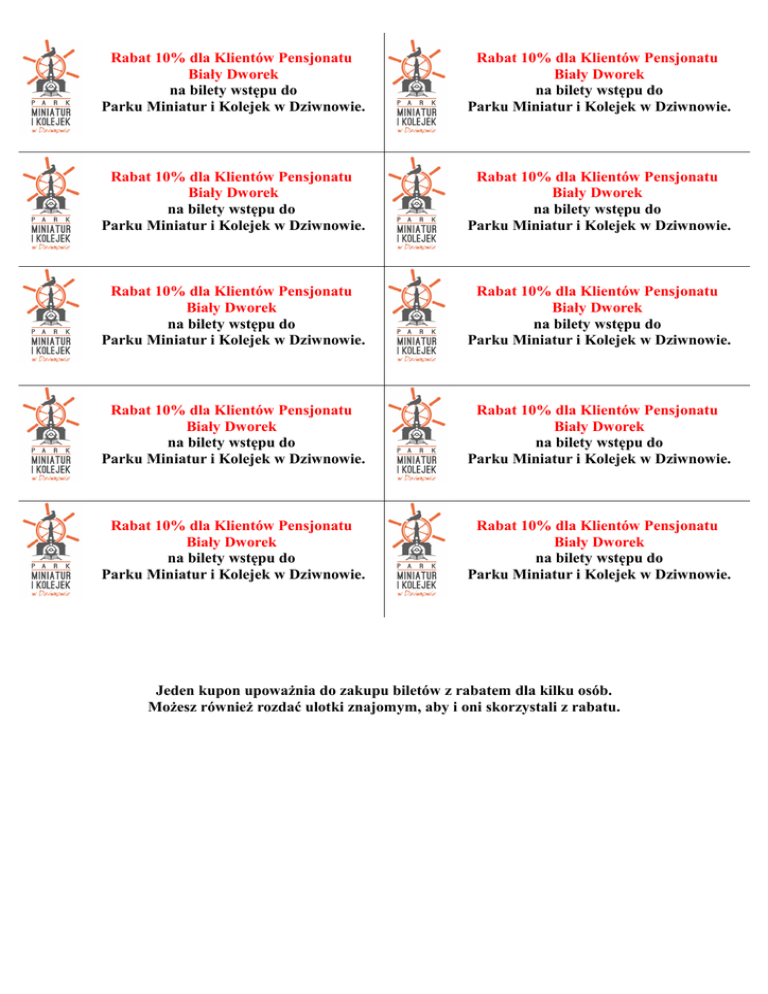 Rabat 10% dla Klientów Pensjonatu Biały Dworek na bilety wstępu do Parku Miniatur i Kolejek w Dziwnowie. Rabat 10% dla Klientów Pensjonatu Biały Dworek na bilety wstępu do Parku Miniatur i Kolejek w Dziwnowie. Rabat 10% dla Klientów Pensjonatu Biały Dworek na bilety wstępu do Parku Miniatur i Kolejek w Dziwnowie. Rabat 10% dla Klientów Pensjonatu Biały Dworek na bilety wstępu do Parku Miniatur i Kolejek w Dziwnowie. Rabat 10% dla Klientów Pensjonatu Biały Dworek na bilety wstępu do Parku Miniatur i Kolejek w Dziwnowie. Rabat 10% dla Klientów Pensjonatu Biały Dworek na bilety wstępu do Parku Miniatur i Kolejek w Dziwnowie. Rabat 10% dla Klientów Pensjonatu Biały Dworek na bilety wstępu do Parku Miniatur i Kolejek w Dziwnowie. Rabat 10% dla Klientów Pensjonatu Biały Dworek na bilety wstępu do Parku Miniatur i Kolejek w Dziwnowie. Rabat 10% dla Klientów Pensjonatu Biały Dworek na bilety wstępu do Parku Miniatur i Kolejek w Dziwnowie. Rabat 10% dla Klientów Pensjonatu Biały Dworek na bilety wstępu do Parku Miniatur i Kolejek w Dziwnowie. Jeden kupon upoważnia do zakupu biletów z rabatem dla kilku osób. Możesz również rozdać ulotki znajomym, aby i oni skorzystali z rabatu.