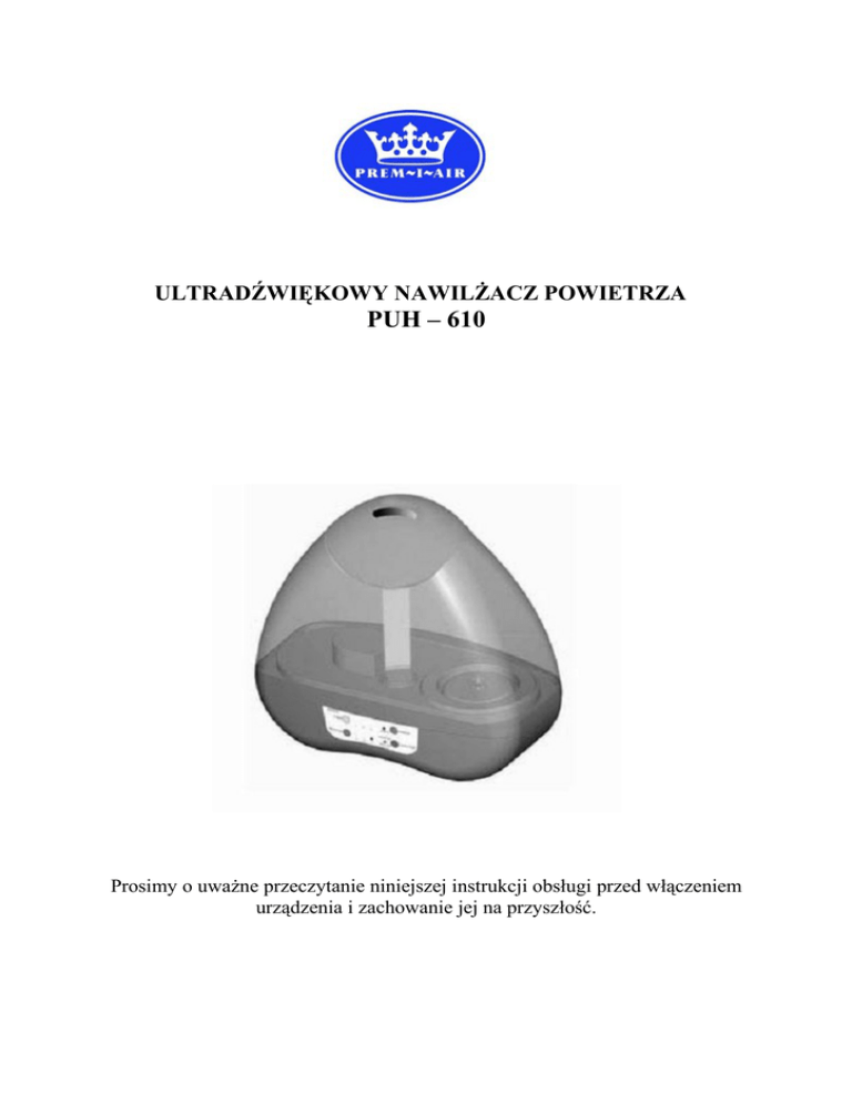 ULTRADŹWIĘKOWY NAWILŻACZ POWIETRZA PUH – 610 Prosimy o uważne przeczytanie niniejszej instrukcji obsługi przed włączeniem urządzenia i zachowanie jej na przyszłość. ZASADY BEZPIECZEŃSTWA W czasie używania urządzeń elektrycznych należy przestrzegać poniższych zaleceń. 1. Sprawdź czy podana na tabliczce znamionowej urządzenia wartość napięcia prądu elektrycznego jest zgodna z wartością w używanej sieci elektrycznej. 2. Pracujące urządzenie powinno być pod stałym nadzorem szczególnie jeśli w pobliżu znajdują się dzieci lub zwierzęta. 3. Nie wolno dawać dzieciom do zabawy elementów opakowania szczególnie torebek plastikowych. 4. Nie wolno używać urządzenia z uszkodzoną wtyczką lub kablem przyłączeniowym. Ewentualną ich wymianę należy powierzyć wykwalifikowanemu personelowi. 5. Ten produkt przeznaczony jest tylko do użytku domowego. 6. Zawsze odłącz urządzenie od prądu i opróżnij zbiornik wody przed przemieszczaniem urządzenia. 7. Nigdy nie odłączaj urządzenia od gniazdka pociągając za przewód przyłączeniowy. 8. Nie wolno używać nawilżacza w pomieszczeniach gdzie znajdują się paliwa, farby lub inne substancje łatwopalne. 9. Nie wolno użytkować nawilżacza w niebezpiecznym otoczeniu. 10.Nie umieszczać urządzenia w pobliżu otwartego ognia, gorących urządzeń lub powierzchni. 11.Nigdy nie używaj urządzenia w pobliżu otwartych zbiorników wody. 12.Kabel elektryczny nie może być narażony na uszkodzenie przez ostre krawędzie. 13.Zawsze powinien być zapewniony swobodny przepływ powietrza wokół urządzenia. 14.Używanie akcesoriów lub materiałów eksploatacyjnych nie zalecanych przez producenta może unieważnić gwarancję. 15.Nie jest dozwolona ingerencja w wewnętrzne struktury urządzenia przez osoby nieuprawnione. 16.Urządzenia nie wolno polewać wodą. 17.Zabronione jest zanurzanie urządzenia w wodzie. 18. Ze względu na różną jakość wody wodociągowej, zalecane jest stosowanie wody demineralizowanej lub przegotowanej. Ograniczy to osadzanie się kamienia wodnego wewnątrz urządzenia. Nie używaj nawilżacza w pomieszczeniach ze złą wentylacją. Zbyt duża ilość wilgoci w pomieszczeniu może spowodować szkody. Urządzenie powinno stać w miejscu niedostępnym dla dzieci. Nigdy nie kieruj strumienia pary na urządzenia elektroniczne, ściany , meble lub inne materiały nieodporne na wilgoć. Nigdy nie dodawaj do wody olejków eterycznych lub innych substancji zapachowych. OPIS NAWILŻACZA 1. Pokrywa górna z wylotem pary 2. Zbiornik wody 3. Panel kontrolno – sterujący 4. 5. Kanał wody 6. Dystrybutor pary 7. Pokrywka zbiornika wody (zamyka otwór do nalewania wody) 8. Uchwyt PODSTAWOWE FUNKCJE 1. Specjalna konstrukcja i użyte materiały zapobiegają nadmiernemu rozwojowi grzybów i bakterii w wilgotnym środowisku 2. Urządzenie wyposażone jest w automatyczny wyłącznik i sygnalizację pustego zbiornika. 3. Wbudowany jonizator neutralizuje kurz i bakterie zawarte w powietrzu. INSTRUKCJA UŻYTKOWANIA 1. Wyjmij zbiornik wody (2) i odwróć go do góry. 2. Odkręć pokrywkę (6), napełnij zbiornik zimną wodą, nigdy gorącą, zakręć pokrywkę i umieść zbiornik na miejsce. 3. Sprawdź czy otwór pokrywy górnej jest skierowany do „ przodu” urządzenia. 4. Aby włączyć urządzenie wciśnij przycisk ON/OFF. Aby wyłączyć w ciśnij przycisk ponownie. 5. Przyciskiem MODE możesz wybrać trzy tryby pracy urządzenia: TRYB I – urządzenie wytwarza parę ciągle, TRYB II – para wytwarzana jest przez 1 minutę następną minutę urządzenie pauzuje; TRYB III – para wytwarzana jest przez 1 minutę przerwa trwa 3 minuty. Wybór poszczególnych trybów sygnalizują odpowiednio palące się lampki kontrolne. W czasie pauzy para nie jest wytwarzana. 6. Nawilżacz wyposażony jest w zegar TIMER umożliwiający zaprogramowanie pracy urządzenia od 1 do 7 godzin w przedziałach 1-no godzinnych. Zaprogramowany czas sygnalizują kontrolki oznaczone 1, 2, 4, suma cyfr palących się lampek daje ilość zaprogramowanych godzi pracy. Po tym czasie urządzenie automatycznie wyłączy się. 7. Wciśnięcie przycisku jonizatora ION spowoduje wytwarzanie jonów ujemnych i mieszanie ich z parą. Aktywność tej funkcji sygnalizuje lampka. 8. W momencie zużycia zapasu wody nawilżacz sygnalizuje to dźwiękiem i zapaleniem się lampki TANK EMPTY. Urządzenie należy wyłączyć przyciskiem oraz wyjąć wtyczkę z kontaktu. Teraz można wyjąć zbiornik i napełnić go zimną wodą. Ponownie uruchomić urządzenie. DANE TECHNICZNE Wydajność pary: > 300ml/h Pojemność zbiornika wody: 4,5l Napięcie zasilania: 230V ; 50Hz Pobór mocy: 45W Wymiary: 300 x 160 x 307 mm UWAGA !!! W nie używanym urządzeniu nie wolno pozostawiać wody, może być to źródłem bakterii i kamienia i zanieczyścić wnętrze nawilżacza. Twój nawilżacz wymaga codziennego czyszczenia zbiornika wody oraz cotygodniowego czyszczenia całego urządzenia. CODZIENNA KONSERWACJA 1. Odłącz nawilżacz od gniazdka elektrycznego 2. Opróżnij zbiornik wody i przepłucz go czystą wodą, oczyść go miękką ściereczką lub szczoteczką z trwałych zanieczyszczeń. CO TYDZIEŃ 1. Odłącz urządzenie od gniazda elektrycznego 2. Opróżnij zbiornik wody. Zdezynfekuj zbiornik wody. W tym celu napełnij go do połowy wodą ,dodaj do niej ok. 5ml środka dezynfekującego. Zamknij zbiornik pokrywą. Co kilka minut intensywnie mieszać wodę w zbiorniku. Po 20-tu minutach opróżnić zbiornik i klika razy przepłukać go czystą woda. 3. Oczyścić kanał wody miękką ściereczką. 4. Miękką szczoteczką oczyść dookoła dystrybutor pary. Jeśli produkt ma być przez dłuższy czas nie używany to po oczyszczeniu należy go wysuszyć i zabezpieczyć przed zabrudzeniem. Jeśli nawilżacz nie pracuje poprawnie to przed zwróceniem się do serwisu prosimy sprawdzić: OBJAW Przyczyna Środek zaradczy Nawilżacz nie startuje Nie j