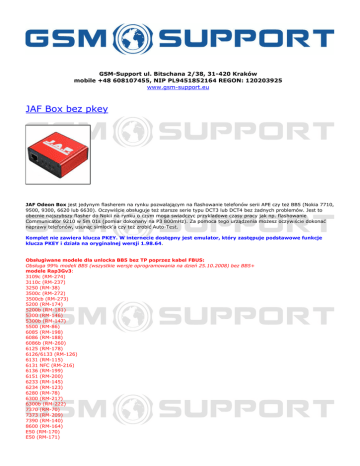 GSM-Support ul. Bitschana 2/38, 31-420 Kraków mobile +48 608107455, NIP PL9451852164 REGON: 120203925 www.gsm-support.eu JAF Box bez pkey JAF Odeon Box jest jedynym flasherem na rynku pozwalającym na flashowanie telefonów serii APE czy też BB5 (Nokia 7710, 9500, 9300, 6620 lub 6630). Oczywiście obsługuje też starsze serie typu DCT3 lub DCT4 bez żadnych problemów. Jest to obecnie najszybszy flasher do Nokii na rynku o czym moga swiadczyc przykladowe czasy pracy jak np. flashowanie Communicator 9210 w 5m 01s (pomiar dokonany na P3 800mHz). Za pomoca tego urządzenia możesz oczywiście dokonać naprawy telefonów, usunąc simlock'a czy też zrobić Auto-Test. Komplet nie zawiera klucza PKEY. W internecie dostępny jest emulator, który zastępuje podstawowe funkcje klucza PKEY i działa na oryginalnej wersji 1.98.64. Obsługiwane modele dla unlocka BB5 bez TP poprzez kabel FBUS: Obsługa 99% modeli BB5 (wszystkie wersje oprogramowania na dzień 25.10.2008) bez BB5+ modele Rap3Gv3: 3109c (RM-274) 3110c (RM-237) 3250 (RM-38) 3500c (RM-272) 3500cb (RM-273) 5200 (RM-174) 5200b (RM-181) 5300 (RM-146) 5300b (RM-147) 5500 (RM-86) 6085 (RM-198) 6086 (RM-188) 6086b (RM-260) 6125 (RM-178) 6126/6133 (RM-126) 6131 (RM-115) 6131 NFC (RM-216) 6136 (RM-199) 6151 (RM-200) 6233 (RM-145) 6234 (RM-123) 6280 (RM-78) 6300 (RM-217) 6300b (RM-222) 7370 (RM-70) 7373 (RM-209) 7390 (RM-140) 8600 (RM-164) E50 (RM-170) E50 (RM-171) E50 (RM-172) E61 (RM-89) E61i (RM-227) E62 (RM-88) E65 (RM-208) N73-1 (RM-133) N73-5 (RM-132) N75 (RM-128) N77 (RM-194) N80-1 (RM-92) N80-3 (RM-91) N92 (RM-100) modele RAP3GV2: 6630 (RM-1) 6680 (RM-36) 6681 (RM-57) 6682 (RM-58) N70 (RM-84) N70-5 (RM-99) N71 (RM-67) N90 (RM-42) N91-1 (RM-43) N91-8GB (RM-43) N91-5 (RM-158) N93 (RM-55) modele RAPIDO: N95 (RM-159) N95 (RM-245) N95 (RM-160) E90 (RA-6) a także: 5700 (RM-230) 5700 (RM-302) 6290 (RM-176) N76 (RM-135) N76 (RM-149) Obsługiwane modele: DCT3: 2100, 3210, 3310, 3315, 3330, 3350, 3390, 3410, 5110, 5110i, 5130, 5138, 5190, 5210, 5510, 6090, 6110, 6130, 6138, 6150, 6190, 6210, 6250, 7110, 8210, 8250, 8290, 8810, 8850, 8855, 8890, 9110 Funkcje dla DCT3: - wgranie flasha - zmiana języka/oprogramowania - odblokowanie - naprawa/odbudowa IMEI'a - reset ustawień - reset kodu zabezpieczającego - odczyt zapis eepromu (pmm) DCT4: DTE-1_D211,1100, 1100a, 1100b, 1220, 1260, 1261, 2112, 2260, 2261, 2270, 2275, 2280, 2285, 2300, 2300a, 2600, 2600cn, 2650, 2651, 3100, 3100b, 3105, 3108, 3120, 3125, 3200, 3200b, 3205, 3220, 3220b, 3300, 3300b, 3320, 3360, 3510 , 3510i/3530, 3520, 3560, 3585, 3585i, 3586i, 3570i, 3590, 3595, 3650, 3660, 5100, 5100a, 5140, 6011i, 6012, 6015, 6016, 6019, 6020, 6020b, 6100, 6108, 6170, 6200, 6220, 6225, 6230, 6230b, 6255, 6256, 6310, 6310i, 6340, 6340i, 6360, 6370, 6385, 6500, 6510, 6560, 6585, 6590, 6600, 6610, 6610i, 6620, 6650, 6670, 6800, 6800a, 6810, 6820, 7200, 7210, 7250, 7250i, 7260, 7270, 7280, 7600, 7610, 7650, 7710, 8270, 8280, 8310, 8390, 8910, 8910i, 9300, 9500 DCT-4 WD2: N-Gage, N-Gage QD, N-Gage QDa, 3230, 3600, 3620, 3650, 3660, 6260, 6600, 6670, 6670b, 7610, 7610b, 7650 Funkcje dla DCT4, WD2: - zmiana oprogramowania - zmiena pakietu językowego - odblokowanie - zablokowanie telefonu flash/naprawa Bluetooth odbudowa numeru IMEI odczyt/zapis pmm pełny reset ustawień telefonu naprawa błędów systemowych format obszaru użytkownika naprawa Contact service (jesli błąd programowy zapis ustawień użytkownika Auto-test telefonu DCT-L: 9290, 9210, 9210i (communicator) Funkcje dla DCT-L: - zmiana oprogramowania - zmiena pakietu językowego - odblokowanie - ustawienie FAID - odbudowa numeru IMEI - pełny reset ustawień telefonu BB5: 7710, 9500, 9300, 6620, 6630, N70, N73, N93, N90, N81, 5500 i inne.... Funkcje dla BB5: - flashowanie (zmiana oprogramowania i języków) - wgrywanie CNT i PPM Przykladowe predkosci flashowania (pelny flash): - 3650 - 7m 30s - 6600 - 8m 40s - 6230 - 5m 15s - 7610 -10m 24s - 9210 - 5m 01s Mierzone na P3 800mHz Teraz do każdego JAFA dodawany jest dodatek do obsługi telefonów Philips ! Alcatel OT155, Alcatel OT156, Alcatel OT355, Azalis 238, Azalis 268, Fisio 120, Fisio 121, Fisio 311, Fisio 316, Fisio 620, Fisio 625, Fisio 820, Fisio 822, Fisio 825, Fisio 826, Genie 2000, Ozeo, Philips 160, Philips 162, Philips 189, Philips 289, Philips 330, Philips 350, Philips 355, Philips 362, Philips 530, Philips 535, Philips 630, Philips 636, Philips 639, Philips 650, Philips 655, Philips 659, Philips 755, Philips 760, Philips 855, Philips 859, Siemens SF65, Xenium, Xenium 9@98, Xenium 9@9a, Xenium 9@9c, Xenium 9@9d, Xenium 9@9e, Xenium 9@9i, Xenium 9@9++ DO KORZYSTANIA Z JAF BOX WYMAGANY JEST SYSTEM OPERACYJNY XP LUB 2000. Na to urządzenie producent udziela 6 miesięcy gwarancji W związku z przypadkami uszkadzania firmware'u boxa JAF przez aplikację MXKEY - zalecamy korzystanie z interfejsu UFS do MXKEY , natomiast JAF BOX z aplikacjami od JAFa. Sytuacja ta spowodowana jest 'wojną' producentów JAF (Raskal) i MX-KEY (Manole). Objawem uszkodzenia boxa przez mx-key jest brak możliwości zmiany firmware'u przez tzw updater. Jedyną opcją jest późniejsza naprawa procesora ATMEGA przez ISP. Uszkodzenia firmware'u boxa objawiające się jw. - NIE PODLEGAJĄ GWARANCJI. ©2012 www.gsm-support.eu Opis ten nie stanowi oferty w rozumieniu Kodeksu Cywilnego. GSM-Support zastrzega sobie prawo do możliwych błędów w opisie produktu. Prosimy o weryfikację z Państwa strony, a w razie wątpliwości o kontakt. GSM-Support ul. Bitschana 2/38 31-420 Kraków POLSKA tel. 608107455 e-mail: [email protected] Powered by TCPDF (www.tcpdf.org)
