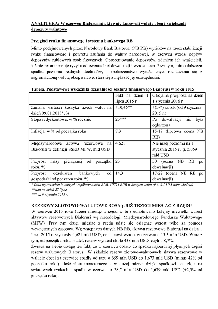 ANALITYKA: W czerwcu Białorusini aktywnie kupowali walutę obcą i zwiększali depozyty walutowe Przegląd rynku finansowego i systemu bankowego RB Mimo podejmowanych przez Narodowy Bank Białorusi (NB RB) wysiłków na rzecz stabilizacji rynku finansowego i powrotu zaufania do waluty narodowej, w czerwcu wzrósł odpływ depozytów rublowych osób fizycznych. Oprocentowanie depozytów, zdaniem ich właścicieli, już nie rekompensuje ryzyka od ewentualnej dewaluacji i wzrostu cen. Przy tym, mimo dalszego spadku poziomu realnych dochodów, - społeczeństwo wyraża chęci rozstawania się z nagromadzoną walutą obcą, a nawet stara się zwiększać jej oszczędności. Tabela. Podstawowe wskaźniki działalności sektora finansowego Białorusi w roku 2015 Fakt na dzień 1 Oficjalna prognoza na dzień lipca 2015 r. 1 stycznia 2016 r. Zmiana wartości koszyka trzech walut na +10,46** +(3-7) za rok (od 9 stycznia dzień 09.01.2015*, % 2015 r.) Stopa redyskontowa, w % rocznie 25*** Po dewaluacji nie była ogłoszona Inflacja, w % od początku roku 7,3 15-18 (lipcowa ocena NB RB) Międzynarodowe aktywa rezerwowe na 4,621 Nie niżej poziomu na 1 Białorusi w definicji SSRD MFW, mld USD stycznia 2015 r., tj. 5,059 mld USD Przyrost masy pieniężnej od początku 23 30 (ocena NB RB po roku, % dewaluacji) Przyrost oczekiwań bankowych od 14,3 17-22 (ocena NB RB po gospodarki od początku roku, % dewaluacji) * Data wprowadzenia nowych współczynników RUB, USD i EUR w koszyku walut (0,4, 0,3 i 0,3 odpowiednio) **stan na dzień 27 lipca *** od 9 stycznia 2015 r. REZERWY ZŁOTOWO-WALUTOWE ROSNĄ JUŻ TRZECI MIESIĄC Z RZĘDU W czerwcu 2015 roku (trzeci miesiąc z rzędu w br.) odnotowano kolejny niewielki wzrost aktywów rezerwowych Białorusi wg metodologii Międzynarodowego Funduszu Walutowego (MFW). Przy tym drugi miesiąc z rzędu udaje się osiągnąć wzrost tylko za pomocą wewnętrznych zasobów. Wg wstępnych danych NB RB, aktywa rezerwowe Białorusi na dzień 1 lipca 2015 r. wyniosły 4,621 mld USD, co stanowi wzrost w czerwcu o 13,3 mln USD. Wraz z tym, od początku roku spadek rezerw wyniósł około 438 mln USD, czyli o 8,7%. Zwraca na siebie uwagę ten fakt, że w czerwcu doszło do spadku najbardziej płynnych części rezerw walutowych Białorusi. W składzie rezerw złotowo-walutowych aktywa rezerwowe w walucie obcej za czerwiec spadły od razu o 659 mln USD do 1,673 mld USD (minus 42% od początku roku), ilość złota monetarnego - w dużej mierze dzięki spadkowi cen złota na światowych rynkach - spadła w czerwcu o 28,7 mln USD do 1,679 mld USD (+2,3% od początku roku). Z kolei największy wzrost w ubiegłym miesiącu wykazały „inne aktywa” – najbardziej nieprzejrzysta część rezerw złotowo-walutowych. Tylko w czerwcu wzrosły one o 695 mln USD do 745,2 mln USD. Na początku roku inne aktywa w składzie rezerw złotowo-walutowych stanowiły około 0,5 mln USD. LUDNOŚĆ ZMNIEJSZYŁA SPRZEDAŻ WALUT NETTO DO MINIMUM Wg regulatora, sprzedaż walut obcych netto (transakcje gotówkowe oraz bezgotówkowe) przez ludność w pierwszym półroczu 2015 roku wyniosła 689,1 mln USD, w tym 150,6 mln USD w maju i 249,7 mln USD w kwietniu. Przy tym należy zauważyć, że jeżeli sprzedaż walut obcych osób fizycznych w czerwcu praktycznie nie zmieniła się w porównaniu z majem 2015 roku (664,6 mln USD przeciwko 655,7 mln USD), zakup waluty obcej (transakcje gotówkowe oraz bezgotówkowe) gwałtownie wzrósł, osiągając poziom 656,5 mln USD w porównaniu do 505,1 mln USD miesiąc wcześniej (wzrost o 30%). Wzrost popytu na walutę obcą ze strony ludności można połączyć z rozpoczęciem sezonu wakacyjnego, spadkiem stóp procentowych na depozyty rublowe, a także z niepewnością polityki NB RB w części tworzenia kursu wymiany. Po przejściu w handlu walutami na BGPW w tryb podwójnej aukcji dla wielu ciężko jest spokojnie patrzeć na wahania kursu waluty krajowej w znacznie poszerzonym zakresie. Przy tym, dla szerokiego grona ludzi również nie jest do końca jasne, jak waluta może się umacniać, gdy gospodarka przeżywa kryzys, eksport spadł o ponad jedną czwartą, a rezerwy uzupełniane są głównie za pomocą kredytów. Osoby prawne (rezydenci) na krajowym rynku w czerwcu kupiły 17,7 mln USD netto po tym jak miesiąc wcześniej ta kwota wynosiła 91,9 mln USD. Jednak od początku roku jeszcze utrzymuje się oferta netto walut obcych ze strony przedsiębiorstw: w okresie styczeń-czerwiec ich sprzedaż waluty na BGPW i na rynku pozagiełdowym była o 62,6 mln USD wyższa, niż zakup. ZWIĘKSZA SIĘ UDZIAŁ WALUTOWY MASY PIENIĘŻNEJ Nieufność Białorusinów do waluty krajowej przejawia się również we wzroście udziału walutowego w masie pieniężnej. Na koniec czerwca wzrósł on jeszcze o 0,6 punktu procentowego i wyniósł 65,9% na dzień 1 lipca (+3,8 punktu procentowego od początku roku). Najbardziej zauważalny wpływ na strukturę walutową masy pieniężnej w czerwcu miały operacje ludności z terminowymi rublowymi i walutowymi depozytami. Według NB RB, w czerwcu terminowe depozyty ludności spadły o 2,1%, lub o 750,3 mld BYR do 34,3 bln BYR. Jednak od początku roku odnotowano wzrost terminowych rublowych depozytów o 25,9%. Z kolei walutowe depozyty po niewielkim spadku w maju, w czerwcu wykazały wzrost o 1,8%, lub o 137,5 mln USD. Od początku roku terminowe walutowe depozyty ludności wzrosły o 1,9%. Na dynamikę terminowych depozytów ludności znaczący wpływ ma spadek stóp procentowych rublowych depozytów w ostatnim czasie. Według regulatora, średnie oprocentowanie nowych terminowych depozytów bankowych w walucie krajowej dla osób fizycznych wyniosły w czerwcu br. 26,5% rocznie, w porównaniu z 28% w maju i 36,5% w kwietniu br. Z kolei oprocentowanie nowych terminowych depozytów walutowych dla osób fizycznych również spadło, osiągając w czerwcu 5,6% wobec 6,3% w maju i 6,1% w kwietniu. Spadek stóp procentowych dla