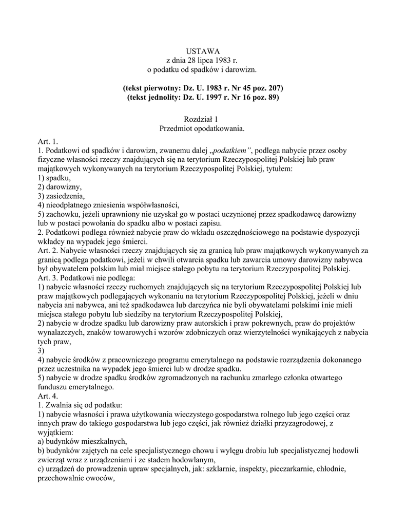 USTAWA z dnia 28 lipca 1983 r. o podatku od spadków i darowizn. (tekst pierwotny: Dz. U. 1983 r. Nr 45 poz. 207) (tekst jednolity: Dz. U. 1997 r. Nr 16 poz. 89) Rozdział 1 Przedmiot opodatkowania. Art. 1. 1. Podatkowi od spadków i darowizn, zwanemu dalej „podatkiem”, podlega nabycie przez osoby fizyczne własności rzeczy znajdujących się na terytorium Rzeczypospolitej Polskiej lub praw majątkowych wykonywanych na terytorium Rzeczypospolitej Polskiej, tytułem: 1) spadku, 2) darowizny, 3) zasiedzenia, 4) nieodpłatnego zniesienia współwłasności, 5) zachowku, jeżeli uprawniony nie uzyskał go w postaci uczynionej przez spadkodawcę darowizny lub w postaci powołania do spadku albo w postaci zapisu. 2. Podatkowi podlega również nabycie praw do wkładu oszczędnościowego na podstawie dyspozycji wkładcy na wypadek jego śmierci. Art. 2. Nabycie własności rzeczy znajdujących się za granicą lub praw majątkowych wykonywanych za granicą podlega podatkowi, jeżeli w chwili otwarcia spadku lub zawarcia umowy darowizny nabywca był obywatelem polskim lub miał miejsce stałego pobytu na terytorium Rzeczypospolitej Polskiej. Art. 3. Podatkowi nie podlega: 1) nabycie własności rzeczy ruchomych znajdujących się na terytorium Rzeczypospolitej Polskiej lub praw majątkowych podlegających wykonaniu na terytorium Rzeczypospolitej Polskiej, jeżeli w dniu nabycia ani nabywca, ani też spadkodawca lub darczyńca nie byli obywatelami polskimi i nie mieli miejsca stałego pobytu lub siedziby na terytorium Rzeczypospolitej Polskiej, 2) nabycie w drodze spadku lub darowizny praw autorskich i praw pokrewnych, praw do projektów wynalazczych, znaków towarowych i wzorów zdobniczych oraz wierzytelności wynikających z nabycia tych praw, 3) 4) nabycie środków z pracowniczego programu emerytalnego na podstawie rozrządzenia dokonanego przez uczestnika na wypadek jego śmierci lub w drodze spadku. 5) nabycie w drodze spadku środków zgromadzonych na rachunku zmarłego członka otwartego funduszu emerytalnego. Art. 4. 1. Zwalnia się od podatku: 1) nabycie własności i prawa użytkowania wieczystego gospodarstwa rolnego lub jego części oraz innych praw do takiego gospodarstwa lub jego części, jak również działki przyzagrodowej, z wyjątkiem: a) budynków mieszkalnych, b) budynków zajętych na cele specjalistycznego chowu i wylęgu drobiu lub specjalistycznej hodowli zwierząt wraz z urządzeniami i ze stadem hodowlanym, c) urządzeń do prowadzenia upraw specjalnych, jak: szklarnie, inspekty, pieczarkarnie, chłodnie, przechowalnie owoców, d) 2) nabycie w drodze spadku budynków mieszkalnych nadanych na podstawie przepisów o osadnictwie rolnym, 3) nabycie praw do wkładów w rolniczej spółdzielni produkcyjnej lub w spółdzielni kółek rolniczych, 4) nabycie własności budynków gospodarczych służących bezpośrednio produkcji rolniczej prowadzonej na użytkach rolnych o powierzchni do 1 ha, a nabywcą jest osoba prowadząca gospodarstwo rolne zaliczona do I grupy podatkowej, 5) nabycie w drodze darowizny pieniędzy lub innych rzeczy przez osobę zaliczoną do I grupy podatkowej w wysokości nieprzekraczającej 9 637 zł od jednego darczyńcy, a od wielu darczyńców łącznie nie więcej niż 19 274 zł w okresie 5 lat od daty pierwszej darowizny, jeżeli pieniądze te lub rzeczy obdarowany przeznaczy na wkład budowlany lub mieszkaniowy do spółdzielni, budowę lokalu w małym domu mieszkalnym, budowę domu jednorodzinnego albo nabycie lokalu mieszkalnego stanowiącego odrębną nieruchomość, 6) nabycie w drodze darowizny praw do rachunku oszczędnościowo-kredytowego przez małżonka, wstępnych, zstępnych, rodzeństwo oraz osobę pozostającą faktycznie we wspólnym pożyciu małżeńskim z posiadaczem rachunku oszczędnościowo-kredytowego w kasie mieszkaniowej, pod warunkiem przeznaczenia środków zgromadzonych na tym rachunku na cele mieszkaniowe, 7) 8) nabycie własności fizycznie wydzielonych części nieruchomości w drodze zasiedzenia przez osoby będące współwłaścicielami ułamkowych części nieruchomości - do wysokości udziału we współwłasności, 9) nabycie w drodze spadku: a) przez osoby zaliczone do I i II grupy podatkowej przedmiotów wyposażenia mieszkania, pościeli, odzieży, bielizny oraz narzędzi pracy przeznaczonych do użytku w gospodarstwie domowym; jeżeli w skład wyposażenia mieszkania wchodzą meble zabytkowe, przepis lit. c) niniejszego punktu stosuje się odpowiednio, b) dzieł sztuki i rękopisów będących przedmiotem twórczości spadkodawcy oraz materiałów bibliotecznych, jeżeli spadkodawca zajmował się twórczością lub działalnością naukową, oświatową, artystyczną, literacką lub publicystyczną, c) zabytków ruchomych i kolekcji wpisanych do rejestru zabytków, a także zabytków użyczonych muzeum w celach naukowych lub wystawienniczych na okres nie krótszy niż 2 lata, d) przez osoby zaliczone do I i II grupy podatkowej zabytków nieruchomych wpisanych do rejestru zabytków, jeżeli nabywca zabezpiecza je i konserwuje zgodnie z obowiązującymi przepisami, 10) nabycie przez małżonka lub zstępnych w drodze spadku lub darowizny zakładu wytwórczego, budowlanego, handlowego, usługowego lub jego części, pod warunkiem, że zakład ten będzie prowadzony przez nabywcę w stanie niepogorszonym przez okres co najmniej 5 lat od dnia przyjęcia spadku lub darowizny; niedotrzymanie tych warunków powoduje utratę zwolnienia od podatku, z wyjątkiem niemożności dalszego prowadzenia tej działalności na skutek zdarzeń losowych; w wypadkach tych podatek obniża się proporcjonalnie do okresu prowadzenia działalności przez spadkobiercę lub obdarowanego, 11) nabycie przez osobę prowadzącą działalność gospodarczą w drodze darowizny maszyn, urządzeń i narzędzi otrzymanych z zagranicy, pod warunkiem że otrzymane maszyny, urządzenia i narzędzia zainstaluje w prowadzonym przez siebie z