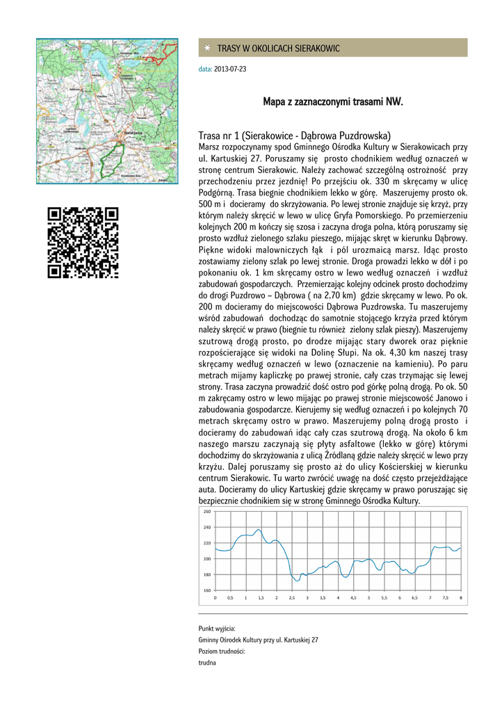 TRASY W OKOLICACH SIERAKOWIC data: 2013-07-23 Mapa z zaznaczonymi trasami NW. Trasa nr 1 (Sierakowice - Dąbrowa Puzdrowska) Marsz rozpoczynamy spod Gminnego Ośrodka Kultury w Sierakowicach przy ul. Kartuskiej 27. Poruszamy się prosto chodnikiem według oznaczeń w stronę centrum Sierakowic. Należy zachować szczególną ostrożność przy przechodzeniu przez jezdnię! Po przejściu ok. 330 m skręcamy w ulicę Podgórną. Trasa biegnie chodnikiem lekko w górę. Maszerujemy prosto ok. 500 m i docieramy do skrzyżowania. Po lewej stronie znajduje się krzyż, przy którym należy skręcić w lewo w ulicę Gryfa Pomorskiego. Po przemierzeniu kolejnych 200 m kończy się szosa i zaczyna droga polna, którą poruszamy się prosto wzdłuż zielonego szlaku pieszego, mijając skręt w kierunku Dąbrowy. Piękne widoki malowniczych łąk i pól urozmaicą marsz. Idąc prosto zostawiamy zielony szlak po lewej stronie. Droga prowadzi lekko w dół i po pokonaniu ok. 1 km skręcamy ostro w lewo według oznaczeń i wzdłuż zabudowań gospodarczych. Przemierzając kolejny odcinek prosto dochodzimy do drogi Puzdrowo – Dąbrowa ( na 2,70 km) gdzie skręcamy w lewo. Po ok. 200 m docieramy do miejscowości Dąbrowa Puzdrowska. Tu maszerujemy wśród zabudowań dochodząc do samotnie stojącego krzyża przed którym należy skręcić w prawo (biegnie tu również zielony szlak pieszy). Maszerujemy szutrową drogą prosto, po drodze mijając stary dworek oraz pięknie rozpościerające się widoki na Dolinę Słupi. Na ok. 4,30 km naszej trasy skręcamy według oznaczeń w lewo (oznaczenie na kamieniu). Po paru metrach mijamy kapliczkę po prawej stronie, cały czas trzymając się lewej strony. Trasa zaczyna prowadzić dość ostro pod górkę polną drogą. Po ok. 50 m zakręcamy ostro w lewo mijając po prawej stronie miejscowość Janowo i zabudowania gospodarcze. Kierujemy się według oznaczeń i po kolejnych 70 metrach skręcamy ostro w prawo. Maszerujemy polną drogą prosto i docieramy do zabudowań idąc cały czas szutrową drogą. Na około 6 km naszego marszu zaczynają się płyty asfaltowe (lekko w górę) którymi dochodzimy do skrzyżowania z ulicą Źródlaną gdzie należy skręcić w lewo przy krzyżu. Dalej poruszamy się prosto aż do ulicy Kościerskiej w kierunku centrum Sierakowic. Tu warto zwrócić uwagę na dość często przejeżdżające auta. Docieramy do ulicy Kartuskiej gdzie skręcamy w prawo poruszając się bezpiecznie chodnikiem się w stronę Gminnego Ośrodka Kultury. Punkt wyjścia: Gminny Ośrodek Kultury przy ul. Kartuskiej 27 Poziom trudności: trudna Długość szlaku: 8.0 km Rodzaj dróg: 20% drogi asfaltowe, 80% drogi leśne i polne Czas przejścia: 2h Trasa nr 2 (Kamienicki Młyn) Punktem wyjścia jest parking usytuowany pod tarasem widokowym Zamkowej Góry w Kamienickim Młynie. Czeka nas piękna i malownicza trasa wśród bajecznych lasów Mirachowskich. Trasa jest jednokierunkowa ze względu na jej specyfikę. Po wyruszeniu z parkingu kierujemy się według oznaczeń i zaraz po ok. 70 metrach skręcamy w lewo w stronę Kamienickiego Młyna. Po pokonaniu kolejnych 60 metrów skręcamy w prawo w polną dróżkę kierując się w las wzdłuż pól. Maszerujemy w górę, sporym wzniesieniem i krętą szutrową dróżką leśną. Po przejściu ok 600 metrów skręcamy według oznaczeń w lewą stronę poruszając się lasem. Maszerujemy cały czas prosto i po pokonaniu około 1 km skręcamy ostro w lewo i tu wchodzimy w głęboki las. Trzymamy się cały czas prawej strony. W przypadku niesprzyjającej pogody możemy natknąć się tu na lekko podmokły teren. Maszerujemy leśnymi ścieżkami wśród bukowego lasu. Amatorzy grzybobrania znajdą tu mnóstwo leśnych plonów. Po pokonaniu ok. 2 km za strumykiem skręcamy ostro w prawo poruszając się według oznaczeń. Po ok. 450 m docieramy do rozwidlenia na którym skręcamy w prawo wchodząc na szeroką szutrową drogę. Atmosfera bajecznego lasu jak i pojawiający się od czasu do czasu jego mieszkańcy stanowią dodatkowy atut tej trasy. Po przemierzeniu kolejnego odcinaka docieramy do szlabanu i tu skręcamy ostro w lewo. Teraz węższą drogą idziemy przez ok. 650 m prosto po czym skręcamy ostro w prawo. Dróżka jest dość kręta jednak prowadzi płaskim terenem. Po przemierzeniu ok. 500 m skręcamy w lewo. Pokonujemy kolejny odcinek trasy i skręcamy w prawo - Tu znajdują się oznakowania (drewniane strzałki) prowadzące na szczyt Zamkowej Góry i tarasu widokowego, z którego można podziwiać piękną panoramę na sześć jezior Białe, Czarne, Junno, Kamienickie, Odnoga oraz Potęgowskie. Dalsza część trasy prowadzi ostro w dół wąskim wąwozem. Docieramy do szerokiej szutrowej drogi – początkowego odcinka trasy skręcając w lewo schodzimy ostro w dół i powracamy do punktu wyjścia. Punkt wyjścia: Parking przy tarasie widokowym Zamkowej Góry w Kamienickim Młynie Poziom trudności: trudna Długość szlaku: 7.0 km Rodzaj dróg: 100% drogi leśne Czas przejścia: 2h Trasa nr 3 (Załakowo) Trasa rozpoczyna się z malowniczo położonego „Dworku na Błotach” w Załakowie. Marsz rozpoczynamy z parkingu za którym skręcamy w lewo. Trasa prowadzi polnymi drogami. Pokonujemy ok. 465 m i skręcamy w prawo. Maszerujemy wśród pól, mijamy przydrożny krzyż kierując się nadal prosto. Po przejściu 700 m docieramy do miejscowości Kowale. Wędrujemy prosto przemierzając odcinek 450 m i skręcamy w prawo. Na ok. 2 km naszej trasy skręcamy w prawo. Ponownie będziemy musieli skręcić w prawo po pokonaniu kolejnych 500 m. Maszerujemy między polami przez ok. 800 m i skręcamy w prawo. Pokonujemy 600 m i kierując się według oznaczeń skręcamy w lewo. Idziemy lekko pod górę i dochodzimy do punktu wyjścia. Punkt wyjścia: „Dworek na Błotach” w Załakowie Poziom trudności: łatwa Długość szlaku: 4.0 km Rodzaj dróg: 100% drogi polne Czas przejścia: 1h