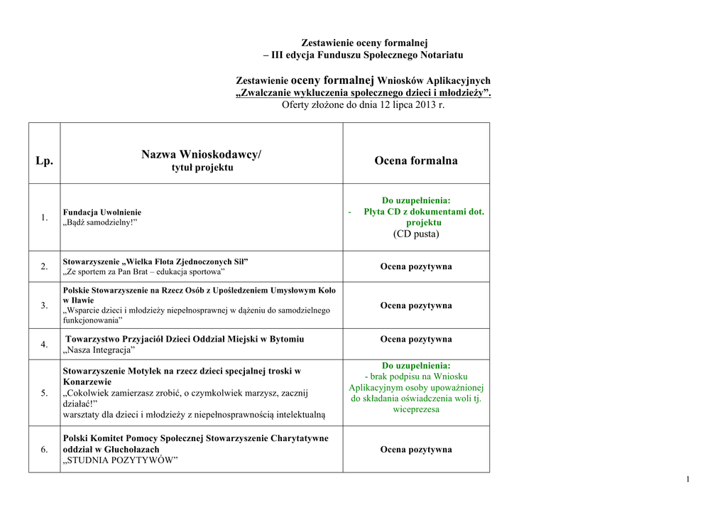 Zestawienie oceny formalnej – III edycja Funduszu Społecznego Notariatu Zestawienie oceny formalnej Wniosków Aplikacyjnych „Zwalczanie wykluczenia społecznego dzieci i młodzieży”. Oferty złożone do dnia 12 lipca 2013 r. Nazwa Wnioskodawcy/ Lp. 1. Ocena formalna tytuł projektu Fundacja Uwolnienie „Bądź samodzielny!” - Do uzupełnienia: Płyta CD z dokumentami dot. projektu (CD pusta) 2. Stowarzyszenie „Wielka Flota Zjednoczonych Sił” „Ze sportem za Pan Brat – edukacja sportowa” Ocena pozytywna 3. Polskie Stowarzyszenie na Rzecz Osób z Upośledzeniem Umysłowym Koło w Iławie „Wsparcie dzieci i młodzieży niepełnosprawnej w dążeniu do samodzielnego funkcjonowania” Ocena pozytywna 4. Towarzystwo Przyjaciół Dzieci Oddział Miejski w Bytomiu „Nasza Integracja” 5. Stowarzyszenie Motylek na rzecz dzieci specjalnej troski w Konarzewie „Cokolwiek zamierzasz zrobić, o czymkolwiek marzysz, zacznij działać!” warsztaty dla dzieci i młodzieży z niepełnosprawnością intelektualną 6. Polski Komitet Pomocy Społecznej Stowarzyszenie Charytatywne oddział w Głuchołazach „STUDNIA POZYTYWÓW” Ocena pozytywna Do uzupełnienia: - brak podpisu na Wniosku Aplikacyjnym osoby upoważnionej do składania oświadczenia woli tj. wiceprezesa Ocena pozytywna 1 7. 8. 9. 10. Do uzupełnienia: - płyta CD z budżetem i harmonogramem projektu Stowarzyszenie przyjaciół osób z autyzmem „Nie z tej bajki” „Niebieskie Mikołajki na stoku” – pierwsze zawody narciarskie dla dzieci z ASD i mikołajkowe niespodzianki podczas imprezy na zakończenie Europejskiego Tygodnia Autyzmu w 2013 roku (CD zawiera tylko Wniosek Aplikacyjny) Stowarzyszenie Edukacyjne „Łapska Dwójka” przy Szkole Podstawowej nr 2 w Łapach Fundacja Sport Na Zdrowie „UWOLNIC ODDECH – OŚRODEK TERAPII EDUKACYJNEJ I AKTYWIZACJI SPORTOWEJ” Stowarzyszenie Przyjaciół Miejskiej Biblioteki Publicznej w Olsztynie (SPMBP) „(PRZE) łamać BARIERY” Ocena pozytywna - Do uzupełnienia: płyta CD z dokumentami dot. projektu (CD pusta) Ocena pozytywna Do uzupełnienia: - płyta CD z budżetem i harmonogramem projektu 11. Fundacja na rzecz dzieci i młodzieży „Na końcu tęczy” I sapek English! 12. Caritas Archidiecezji Łódzkiej „Jest inny świat, tak wiem gdzieś tu...” Ocena pozytywna Gminny Ludowy Klub Sportowy Nadarzyn „Piłka Siatkowa sport dla każdego” Ocena pozytywna 13. 14. 15. 16. Fundacja po DRODZE „Samodzielnik – podręcznik usamodzielniania dla wychowanków placówek resocjalizacyjnych” Stowarzyszenie Rodziców i Opiekunów Dzieci Niepełnosprawnych „Dać Szansę” w Wadowicach „Dalej w ruch – jesteś zuch! – uruchomienie systemu aktywizacji ruchowej dla dzieci niepełnosprawnej Stowarzyszenie Integracji Społecznej „DROGA” „Nadzieja Wbrew Nadziei” (CD zawiera tylko Wniosek Aplikacyjny) Ocena pozytywna Ocena pozytywna Ocena pozytywna 2 17. Fundacja AGRO-WSPARCIE „BLIŻEJ MIASTA” Do uzupełnienia: - brak sprawozdania merytorycznego 18. Stowarzyszenie Pomocy Osobom z Problemami Emocjonalnymi SPOZA „Dzieci spoza” Ocena pozytywna Do uzupełnienia: - płyta CD z budżetem i harmonogramem projektu 19. Oratorium im. Św. Dominika Saro „NIEZWYCIĘŻENI” 20. Stowarzyszenie Nowy Dom w Nagawczynie „MAMY RÓWNE SZANSE” 21. Grupa Pedagogiki i Animacji Społecznej – Łódź „Promuj zmiany, które chcesz widzieć w świecie” Ocena pozytywna 22. Kociewski Parafialny Klub Sportowy Cor Cordium „Przeciwdziałanie patologiom społecznym poprzez „Sport dla wszystkich” Ocena pozytywna 23. Zgromadzenie Sióstr Miłosierdzia Św. Wincentego a Paulo Prowincja Chełmińsko-Poznańska „Akademia Świetlika” 24. Stowarzyszenie Przyjaciół Integracji Społecznej Feniks w Kielcach „Dajmy szansę na aktywność, samodzielność i zdrowie – organizacja wyjazdowego treningu samodzielności dla młodzieży niepełnosprawnej intelektualnie z województwa świętokrzyckiego” 25. Fundacja KREACJE „Smakowanie kultury wszystkimi zmysłami” (CD zawiera tylko Wniosek Aplikacyjny) Ocena pozytywna - Do uzupełnienia: płyta CD z dokumentami dot. projektu (CD pusta) Do uzupełnienia: - płyta CD z budżetem i harmonogramem projektu (CD zawiera tylko Wniosek Aplikacyjny) Ocena pozytywna 3 26. Stowarzyszenie Pomocy Dzieciom Smyki „SMYKI – samodzielne i aktywnie przez życie” Ocena pozytywna 27. Fundacja Sempre a Frente „Laboratorium młodzieżowego rozwoju” Ocena pozytywna 28. Fundacja dla sztuki „Z Wojaszówki po Kulturę” 29. Odział Gnieźnieński Stowarzyszenia Zastępczego Rodzicielstwa „Zanurzmy się na chwilę w bogactwie kultury i nauki” 30. Bank Żywności SOS w Warszawie „Jeść lepiej – Żyć lepiej” 31. Krajowe Towarzystwo Autyzmu Odział w Krakowie „JA TEŻ POTRAFIĘ” 32. Stowarzyszenie „Wspólne dobro – wspólny cel” „Warsztaty muzyczne” - Do uzupełnienia: płyta CD z dokumentami dot. projektu (CD pusta) Ocena pozytywna Ocena pozytywna Ocena pozytywna - Do uzupełnienia: płyta CD z dokumentami dot. projektu (CD pusta) 33. Fundacja Marka Kamińskiego „Obozy Zdobywców Biegunów” 34. Fundacja Teatr Nie-Taki „Młodzieżowa Redakcja Legnickiego Miesięcznika Kulturalnego „Raban” Ocena pozytywna - Do uzupełnienia: płyta CD z dokumentami dot. projektu (CD pusta) 35. Stowarzyszenie na rzecz pomocy rodzinie „Synapsa” „Profilaktyka pokoleniowa – mamo daj mi szansę” Ocena pozytywna 4 36. 37. 38. Stowarzyszenie Naukowo-Techniczne Inżynierów i Techników Rolnictwa Odział Słupsk „Uczymy się jak zdrowym być” Fundacja dla Dzieci , Młodzieży i Dorosłych Niepełnosprawnych Intelektualnie „POZNAJĘ – TWORZĘ – KOCHAM” – program integracyjny zajęc poznawczych i arteterapeutycznych, stymulujących aktywność dzieci i młodzieży niepełnosprawnej intelektualnie” Stowarzyszenie Mierz Wysoko „Wytańczmy Marzenia” Ocena pozytywna Ocena pozytywna - Do uzup