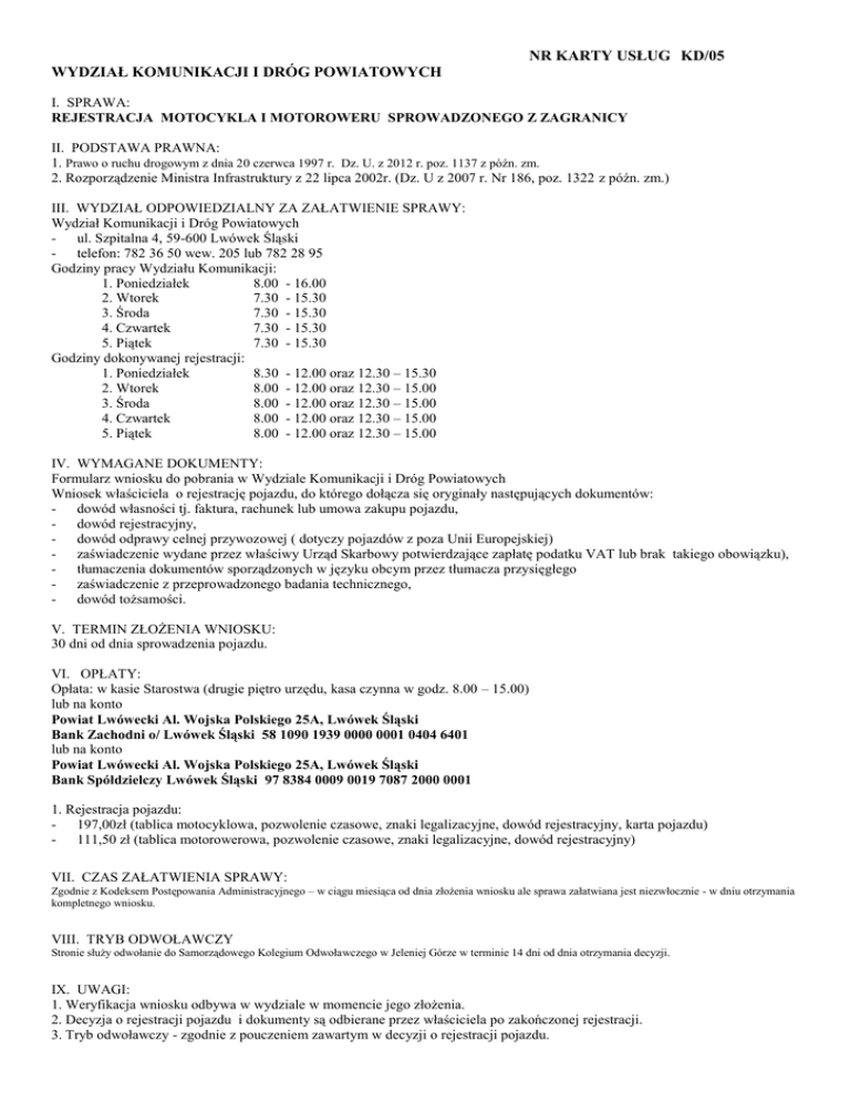 NR KARTY USŁUG KD/05 WYDZIAŁ KOMUNIKACJI I DRÓG POWIATOWYCH I. SPRAWA: REJESTRACJA MOTOCYKLA I MOTOROWERU SPROWADZONEGO Z ZAGRANICY II. PODSTAWA PRAWNA: 1. Prawo o ruchu drogowym z dnia 20 czerwca 1997 r. Dz. U. z 2012 r. poz. 1137 z późn. zm. 2. Rozporządzenie Ministra Infrastruktury z 22 lipca 2002r. (Dz. U z 2007 r. Nr 186, poz. 1322 z późn. zm.) III. WYDZIAŁ ODPOWIEDZIALNY ZA ZAŁATWIENIE SPRAWY: Wydział Komunikacji i Dróg Powiatowych - ul. Szpitalna 4, 59-600 Lwówek Śląski - telefon: 782 36 50 wew. 205 lub 782 28 95 Godziny pracy Wydziału Komunikacji: 1. Poniedziałek 8.00 - 16.00 2. Wtorek 7.30 - 15.30 3. Środa 7.30 - 15.30 4. Czwartek 7.30 - 15.30 5. Piątek 7.30 - 15.30 Godziny dokonywanej rejestracji: 1. Poniedziałek 8.30 - 12.00 oraz 12.30 – 15.30 2. Wtorek 8.00 - 12.00 oraz 12.30 – 15.00 3. Środa 8.00 - 12.00 oraz 12.30 – 15.00 4. Czwartek 8.00 - 12.00 oraz 12.30 – 15.00 5. Piątek 8.00 - 12.00 oraz 12.30 – 15.00 IV. WYMAGANE DOKUMENTY: Formularz wniosku do pobrania w Wydziale Komunikacji i Dróg Powiatowych Wniosek właściciela o rejestrację pojazdu, do którego dołącza się oryginały następujących dokumentów: - dowód własności tj. faktura, rachunek lub umowa zakupu pojazdu, - dowód rejestracyjny, - dowód odprawy celnej przywozowej ( dotyczy pojazdów z poza Unii Europejskiej) - zaświadczenie wydane przez właściwy Urząd Skarbowy potwierdzające zapłatę podatku VAT lub brak takiego obowiązku), - tłumaczenia dokumentów sporządzonych w języku obcym przez tłumacza przysięgłego - zaświadczenie z przeprowadzonego badania technicznego, - dowód tożsamości. V. TERMIN ZŁOŻENIA WNIOSKU: 30 dni od dnia sprowadzenia pojazdu. VI. OPŁATY: Opłata: w kasie Starostwa (drugie piętro urzędu, kasa czynna w godz. 8.00 – 15.00) lub na konto Powiat Lwówecki Al. Wojska Polskiego 25A, Lwówek Śląski Bank Zachodni o/ Lwówek Śląski 58 1090 1939 0000 0001 0404 6401 lub na konto Powiat Lwówecki Al. Wojska Polskiego 25A, Lwówek Śląski Bank Spółdzielczy Lwówek Śląski 97 8384 0009 0019 7087 2000 0001 1. Rejestracja pojazdu: - 197,00zł (tablica motocyklowa, pozwolenie czasowe, znaki legalizacyjne, dowód rejestracyjny, karta pojazdu) - 111,50 zł (tablica motorowerowa, pozwolenie czasowe, znaki legalizacyjne, dowód rejestracyjny) VII. CZAS ZAŁATWIENIA SPRAWY: Zgodnie z Kodeksem Postępowania Administracyjnego – w ciągu miesiąca od dnia złożenia wniosku ale sprawa załatwiana jest niezwłocznie - w dniu otrzymania kompletnego wniosku. VIII. TRYB ODWOŁAWCZY Stronie służy odwołanie do Samorządowego Kolegium Odwoławczego w Jeleniej Górze w terminie 14 dni od dnia otrzymania decyzji. IX. UWAGI: 1. Weryfikacja wniosku odbywa w wydziale w momencie jego złożenia. 2. Decyzja o rejestracji pojazdu i dokumenty są odbierane przez właściciela po zakończonej rejestracji. 3. Tryb odwoławczy - zgodnie z pouczeniem zawartym w decyzji o rejestracji pojazdu.