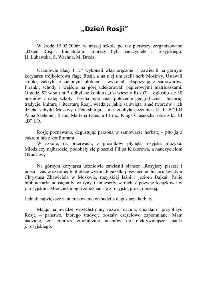 „Dzień Rosji” W środę 15.03.2006r. w naszej szkole po raz pierwszy zorganizowano „Dzień Rosji”. Inicjatorami imprezy byli nauczyciele j. rosyjskiego: H. Lubawska, S. Wachna, M. Brzóz. Uczniowie klasy I „c” wykonali własnoręcznie i zawiesili na górnym korytarzu trójkolorową flagę Rosji, a na niej umieścili herb Moskwy. Ustawili stoliki, zakryli je zielonym płótnem i wykonali ekspozycję z samowarów. Firanki, schody i wejście na górę udekorowali papierowymi matrioszkami. O godz. 900 w sali nr 3 odbył się konkurs „Co wiesz o Rosji?”. Zgłosiło się 30 uczniów z całej szkoły. Trzeba było znać położenie geograficzne, historię, tradycje, kulturę i literaturę Rosji, wiedzieć jakie są święta, znać twórców i ich dzieła, zabytki Moskwy i Petersburga. I mc. zdobyła uczennica kl. I „B” LO Anna Szełemej, II mc. Marlena Palec, a III mc. Kinga Ciasnocha, obie z kl. III „B” LO. Rosję poznawano, degustując parzoną w samowarze herbatę – pito ją z cukrem lub z konfiturami. W szkole, na przerwach, z głośników płynęła rosyjska muzyka. Młodzieży najbardziej podobały się piosenki Filipa Kirkorowa, a nauczycielom Okudżawy. Na górnym korytarzu uczniowie zawiesili plansze „Rosyjscy pisarze i poeci”, zaś w szkolnej bibliotece wykonali gazetki poświęcone historii świątyni Chrystusa Zbawiciela w Moskwie, rosyjskiej łaźni i jezioru Bajkał. Panie bibliotekarki udostępniły witryny i umieściły w nich z pozycje książkowe w j. rosyjskim. Młodzież mogła zapoznać się z rosyjską prozą i poezją. Jednak największe zainteresowanie wzbudziła degustacja herbaty. Mając na uwadze wszechstronny rozwój ucznia, chciałam przybliżyć Rosję – państwo, którego tradycje zostały częściowo zapomniane. Mam nadzieję, że impreza zmobilizuje uczniów do efektywniejszej nauki j. rosyjskiego.