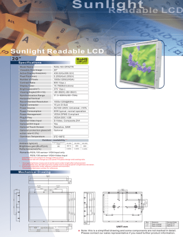 Sunlight Readable LCD 20" Specifications Model Name R20L100-OFA2TR Viewable Size Image 20" Active Display Area(mm) 408.0(H)x306.0(V) Pixel Pitch(mm) 0.255(H)x0.255(V) Number of Pixels 1600x1200(UXGA) Contrast Ratio 800:1(typ.) Display Color 16.7M(8bit/colors) Brightness(cd/m 2 ) 375 * (typ.) Viewing Angle(CR>=10) -89~89(H);-89~89(V) Synchronization Range 31.5~80KHz/60~75Hz Horizontal/Vertical Recommended Resolution 1600x1200@60Hz Signal Connector 15 pin D-Sub Power Source AC100~240V, Universal, ± 10% Power Consumption 60W typical, normal operation Power Management VESA DPMS Compliant Plug & Play VESA DDC 1/2B Optional Video Input S-Video, Composite,DVI Optional DVI Input Yes Optional Touch Screen Resistive, SAW Optional protection glass (refi Optional ection rate<0.5%) o Operation Temperature o 0 C~50 C Outdoor readability ** Brightness measure Angle Ambient light(nit) Brightness gain(BLoff)(nit) Reflectance(net)(%) 35° 15,000 30,000 397.5 465 80,000 660 0.65% 0.55% 0.45% Remarks:R20L100 series= VGA Input only R20L130 series= VGA+Video Input Specifications are subject to change without notice. Reflectance rate will change by LCD panel ITO glass design and coating ratio. * :Average brightness measured at center point under bright after enhancement. Actual number may deviate from this number due to orignal panel's brightness deviation. **:Expected brightness under different ambient environment. Simulated brightness number for reference. Mechanical Drawing 217,3±1 217,3±1 205±1 150±1 150±1 100±1 75±1 35±1 203,5±1 217,3±1 203,5±1 217,2±1 9±1 93±1 171±1 180±1 180±1 35±1 60±1 60±1 154±1 3,5±1 78,5±1 180±1 171±1 160±1 175±1 180±1 170±1 154±1 170±1 50±1 175±1 50±1 91±1 205±1 60±1 60±1 35±1 434,5±1 407±1 Rev. 1.0 1.1 Reasons Spec change Spec change Revised Date Aug-23-10 Sep-09-11 Note: this is a simplified drawing and some components are not marked in detail. * Please contact our sales representative if you need further product information.