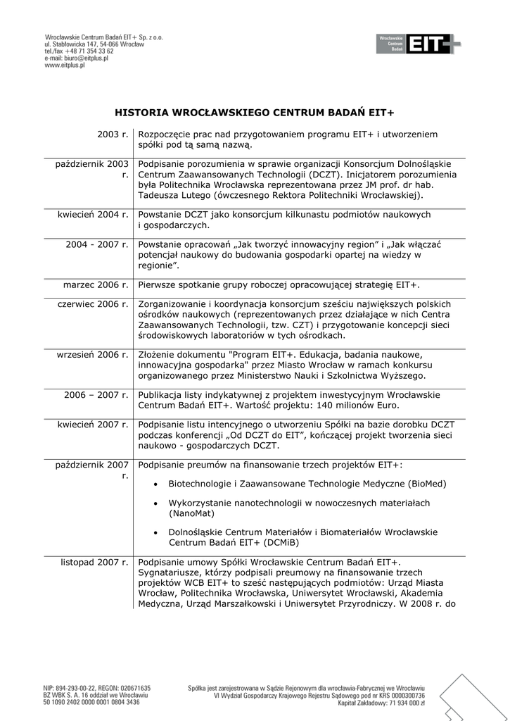 HISTORIA WROCŁAWSKIEGO CENTRUM BADAŃ EIT+ 2003 r. Rozpoczęcie prac nad przygotowaniem programu EIT+ i utworzeniem spółki pod tą samą nazwą. październik 2003 r. Podpisanie porozumienia w sprawie organizacji Konsorcjum Dolnośląskie Centrum Zaawansowanych Technologii (DCZT). Inicjatorem porozumienia była Politechnika Wrocławska reprezentowana przez JM prof. dr hab. Tadeusza Lutego (ówczesnego Rektora Politechniki Wrocławskiej). kwiecień 2004 r. Powstanie DCZT jako konsorcjum kilkunastu podmiotów naukowych i gospodarczych. 2004 - 2007 r. Powstanie opracowań „Jak tworzyć innowacyjny region” i „Jak włączać potencjał naukowy do budowania gospodarki opartej na wiedzy w regionie”. marzec 2006 r. Pierwsze spotkanie grupy roboczej opracowującej strategię EIT+. czerwiec 2006 r. Zorganizowanie i koordynacja konsorcjum sześciu największych polskich ośrodków naukowych (reprezentowanych przez działające w nich Centra Zaawansowanych Technologii, tzw. CZT) i przygotowanie koncepcji sieci środowiskowych laboratoriów w tych ośrodkach. wrzesień 2006 r. Złożenie dokumentu "Program EIT+. Edukacja, badania naukowe, innowacyjna gospodarka" przez Miasto Wrocław w ramach konkursu organizowanego przez Ministerstwo Nauki i Szkolnictwa Wyższego. 2006 – 2007 r. Publikacja listy indykatywnej z projektem inwestycyjnym Wrocławskie Centrum Badań EIT+. Wartość projektu: 140 milionów Euro. kwiecień 2007 r. Podpisanie listu intencyjnego o utworzeniu Spółki na bazie dorobku DCZT podczas konferencji „Od DCZT do EIT”, kończącej projekt tworzenia sieci naukowo - gospodarczych DCZT. październik 2007 r. Podpisanie preumów na finansowanie trzech projektów EIT+: listopad 2007 r. Biotechnologie i Zaawansowane Technologie Medyczne (BioMed) Wykorzystanie nanotechnologii w nowoczesnych materiałach (NanoMat) Dolnośląskie Centrum Materiałów i Biomateriałów Wrocławskie Centrum Badań EIT+ (DCMiB) Podpisanie umowy Spółki Wrocławskie Centrum Badań EIT+. Sygnatariusze, którzy podpisali preumowy na finansowanie trzech projektów WCB EIT+ to sześć następujących podmiotów: Urząd Miasta Wrocław, Politechnika Wrocławska, Uniwersytet Wrocławski, Akademia Medyczna, Urząd Marszałkowski i Uniwersytet Przyrodniczy. W 2008 r. do udziałowców dołącza Uniwersytet Ekonomiczny. listopad 2008 r. lipiec 2009 r. Podpisanie umowy przez Spółkę, przy akceptacji całego środowiska naukowego, na realizację dwóch projektów badawczych: Biotechnologie i Zaawansowane Technologie Medyczne (BioMed) oraz Wykorzystanie nanotechnologii w nowoczesnych materiałach (NanoMat). Podpisanie umowy przez Spółkę na realizację projektu „Akcelerator Spółek Innowacyjnych”. Projekt zakończono w 2012 r., powołując 12 spółek technologicznych typu spin-off. wrzesień 2009 r. Ministerstwo Nauki i Szkolnictwa Wyższego podpisało umowę z Wrocławskim Centrum Badań EIT+ na realizację inwestycji pn. Dolnośląskie Centrum Materiałów i Biomateriałów Wrocławskie Centrum Badań EIT+, zakładającą budowę i wyposażenie laboratoriów badawczotechnologicznych. październik 2009 r. Początek realizacji projektu infrastrukturalnego Dolnośląskie Centrum Materiałów i Biomateriałów Wrocławskie Centrum Badań EIT+ (DCMiB), którego realizacja zakłada utworzenie w ramach Kampusu Pracze nowego centrum naukowo-badawczego, składającego się z 3 zrewitalizowanych budynków Kampusu Pracze oraz budowę na jego terenie jednego nowego budynku Przeznaczeniem budynków są interdyscyplinarne laboratoria badawczo-technologicznych. grudzień 2011 r. Otwarcie centrum nauki "Humanitarium. Ogrody Doświadczeń" w Kampusie Pracze. czerwiec 2013 r. Oddanie do użytku pierwszych laboratoriów badawczo-technologicznych w zmodernizowanym budynku 1 listopad 2014. Oddanie do użytku kolejnych laboratoriów badawczo-technologicznych w zmodernizowanych budynkach 2 i 4. październik 2015 Oddanie do użytku kolejnych laboratoriów badawczo-technologicznych w nowo wybudowanym budynku 3. grudzień 2015 r. Zakończenie realizacji projektów: Biotechnologie i Zaawansowane Technologie Medyczne (BioMed), Wykorzystanie nanotechnologii w nowoczesnych materiałach (NanoMat) oraz Dolnośląskie Centrum Materiałów i Biomateriałów Wrocławskie Centrum Badań EIT+ (DCMiB).