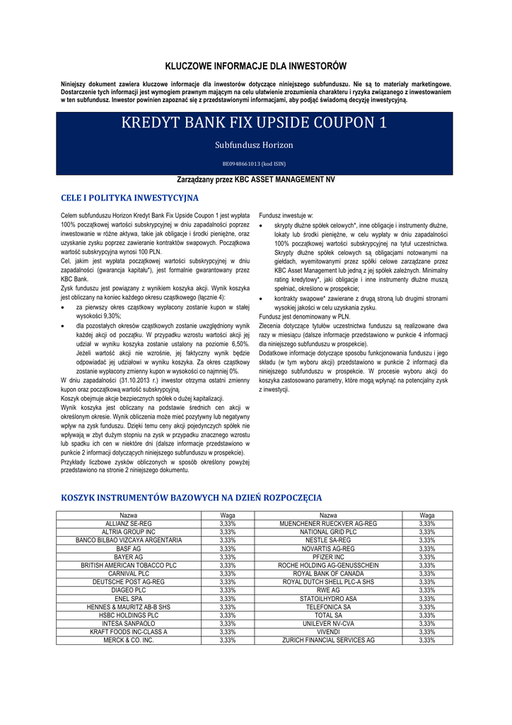 KLUCZOWE INFORMACJE DLA INWESTORÓW Niniejszy dokument zawiera kluczowe informacje dla inwestorów dotyczące niniejszego subfunduszu. Nie są to materiały marketingowe. Dostarczenie tych informacji jest wymogiem prawnym mającym na celu ułatwienie zrozumienia charakteru i ryzyka związanego z inwestowaniem w ten subfundusz. Inwestor powinien zapoznać się z przedstawionymi informacjami, aby podjąć świadomą decyzję inwestycyjną. KREDYT BANK FIX UPSIDE COUPON 1 Subfundusz Horizon BE0948661013 (kod ISIN) Zarządzany przez KBC ASSET MANAGEMENT NV CELE I POLITYKA INWESTYCYJNA Celem subfunduszu Horizon Kredyt Bank Fix Upside Coupon 1 jest wypłata 100% początkowej wartości subskrypcyjnej w dniu zapadalności poprzez inwestowanie w różne aktywa, takie jak obligacje i środki pieniężne, oraz uzyskanie zysku poprzez zawieranie kontraktów swapowych. Początkowa wartość subskrypcyjna wynosi 100 PLN. Cel, jakim jest wypłata początkowej wartości subskrypcyjnej w dniu zapadalności (gwarancja kapitału*), jest formalnie gwarantowany przez KBC Bank. Zysk funduszu jest powiązany z wynikiem koszyka akcji. Wynik koszyka jest obliczany na koniec każdego okresu cząstkowego (łącznie 4): za pierwszy okres cząstkowy wypłacony zostanie kupon w stałej wysokości 9,30%; dla pozostałych okresów cząstkowych zostanie uwzględniony wynik każdej akcji od początku. W przypadku wzrostu wartości akcji jej udział w wyniku koszyka zostanie ustalony na poziomie 6,50%. Jeżeli wartość akcji nie wzrośnie, jej faktyczny wynik będzie odpowiadać jej udziałowi w wyniku koszyka. Za okres cząstkowy zostanie wypłacony zmienny kupon w wysokości co najmniej 0%. W dniu zapadalności (31.10.2013 r.) inwestor otrzyma ostatni zmienny kupon oraz początkową wartość subskrypcyjną. Koszyk obejmuje akcje bezpiecznych spółek o dużej kapitalizacji. Wynik koszyka jest obliczany na podstawie średnich cen akcji w określonym okresie. Wynik obliczenia może mieć pozytywny lub negatywny wpływ na zysk funduszu. Dzięki temu ceny akcji pojedynczych spółek nie wpływają w zbyt dużym stopniu na zysk w przypadku znacznego wzrostu lub spadku ich cen w niektóre dni (dalsze informacje przedstawiono w punkcie 2 informacji dotyczących niniejszego subfunduszu w prospekcie). Przykłady liczbowe zysków obliczonych w sposób określony powyżej przedstawiono na stronie 2 niniejszego dokumentu. Fundusz inwestuje w: skrypty dłużne spółek celowych*, inne obligacje i instrumenty dłużne, lokaty lub środki pieniężne, w celu wypłaty w dniu zapadalności 100% początkowej wartości subskrypcyjnej na tytuł uczestnictwa. Skrypty dłużne spółek celowych są obligacjami notowanymi na giełdach, wyemitowanymi przez spółki celowe zarządzane przez KBC Asset Management lub jedną z jej spółek zależnych. Minimalny rating kredytowy*, jaki obligacje i inne instrumenty dłużne muszą spełniać, określono w prospekcie; kontrakty swapowe* zawierane z drugą stroną lub drugimi stronami wysokiej jakości w celu uzyskania zysku. Fundusz jest denominowany w PLN. Zlecenia dotyczące tytułów uczestnictwa funduszu są realizowane dwa razy w miesiącu (dalsze informacje przedstawiono w punkcie 4 informacji dla niniejszego subfunduszu w prospekcie). Dodatkowe informacje dotyczące sposobu funkcjonowania funduszu i jego składu (w tym wyboru akcji) przedstawiono w punkcie 2 informacji dla niniejszego subfunduszu w prospekcie. W procesie wyboru akcji do koszyka zastosowano parametry, które mogą wpłynąć na potencjalny zysk z inwestycji. KOSZYK INSTRUMENTÓW BAZOWYCH NA DZIEŃ ROZPOCZĘCIA Nazwa ALLIANZ SE-REG ALTRIA GROUP INC BANCO BILBAO VIZCAYA ARGENTARIA BASF AG BAYER AG BRITISH AMERICAN TOBACCO PLC CARNIVAL PLC DEUTSCHE POST AG-REG DIAGEO PLC ENEL SPA HENNES & MAURITZ AB-B SHS HSBC HOLDINGS PLC INTESA SANPAOLO KRAFT FOODS INC-CLASS A MERCK & CO. INC. Waga 3,33% 3,33% 3,33% 3,33% 3,33% 3,33% 3,33% 3,33% 3,33% 3,33% 3,33% 3,33% 3,33% 3,33% 3,33% Nazwa MUENCHENER RUECKVER AG-REG NATIONAL GRID PLC NESTLE SA-REG NOVARTIS AG-REG PFIZER INC ROCHE HOLDING AG-GENUSSCHEIN ROYAL BANK OF CANADA ROYAL DUTCH SHELL PLC-A SHS RWE AG STATOILHYDRO ASA TELEFONICA SA TOTAL SA UNILEVER NV-CVA VIVENDI ZURICH FINANCIAL SERVICES AG Waga 3,33% 3,33% 3,33% 3,33% 3,33% 3,33% 3,33% 3,33% 3,33% 3,33% 3,33% 3,33% 3,33% 3,33% 3,33% SCENARIUSZE WYNIKÓW Poniższe przykłady wyjaśniają określone powyżej cele i politykę inwestycyjną. Podstawą dla tych przykładów jest koszyk trzech akcji o równej wadze, przy czym cena każdej wynosi 100 przy obliczaniu wartości początkowej. SCENARIUSZ NEGATYWNY Wartość końcowa za okres cząstkowy (*) Akcja A Akcja B Akcja C Wynik obliczenia Dywidenda (**) Okres cząstkowy 1 Okres cząstkowy 2 Okres cząstkowy 3 / / 95(-5%) / / 99(-1%) / / 97(-3%) 9,30% (stała) 5,15% 0% Okres cząstkowy 4 99(-1%) 97(-3%) 95(-5%) / / (-5%-1%-3%)/3 = -3%, ALE zostanie skorygowany do 0% (-1%-3%-5%)/3 = -3%, ALE zostanie skorygowany do 0% 0% 100 + (0% x 100) = 100 PLN Scenariusz neutralny Wartość końcowa za okres cząstkowy (*) Akcja A Akcja B Akcja C Wynik obliczenia Dywidenda (**) Okres cząstkowy 1 Okres cząstkowy 2 Okres cząstkowy 3 Okres cząstkowy 4 / / 104(6,50%) 101(6,50%) / / (6,50%+6,50%-5%)/3 = 2,67% (6,50%+6,50%-5%)/3 = 2,67% 9,30% (stała) 5,15% 2,67% 2,67% Wypłacona w PLN; inwestor otrzyma 9,30% x 100 = 9,30 PLN 5,15% x 100 = 5,15 PLN 2,67% x 100 = 2,67 PLN 100 + (2,67% x 100) = 102,67 PLN Scenariusz pozytywny Wartość końcowa za okres cząstkowy (*) Akcja A Akcja B Akcja C Wynik obliczenia Dywidenda (**) / / (6,50%+6,50%+6,50%)/3 = 6,50% (6,50%+6,50%+6,50%)/3 6,50% 9,30% (stała) 5,15% 6,50% / / 101(6,50%) 102(6,50%) / / 95(-5%) 95(-5%) Okres cząstkowy 1 Okres cząstkowy 2 Okres cząstkowy 3 / / 103(6,50%) / / 104(6,50%) / / 111(6,50%) Okres cząstkowy 4 105(6,50%) 104(6,50%) 110(6,50%) = 6,50% Wypłacona w PLN; inwestor otrzyma 9,30% x 100 = 9,30 PLN 5,15% x 100 = 5,15 PLN 0% x 100 