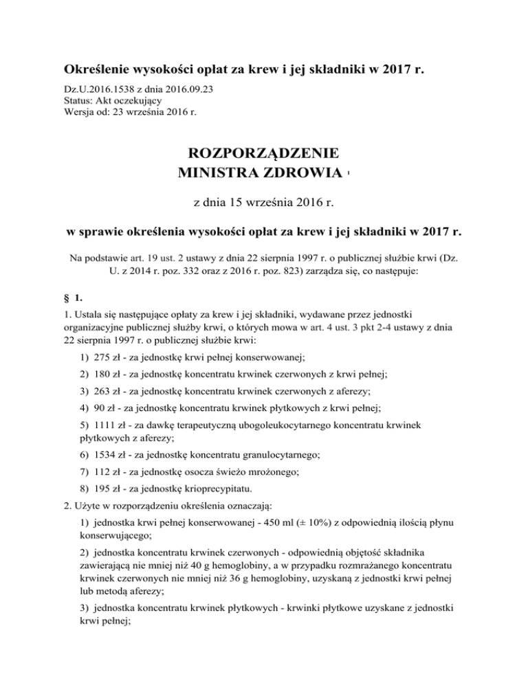 Określenie wysokości opłat za krew i jej składniki w 2017 r. Dz.U.2016.1538 z dnia 2016.09.23 Status: Akt oczekujący Wersja od: 23 września 2016 r. ROZPORZĄDZENIE MINISTRA ZDROWIA 1 z dnia 15 września 2016 r. w sprawie określenia wysokości opłat za krew i jej składniki w 2017 r. Na podstawie art. 19 ust. 2 ustawy z dnia 22 sierpnia 1997 r. o publicznej służbie krwi (Dz. U. z 2014 r. poz. 332 oraz z 2016 r. poz. 823) zarządza się, co następuje: § 1. 1. Ustala się następujące opłaty za krew i jej składniki, wydawane przez jednostki organizacyjne publicznej służby krwi, o których mowa w art. 4 ust. 3 pkt 2-4 ustawy z dnia 22 sierpnia 1997 r. o publicznej służbie krwi: 1) 275 zł - za jednostkę krwi pełnej konserwowanej; 2) 180 zł - za jednostkę koncentratu krwinek czerwonych z krwi pełnej; 3) 263 zł - za jednostkę koncentratu krwinek czerwonych z aferezy; 4) 90 zł - za jednostkę koncentratu krwinek płytkowych z krwi pełnej; 5) 1111 zł - za dawkę terapeutyczną ubogoleukocytarnego koncentratu krwinek płytkowych z aferezy; 6) 1534 zł - za jednostkę koncentratu granulocytarnego; 7) 112 zł - za jednostkę osocza świeżo mrożonego; 8) 195 zł - za jednostkę krioprecypitatu. 2. Użyte w rozporządzeniu określenia oznaczają: 1) jednostka krwi pełnej konserwowanej - 450 ml (± 10%) z odpowiednią ilością płynu konserwującego; 2) jednostka koncentratu krwinek czerwonych - odpowiednią objętość składnika zawierającą nie mniej niż 40 g hemoglobiny, a w przypadku rozmrażanego koncentratu krwinek czerwonych nie mniej niż 36 g hemoglobiny, uzyskaną z jednostki krwi pełnej lub metodą aferezy; 3) jednostka koncentratu krwinek płytkowych - krwinki płytkowe uzyskane z jednostki krwi pełnej; 4) dawka terapeutyczna koncentratu krwinek płytkowych z krwi pełnej uzyskana przez połączenie jednostek, o których mowa w ust. 1 pkt 4 - koncentrat krwinek płytkowych zawierający nie mniej niż 3 x 1011 krwinek płytkowych; 5) dawka terapeutyczna ubogoleukocytarnego koncentratu krwinek płytkowych z aferezy - koncentrat krwinek płytkowych, uzyskany przez usunięcie większości leukocytów z koncentratu krwinek płytkowych, uzyskanych przy użyciu separatora komórkowego (zawierający nie mniej niż 3 x 1011 krwinek płytkowych); 6) jednostka koncentratu granulocytarnego - składnik krwi, zawierający granulocyty zawieszone w osoczu, otrzymany od jednego dawcy metodą aferezy; 7) jednostka osocza świeżo mrożonego - co najmniej 150 ml osocza uzyskanego z jednostki krwi pełnej albo 200 ml (± 10%) osocza uzyskanego metodą aferezy; jednostka osocza świeżo mrożonego wydawana do przetoczenia biorcy musi być po karencji lub po redukcji biologicznych czynników chorobotwórczych; 8) jednostka krioprecypitatu - frakcję krioglobulin o objętości 20-30 ml uzyskaną z jednej jednostki osocza świeżo mrożonego; 9) dawka pediatryczna - część jednostki lub dawki terapeutycznej krwi lub jej składnika, przeznaczoną do użytku neonatologicznego lub pediatrycznego, o objętości lub zawartości komórkowych składników krwi zgodnej z wymaganiami określonymi w zamówieniu indywidualnym na krew i jej składniki, o którym mowa w § 9 ust. 5 rozporządzenia Ministra Zdrowia z dnia 11 grudnia 2012 r. w sprawie leczenia krwią w podmiotach leczniczych wykonujących działalność leczniczą w rodzaju stacjonarne i całodobowe świadczenia zdrowotne, w których przebywają pacjenci ze wskazaniami do leczenia krwią i jej składnikami (Dz. U. z 2013 r. poz. 5). § 2. W przypadku gdy składniki krwi wymienione w § 1 ust. 1 pkt 7 i 8 poddano karencji, opłaty wymienione w tych przepisach podwyższa się o 25 zł. § 3. W przypadku gdy jednostkę osocza świeżo mrożonego poddano redukcji biologicznych czynników chorobotwórczych, opłaty, o których mowa w § 1 ust. 1 pkt 7 i 8, podwyższa się o 123 zł. § 4. W przypadku gdy poddano redukcji biologicznych czynników chorobotwórczych dawkę terapeutyczną: 1) koncentratu krwinek płytkowych z krwi pełnej uzyskaną przez połączenie jednostek, o których mowa w § 1 ust. 1 pkt 4, sumę opłat za pojedyncze jednostki wymienione w tym przepisie podwyższa się o 506 zł; 2) składnika krwi, o którym mowa w § 1 ust. 1 pkt 5, opłatę wymienioną w tym przepisie podwyższa się o 506 zł. § 5. W przypadku gdy poddano napromieniowaniu: 1) jednostkę krwi lub jej składników, o których mowa w § 1 ust. 1 pkt 1-3 i 6, dawkę terapeutyczną składnika krwi, o którym mowa w § 1 ust. 1 pkt 5, lub dawkę pediatryczną krwi lub jej składników, o których mowa w § 1 ust. 1 pkt 1-5, opłaty wymienione w tych przepisach podwyższa się o 26 zł; 2) dawkę terapeutyczną koncentratu krwinek płytkowych z krwi pełnej uzyskaną przez połączenie jednostek, o których mowa w § 1 ust. 1 pkt 4, sumę opłat za pojedyncze jednostki wymienione w tym przepisie podwyższa się o 26 zł. § 6. W przypadku gdy poddano filtrowaniu: 1) jednostkę krwi lub jej składników, o których mowa w § 1 ust. 1 pkt 1-3, opłaty wymienione w tych przepisach podwyższa się o 83 zł; 2) dawkę terapeutyczną koncentratu krwinek płytkowych z krwi pełnej uzyskaną przez połączenie jednostek, o których mowa w § 1 ust. 1 pkt 4, sumę opłat za pojedyncze jednostki wymienione w tym przepisie podwyższa się o 130 zł. § 7. W przypadku gdy poddano przemywaniu: 1) jednostkę składników krwi, o których mowa w § 1 ust. 1 pkt 2 i 3, dawkę terapeutyczną składnika krwi, o którym mowa w § 1 ust. 1 pkt 5, lub dawkę pediatryczną krwi lub jej składników, o których mowa w § 1 ust. 1 pkt 2-5, opłaty wymienione w tych przepisach podwyższa się o 96 zł; 2) dawkę terapeutyczną koncentratu krwinek płytkowych z krwi pełnej uzyskaną przez połączenie jednostek, o których mowa w § 1 ust. 1 pkt 4, sumę opłat za pojedyncze jednostki wymienione w tym przepisie podwyższa się o 96 zł. § 8. W przypadku gdy jednostk