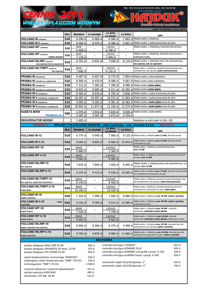 TEL - 95/722 54 59, 723 99 97, FAX - 95/723 99 98 www.hajduk.com.pl CENNIK NETTO (naleŜy doliczyć 23% VAT) KOSZT TRANSPORTU 105 ZŁ NETTO Wys Standard 510 510 VOLCANO W chłodnica VOLCANO W h chłodnica VOLCANO WT chłodnica 6 296 zł 8 300 zł stand 510 VOLCANO WT chłodnica szyba duplex VOLCANO WL/WP chłodnica bez szprosa lub ze szprosem VOLCANO WLT/WPT chłodnica bez szprosa 6 408 zł stand 510 7 139 zł 6 752 zł 510 Lx mosiądz 6 466 zł 8 470 zł Lx złoty Lx chrom 6 582 zł 8 586 zł Lx(inox) - 6 768 zł Lx(inox) - 6 922 zł 7 499 zł 7 038 zł Lx Extra opis 7 663 zł Wkład wodny z chłodnicą 9 667 zł Wkład wodny z szybą przesuwana do góry - Wkład wodny z chłodnicą, drzwiczki bezramowe Wkład wodny z chłodnicą, drzwiczki bezramowe z podwójną szybą 8 119 zł Wkład wodny z chłodnicą lewo lub prawostronny, bez szprosa, lub ze szprosem stand 510 Lx(inox) - 7 696 zł 8 120 zł - Wkład wodny z chłodnicą, drzwiczki bezramowe lewo lub prawostronne, bez szprosa, szyba dwuczęsciowa PRISMA W chłodnica 510 6 487 zł 6 657 zł 6 773 zł 7 854 zł Wkład wodny, szyba trójdzielna PRISMA W chłodnica, wymiennik 510 8 300 zł 8 470 zł 8 586 zł 9 667 zł Wkład wodny szyba trójdzielna, PRISMA W chłodnica 510 7 113 zł 7 283 zł 7 399 zł PRISMA W chłodnica, wymiennik PRISMA W h chłodnica 510 510 8 925 zł 8 469 zł 9 095 zł 8 639 zł 9 211 zł 8 755 zł 8 480 zł Wkład wodny szyba gięta, 10 292 zł Wkład wodny szyba gięta, 9 836 zł Wkład wodny z szyba przesuwaną do góry PRISMA W h chłodnica, wymiennik 510 10 287 zł 10 457 zł 10 573 zł 11 654 zł Wkład wodny z szybą przesuwaną do góry PRISMA W h chłodnica 510 9 095 zł 9 265 zł 9 381 zł 10 462 zł Wkład wodny, szyba gięta przes.do góry PRISMA W h chłodnica, wymiennik 510 10 907 zł 11 077 zł 11 193 zł 12 274 zł Wkład wodny, szyba gięta przes.do góry 500 3 745 zł 3 387 zł 3 915 zł 3 557 zł 4 015 zł 3 673 zł KASETA MKW PROMOCJA ! 1 600 zł REKUPERATOR WODNY NOWOŚĆ!!! 5 035 zł Kaseta wodna, szyba płaska 4 754 zł Nakładany na wylot spalin śr.180, i 200 WKŁADY Z PŁASZCZEM WODNYM - układ zamknięty - max. ciśnienie 2,5 bar Wys Standard Lx mosiądz Lx złoty Lx chrom Lx Extra NOWOŚĆ!!! opis VOLCANO W-12 510 6 775 zł 6 945 zł 7 060 zł 8 135 zł Wkład wodny z chłodnicą moc 12 kW, drzwiczki proste VOLCANO W h-12 510 8 684 zł 8 854 zł 8 969 zł 10 044 zł Wkład wodny z chłodnicą moc 12 kW, drzwiczki proste przesuwane do góry VOLCANO WT-12 VOLCANO WT h-12 VOLCANO WL/WP-12 VOLCANO WL/WP h-12 VOLCANO WLT/WPT-12 VOLCANO WLT/WPT h-12 VOLCANO W-18 szyba z pyrolizą VOLCANO WT-18 VOLCANO WT h-18 szyba duplex VOLCANO WL/WP-18 szyba z pyrolizą, bez szprosa VOLCANO WL/WP h-18 szyba z pyrolizą 9 062 zł szyba Lx(inox) - 7 300 zł Lx(inox) - 9 482 zł - Wkład wodny z chłodnicą, drzwiczki bezramowe, moc 12 kW - Wkład wodny z chłodnicą, drzwiczki bezramowe przesuwane do góry, moc 12 kW 510 7 635 zł 7 805 zł 7 920 zł 8 995 zł 510 9 245 zł 9 415 zł 9 530 zł 10 605 zł 510 szyba gięta szyba duplex stand stand 510 bez szprosa, szyba dwuczęściowa z pyrolizą 6 880 zł 510 bez szprosa VOLCANO W h-18 stand 510 8 145 zł stand 10 100 zł Lx(inox) - 8 565 zł Lx(inox) - 10 520 zł Wkład wodny z chłodnicą lewo lub prawostronny, bez szprosa, moc 12 kW Wkład wodny z chłodnicą moc 12 kW, drzwiczki naroŜne lewo lub prawostronne przesuwane do góry - Wkład wodny z chłodnicą, drzwiczki naroŜne bezramowe lewo lub prawostronne, bez szprosa, szyba dwuczęsciowa - Wkład wodny z chłodnicą, drzwiczki bezramowe lewo lub prawostronne, przesuwane do góry, szyba gięta 510 7 320 zł 7 490 zł 7 605 zł 8 680 zł Wkład wodny z chłodnicą, moc 18 kW, szyba z pyrolizą 510 9 229 zł 9 399 zł 9 514 zł 10 589 zł Wkład wodny z chłodnicą, moc 18 kW, szyba z pyrolizą przesuwana do góry 510 510 stand 7 320 zł stand 9 502 zł Lx(inox) - 7 740 zł Lx(inox) - 9 922 zł - Wkład wodny z chłodnicą moc 18 kW , drzwiczki bezramowe, podwójna szyba płaska - Wkład wodny z chłodnicą, moc 18 kW, drzwiczki bezramowe, podwójna szyba płaska przesuwana do góry 510 8 090 zł 8 260 zł 8 375 zł 9 450 zł 510 9 700 zł 9 870 zł 9 985 zł 11 060 zł Wkład wodny z chłodnicą moc 18 kW, drzwiczki lewo lub prawostronne, bez szprosa, szyba z pyrolizą Wkład wodny z chłodnicą, moc 18 kW, drzwiczki lewo lub prawostronne przesuwane do góry, szyba z pyrolizą AKCESORIA pompa obiegowa Keller GDP 25-40 pompa obiegowa GRUNDFOS UP basic 25-40 pompa obiegowa LFP LESZNO 25-40 zawór bezpieczeństwa termicznego "DANFOSS" trójdrogowy zawór temperaturowy "ESBE" VTC312 termoregulator "ESBE" LTC141 naczynie wzbiorcze z zaworem pływakowym zasilacz awaryjny A200 WAC akumulator 12V SBL -65 Ah 205 zł 370 zł 405 zł 240 zł 220 zł 1.580 zł 221 zł 485 zł 513 zł centralka sterująca "HAJDUK" centralka sterująca KOMINEK PLUS centralka sterująca KOMINEK LUX grafik z przep. fi-120 centralka sterująca ecoKOM Classic z przep. fi-100 221 zł 340 zł 564 zł 550 zł wymiennik ciepła SL32/20 płytowy -1” wymiennik ciepła SL32/30 płytowy –1” 550 zł 730 zł