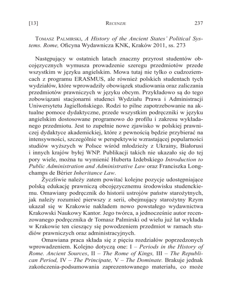 [13] Recenzje 237 Tomasz Palmirski, A History of the Ancient States’ Political Sys� tems. Rome, Oficyna Wydawnicza KNK, Kraków 2011, ss. 273 Następujący w ostatnich latach znaczny przyrost studentów obcojęzycznych wymusza prowadzenie szeregu przedmiotów przede wszystkim w języku angielskim. Mowa tutaj nie tylko o cudzoziemcach z programu ERASMUS, ale również polskich studentach tych wydziałów, które wprowadziły obowiązek studiowania oraz zaliczania przedmiotów prawniczych w języku obcym. Przykładowo są do tego zobowiązani stacjonarni studenci Wydziału Prawa i Administracji Uniwersytetu Jagiellońskiego. Rodzi to pilne zapotrzebowanie na aktualne pomoce dydaktyczne, przede wszystkim podręczniki w języku angielskim dostosowane programowo do profilu i zakresu wykładanego przedmiotu. Jest to zupełnie nowe zjawisko w polskiej prawniczej dydaktyce akademickiej, które z pewnością będzie przybierać na intensywności, szczególnie w perspektywie wzrastającej popularności studiów wyższych w Polsce wśród młodzieży z Ukrainy, Białorusi i innych krajów byłej WNP. Publikacji takich nie ukazało się do tej pory wiele, można tu wymienić Huberta Izdebskiego Introduction to Public Administration and Administrative Law oraz Franciszka Longchamps de Bérier Inheritance Law. Życzliwie należy zatem powitać kolejne pozycje udostępniające polską edukację prawniczą obcojęzycznemu środowisku studenckiemu. Omawiany podręcznik do historii ustrojów państw starożytnych, jak należy rozumieć pierwszy z serii, obejmujący starożytny Rzym ukazał się w Krakowie nakładem nowo powstałego wydawnictwa Krakowski Naukowy Kantor. Jego twórca, a jednocześnie autor recenzowanego podręcznika dr Tomasz Palmirski od wielu już lat wykłada w Krakowie ten cieszący się powodzeniem przedmiot w ramach studiów prawniczych oraz administracyjnych. Omawiana praca składa się z pięciu rozdziałów poprzedzonych wprowadzeniem. Kolejno dotyczą one: I – Periods in the History of Rome. Ancient Sources, II – The Rome of Kings, III – The Republi� can Period, IV – The Principate, V – The Dominate. Brakuje jednak zakończenia-podsumowania zaprezentowanego materiału, co może 238 Recenzje [14] utrudniać czytelnikom należyte zrozumienie mechanizmów rozwoju ustroju państwa, szczególnie w perspektywie skupienia osi podręcznika niemal wyłącznie wokół wydarzeń politycznych. Celowość takiego rozdziału byłaby tym większa, jeśli stwierdzimy iż zagadnienie pierwszorzędnej wagi – a mianowicie pytanie jak sami Rzymianie na swój ustrój się zapatrywali – potraktował Autor zdecydowanie drugoplanowo, przemilczając ówczesne stanowisko samych zainteresowanych. Nie odnajdziemy również choćby zarysu koncepcji filozoficznych leżących u podstaw przemian ustrojowych w Rzymie, podobnie zresztą jak dzieje się to w polskojęzycznych opracowaniach ius publicum, nie tylko historycznych. Wprowadzenie jednak takiej perspektywy niewątpliwie wzbogaciłoby wykład przedmiotu, uzupełniając nadmiernie i ogólnikowo eksploatowane czynniki „społeczno-polityczne”, które są przecież w istocie pochodną ciągłej przebudowy systemów filozoficznych. Na marginesie warto wspomnieć iż o perspektywę taką upomina się również powiązany tematycznie współczesny wykład prawa rzymskiego, zarówno publicznego jak i prywatnego. Na pochwałę zasługuje włączenie do rozważań specyfiki rzymskiej republiki jako swoistego systemu mieszanego, tak bardzo zachwalanego przez Polibiusza i relacjonowanego przez Cycerona. Ten antyczny wzorzec równowagi władz może wciąż może służyć za wzór dla nieco już zużytych współczesnych koncepcji post-oświeceniowych. Z punktu widzenia dydaktyki stanowi rzymski system mieszany wyborne źródło inspiracji i refleksji nad ustrojem państwa dla współczesnych prawników in spe, a w części przecież przyszłych legislatorów. Ponieważ jednak kwestie te zostały jedynie zasygnalizowane (a zasługiwały z pewnością na osobny podrozdział), oczekiwania czytelnika spotykają się tu ze zdecydowanym niedosytem. Na duży plus zaliczyć należy rozdział pierwszy, w którym Autor bardzo szczegółowo omawia antyczne źródła do studiów nad ustrojem, o zakresie znacznie przekraczającym wymagania stawiane studiującym dzieje przemian rzymskiego ustroju według dalszej zawartości podręcznika. To cenna nawigacja dla szczególnie zainteresowanych tematem. Choć to podręcznik, może warto byłoby również – podobnie jak źródła - krótko scharakteryzować wybrane pozycje literatury tema- [15] Recenzje 239 tu, mając na uwadze pomoc dla poszukujących uzupełnienia nabytych wiadomości, z natury przecież ogólnych w ramach podstawowego kursu akademickiego. Znajdziemy jednak owej literatury zestawienie, wybór czołowych pozycji przede wszystkim zagranicznych. Wśród polskojęzycznych zabrakło może Powszechnej Historii Państwa i Prawa Michała Szczanieckiego oraz chociaż jednego podręcznika historii doktryn. Należało również zwrócić uwagę czytelników na klasyczną pozycję J.M. Kelly’ego A short history of western legal theory która ukazała się również w polskim tłumaczeniu. Dlaczego w tekście zabrakło, choćby zbiorczo dla każdego rozdziału, tak bardzo przydatnych studentowi further readings zamiast ogólnego (i bogatego) wyboru prac na końcu podręcznika który ułożony jest alfabetycznie, lecz nie rzeczowo? Autor zwraca uwagę czytelników na akcję wielkich nadań ziemskich po zdobyciu etruskiego miasta Weje w latach od 426 do 396 prz. Chr. oraz związanych z tym przemian społecznych patrycjatu (s.68 i nast.). Ostatnie badania rzucają nowe światło na to zjawisko: jak wskazuje Jerzy Krzynówek, w pracy – Od ‘ius vendendi’ do ‘emancipatio’. Prawne i społeczne aspekty ‘emancipatio’ dzieci w prawie rzymskim w okresie republiki i pryncypatu, Warszawa 2012, s. 205-20