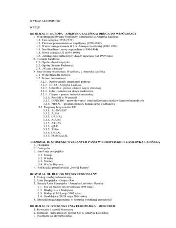 WYKAZ AKRONIMÓW WSTĘP RO ZDZI AŁ I: EUROPA - AMERYKA ŁACIŃSKA: DROGA DO WSPÓŁPRACY 1. Współpraca polityczna Wspólnoty Europejskiej z Ameryką Łacińską 1.1. Faza wstępna (1958-1970 ) 1.2. Pierwsze porozumieni a o współpracy (1970-1982) 1.3. Wzrost zaangaŜowania WE w Ameryce Łacińskiej (1982-1990) 1.4. Neoliberalizm i nowy regionalizm (1990-1994) 1.5. Nowa strategia UE (1994-1999 ) 1.6. „Strategiczne partnerstwo" dwóch regionów (od 1999 roku) 2. Stosunki handlowe 2.1. Ogólna charakterystyka 2.2. Ogólny System Preferen cji 2.3. „Wojna o banany" 3. Inne obszary współpracy Wspólnoty z Ameryka Łacińską 3.1. Współpraca dla rozwoju 3.2. Pomoc humanitarna 3.2.1. Ogólne zasady organi zacji pomocy 3.2.2. ECHO i Ameryka Łacińska 3.2.3. Kolumbia - pomoc ofiarom wojny domowej 3.2.4. Kuba - państwo na skraju bankructwa 3.2.5. Chiapas - pomoc ludności indiańskiej 3.2.6. Powódź w Wenezueli 3.2.7. DIPECHO - przewidywanie i minimalizowanie skutków katastrof naturalny ch 3.2.8. PRRAC - program pomocy humanitarnej i odbudowy 3.3. Programy horyzontalne UE 3.3.1. AL-INVEST 3.3.2. ALFA 3.3.3. URB-AL 3.3.4. ALURE 3.3.5. ATLAS 3.3.6. @LIS 3.3.7. Alßan 3.3.8. OREAL 3.3.9. EUROsociAL RO ZDZI AŁ II: STOSUNKI WYBRANYCH PAŃSTW EUROPEJSKICH Z AMERYKĄ ŁACIŃSKĄ 1. Hiszpania 2. Portugalia 3. Inne kraje eu ropejskie 3.1. Francja 3.2. Włochy 3.3. Niemcy 3.4. Wielka Brytania 4. Polska jako przedstawiciel „Nowej Europy" RO ZDZI AŁ III: DIALOG MIĘDZYREGIONALNY 1. Dialog międzyparlament arny 2. Unia Europejska - Grupa z Rio 3. Szczyty Unia Europejska - Ameryk a Łacińska i Karaiby 3.1. Rio de Janeiro (28-29 czerwca 1999 roku) 3.2. Między Rio a Madrytem 3.3. Madryt (17-18 maja 2002 roku) 3.4. Guadalaj ara (28-29 maja 2004 roku) 4. Stosunki międzyregionalne: w kierunku świetlanej przyszłości? RO ZDZI AŁ IV: STOSUNKI UNIA EUROPEJSKA - MERCOSUR 1. Powstanie i rozwój Mercosuru 2. Mercosur - najwaŜniejszy partner UE w Ameryce Łacińskiej 3. Na drodze do stowarzys zenia 4. Współpraca i stosunki handlowe 5. Stosunki dwustronne Unii Europejskiej z krajami Cono Sur 5.1. Brazylia - mocarstwo region alne 5.2. Argentyna - od wojny malwińskiej do kryzysu 5.3. Urugwaj i Paragwaj RO ZDZI AŁ V: WSPÓŁPRACA UNII EUROPEJSKIEJ ZE WSPÓLNOTĄ ANDYJSKĄ 1. Od Grupy do Wspólnoty - integracja w regionie andyjskim 2. Stosunki Unii Europejskiej ze Wspólnotą Andyjską 2.1. Dialog polityczny 2.2. Narkotyki - specjalny dialog UE i krajów andyjskich 2.3. Współpraca i wymiana handlowa 3. Stosunki bilateralne UE z krajami andyjskimi 4. UE wobec wojny domowej w Kolumbii RO ZDZI AŁ VI: DIALOG UE - AMERYKA ŚRODKOWA 1. Zarys integracji region alnej w Ameryce Środkowej 2. Proces San Jose 2.1. Przyczyny zaangaŜowania się Wspólnoty w Ameryce Środkowej 2.2. Początek procesu San Jose 2.3. I etap — wsparcie procesu pokojowego 2.4. II etap - demokracja i integracja regionaln a 2.5. Przyszłość procesu San Jose - rozwój współpracy czy rozstanie? 3. Stosunki bilateralne UE z państwami Ameryki Środkowej RO ZDZI AŁ VII: MEKSYK i CHILE – SPECJALNE RELACJE Z UE 1. Unia Europejska - Meksyk 1.1. Krótki rys historyczny 1.2. Umowa o stowarzyszeniu 1.2.1. Podpisywać czy nie podpisywać? - dylematy UE 1.2.2. Kwestia klauzuli demokratycznej 1.2.3. Główne zasady nowego traktatu 1.3.Stosunki handlowe 2. Unia Europejska - Chile 2.1. Dwie stracone dek ady - od zamachu A. Pinocheta do ponownego nawiązani a stosunków z WE 2.2. W kierunku stowarzyszenia 2.3. „Sprawa Pinocheta" 2.4. Stosunki handlowe 3. Podsumowanie RO ZDZI AŁ VIII: KARAIBY W RAMACH WSPÓŁPRACY UE Z KRAJAMI АKР 1. Mechanizmy współpracy między Unią Europejską i krajami АKР 2. Integracja regionaln a na Karaibach 2.1. Karaibsk a Wspólnota Gospodarcza (CARICOM) 2.2. Organizacja Państw Karaibów Wschodnich (OECS) 2.3. Stowarzyszenie Państw Karaibskich (ACS) 2.4. CARIFORUM 3. Współpraca Unii Europejskiej z karaibskimi krajami АKР 4. Terytoria i departamenty zamorskie na Karaibach 5. Kuba 5.1. „Okres specjalny w czasie pokoju" 5.2. Stosunki UE-Kuba na przełomie wieków 5.3. Unia a polityka USA wobec Kuby 5.4. Kuba i Karaiby 5.5. Kryzys kwietniowy 6. Haiti ZAKOŃCZENIE BIBLIOGRAFIA SPIS TABEL I WYKRESÓW ANEKS: DELEGACJE KOMISJI EUROPEJSKIEJ W AMERYCE ŁACIŃSKIEJ I NA KARAIBACH
