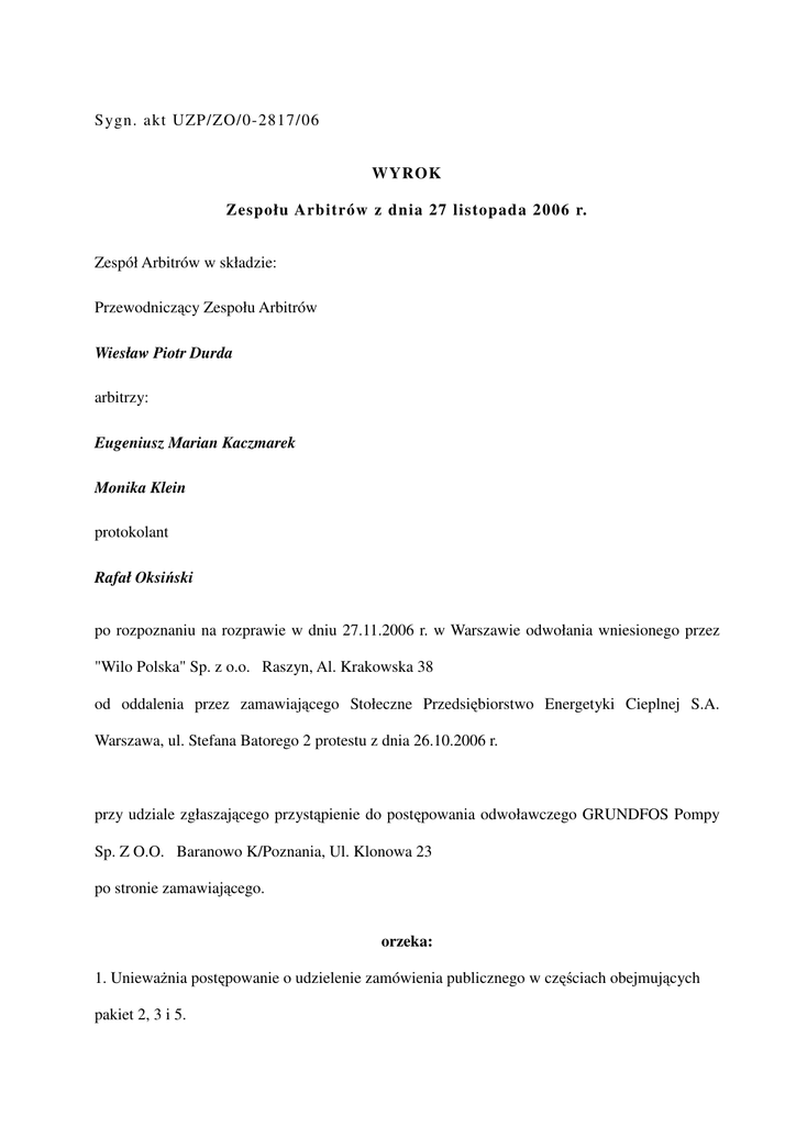 Sygn. akt UZP/ZO/0-2817/06 WYROK Zespołu Arbitrów z dnia 27 listopada 2006 r. Zespół Arbitrów w składzie: Przewodniczący Zespołu Arbitrów Wiesław Piotr Durda arbitrzy: Eugeniusz Marian Kaczmarek Monika Klein protokolant Rafał Oksiński po rozpoznaniu na rozprawie w dniu 27.11.2006 r. w Warszawie odwołania wniesionego przez "Wilo Polska" Sp. z o.o. Raszyn, Al. Krakowska 38 od oddalenia przez zamawiającego Stołeczne Przedsiębiorstwo Energetyki Cieplnej S.A. Warszawa, ul. Stefana Batorego 2 protestu z dnia 26.10.2006 r. przy udziale zgłaszającego przystąpienie do postępowania odwoławczego GRUNDFOS Pompy Sp. Z O.O. Baranowo K/Poznania, Ul. Klonowa 23 po stronie zamawiającego. orzeka: 1. Unieważnia postępowanie o udzielenie zamówienia publicznego w częściach obejmujących pakiet 2, 3 i 5. Strona 2 z 7 2. Kosztami postępowania obciąża Stołeczne Przedsiębiorstwo Energetyki Cieplnej S.A. Warszawa, ul. Stefana Batorego 2 i nakazuje: 1) zaliczyć na rzecz Urzędu Zamówień Publicznych koszty w wysokości 4342 zł 62 gr (słownie: cztery tysiące trzysta czterdzieści dwa złote sześćdziesiąt dwa grosze) z kwoty wpisu uiszczonego przez "Wilo Polska" Sp. z o.o. Raszyn, Al. Krakowska 38 2) dokonać wpłaty kwoty 7942 zł 62 gr (słownie: siedem tysięcy dziewięćset czterdzieści dwa złote sześćdziesiąt dwa grosze) przez Stołeczne Przedsiębiorstwo Energetyki Cieplnej S.A. Warszawa, ul. Stefana Batorego 2 na rzecz "Wilo Polska" Sp. z o.o. Raszyn, Al. Krakowska 38, stanowiącej uzasadnione koszty uczestnika postępowania odwoławczego poniesione z tytułu kosztów postępowania i wynagrodzenia pełnomocnika 3) dokonać wpłaty kwoty 0 zł 0 gr (słownie: -----------------------------) przez --------------------------------- na rzecz Urzędu Zamówień Publicznych na rachunek dochodów własnych UZP 4) dokonać zwrotu kwoty 15657 zł 38 gr (słownie: piętnaście tysięcy sześćset pięćdziesiąt siedem złotych trzydzieści osiem groszy) z rachunku dochodów własnych Urzędu Zamówień Publicznych na rzecz "Wilo Polska" Sp. z o.o. Raszyn, Al. Krakowska 38 . 3. Uzasadnienie W trakcie postępowania o udzielenie zamówienia publicznego na "Utworzenie depozytu i dostawy pomp cyrkulacyjnych" , prowadzonego w trybie przetargu nieograniczonego, oferta Odwołującego została odrzucona w częściach zamówienia obejmujących pakiety: 2,3 i 5. Jako podstawę prawną swej czynności zamawiający przywołał art. 89 ust.1 pkt.2 ustawy z dnia 29 Strona 3 z 7 stycznia 2004 r - Prawo zamówień publicznych (Dz.U. z 2006r., Nr 164 poz. 1163), zgodnie z którym Zamawiający odrzuca ofertę jeżeli jej treść nie odpowiada treści SIWZ. Zamawiający nie uzasadnił na czym polega rozbieżność pomiędzy treścią oferty a treścią SIWZ. Dopiero w piśmie z dnia 03.10.2006 r , które to pismo otrzymał Odwołujący na swój wniosek, zawarte są motywy działania Zamawiającego. W ocenie Zamawiającego w oferowanych przez Odwołującego pompach (pakiet 3 i 5 ) zastosowana została specjalna kształtka "gwint/kołnierz", co pozostaje w sprzeczności z opisem przedmiotu zamówienia zawartym w SIWZ. Ponadto w pakiecie5, zaoferowanie przez Odwołującego pompy posiadają elektroniczny regulator prędkości obrotowej zamiast pomp z trzema prędkościami obrotowymi. Natomiast w pakiecie 2 Zamawiający uznała, ż oferowane pompy nie zapewniają żądanych parametrów na pośrednim biegu. Odwołujący oprotestował odrzucenie jego oferty, podnosząc iż czynność ta narusza art. 7 ust.1 i art.89 ust.1 pkt.2 ustawy PZP. Zdaniem Odwołującego zastosowanie do pompy z połączeniem gwintowanym specjalnej kształtki wkręcanej na króciec pompy, daje w rezultacie wymagany w SIWZ sposób mocowania w postaci kołnierza. Podniósł on także , że zaoferowane pompy elektroniczne posiadają jako jeden z trybów- tryb pracy ze stałą prędkością obrotową. Odnosząc się natomiast do podstaw odrzucenia pakiecie 2 Odwołujący stwierdził, że oferowane pompy posiadają punkty pracy znajdujące się na pośrednim biegu lub pomiędzy biegiem pośrednim a maksymalnym. Zamawiający nie rozstrzygnął protestu w terminie przewidzianym przez art. 183 ust. Ustawy PZP. Zachowując wymogi art. 184 ust.2 i 3 ustawy PZP Odwołujący wniósł odwołanie do Prezesa UZP. Do postępowania odwoławczego przystąpił po stronie Zamawiającego WykonawcaGrundfos Pompy Sp. z o.o. Strona 4 z 7 Zespół Arbitrów ustalił i zważył, co następuje : Opisując przedmiot zamówienia w kwestionowanych pakietach (częściach) , Zamawiający naruszył bezwzględnie obowiązujący przepis art. 29 ustawy PZP. Zgodnie z tym przepisem przedmiot zamówienia musi być opisany w sposób jednoznaczny i wyczerpujący , za pomocą dostatecznie dokładnych i zrozumiałych określeń , uwzględniający wszystkie wymagania i okoliczności mogące mieć wpływ na sporządzenie oferty. Zamawiający tym samym dopuścił do składania ofert , których ocena zgodności z opisem przedmiotu zamówienia , nie może być dokonana w sposób obiektywny. Nie może być w konsekwencji zagwarantowana przez Zamawiającego podstawowa zasada udzielania zamówień publicznych wyrażona w art. 7 ust. 1 ustawy PZP, t.j. zasada uczciwej konkurencji i równego traktowania wszystkich wykonawców . Jak stwierdził Zespół Arbitrów opis przedmiotu zamówienia wynikający z SIWZ jest niejednoznaczny i w wielu elementach wewnętrznie sprzeczny. Przykładowo w pkt II.2.3 ,,Wymagań technicznych dla pomp wirowych'' , stanowiących załącznik do SIWZ, Zamawiający dopuścił zastosowanie pomp o stałej charakterystyce oraz pomp wielobiegowych lub elektronicznych, gdy jednocześnie w załączniku do formularza ofertowego (pakiet nr 5) mowa jest wyłącznie o pompach bezdławnicowych standardowych. Wymagane parametry pomp nie zostały skonkretyzowane, natomiast w to miejsce w pkt. 3.12. SIWZ, Zamawiający uczynił punktem odniesienia pompy produkcji LFP.