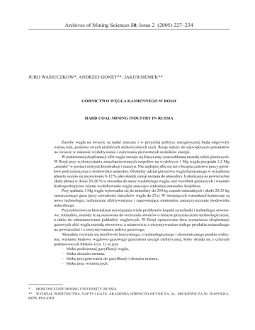 Archives of Mining Sciences 50, Issue 2 (2005) 227–234 227 JURIJ WASIUCZKOW*, ANDRZEJ GONET**, JAKUB SIEMEK** GÓRNICTWO WĘGLA KAMIENNEGO W ROSJI HARD COAL MINING INDUSTRY IN RUSSIA Zasoby węgla na świecie są nadal znaczne i w przyszłej polityce energetycznej będą odgrywały ważną rolę, pomimo swych niektórych niekorzystnych cech. Rosja należy do największych potentatów na świecie w zakresie wydobywania i zużywania pierwotnych nośników energii. W podziemnej eksploatacji złóż węgla stosuje się klasyczną i pracochłonną metodę robót górniczych. W Rosji przy wykorzystaniu zmechanizowanych zespołów na wydobycie 1 Mg węgla przypada 1,2 Mg „metalu” w postaci różnych konstrukcji i maszyn. Nie najlepiej dba się też o bezpieczeństwo pracy górników pod ziemią oraz o środowisko naturalne. Globalny udział górnictwa węgla kamiennego w ociepleniu planety ocenia się na poziomie 8-12 % jako skutek emisji metanu do atmosfery. Lokalizacja na powierzchni skały płonej w ilości 20-26 % w stosunku do masy wydobytego węgla, sieć wyrobisk górniczych i warunki hydrogeologiczne rejonu wydobywania węgla znacząco zmieniają naturalny krajobraz. Przy spalaniu 1 Mg węgla wprowadza się do atmosfery do 250 kg cząstek mineralnych i około 20-25 kg zasiarczonego gazu (przy zawartości siarczków węgla do 2%). W istniejących warunkach konieczne są nowe technologie, technicznie efektywniejsze i zapewniające minimalne zanieczyszczenie środowiska naturalnego. Przyszłościowym kierunkiem rozwiązania wielu problemów kopalń są techniki i technologie otworowe. Aktualnie, metody te są stosowane do wiercenia otworów o różnym przeznaczeniu technologicznym, a także do odmetanowania pokładów węglowych. W Rosji opracowano dwa scenariusze eksploatacji gazowych złóż węgla metodą otworowa; a mianowicie z otrzymywaniem stałego produktu mineralnego na powierzchni i z otrzymywaniem paliwa gazowego. Aktualnie rozważa się możliwość korzystnego, z technologicznego i ekonomicznego punktu widzenia, wariantu budowy węglowo-gazowego generatora energii elektrycznej, który składa się z czterech podstawowych bloków (rys. 1) to jest: – bloku podziemnej gazyfikacji węgla, – bloku drenażu metanu, – bloku przygotowania do gazyfikacji i drenażu metanu, – bloku prac wiertniczych. * MOSCOW STATE MINING UNIVERSITY, RUSSIA ** WYDZIAŁ WIERTNICTWA, NAFTY I GAZU, AKADEMIA GÓRNICZO-HUTNICZA, AL. MICKIEWICZA 30, 30-059 KRAKÓW, POLAND 228 Szacunkowe porównanie techniczno-ekonomicznych wskaźników projektowych eksploatacji otworowej do produkcji energii elektrycznej z tradycyjnym sposobem wskazuje, że jego zastosowanie w praktyce mogłoby 3 do 4 razy podwyższyć efektywność wykorzystania energii użytecznej paliwa węglowego i obniżyć koszt produkcji energii elektrycznej 1,5 do 2,2 razy. Słowa kluczowe: górnictwo, węgiel kamienny, węglowo-gazowy generator Hard coal reserves are still considerable in size, therefore despite some of its unfavourable properties, coal will certainly play an important role in the future power policy. Russia belongs to the greatest producers and consumers of primary energy sources. Underground exploitation of coal beds is based on labour-consuming mining works. It has been assessed that in Russia, the extraction of 1 Mg of coal is accompanied by 1.2 Mg metal consumption (all kinds of systems and devices). Other aspects that still need major improvement is the work safety of the miners and environmental protection. Generally, coal has a negative share (ca. 8 to 12%) in the warming up effect. The gangue on surface (constituting about 20 to 25% of the extracted coal mass), old workings, and hydrogeological conditions in the mining areas considerably change the natural landscape. The combustion of 1 Mg of coal is accompanied by an emission of 250 kg mineral particles to the atmosphere and ca. 20 to 25 kg of gas with sulphur content (up to 2% of carbon sulfides). The existing conditions necessitate new, more efficient technologies that would minimize the environmental impact. Borehole techniques and technologies create a good perspective for solving problems encountered by mines. These methods are presently applied for drilling boreholes of different technological destination, and for methane removal. Two scenarios of coalbed methane extraction with the borehole method were elaborated in Russia. In the first of them solid mineral is produced, whereas in the other one – gas fuel. At a preliminary stage of working out economically and technologically feasible solutions, a construction of a coal-gas electric energy generator is considered; It consists of four basic blocks (Fig. 1), i.e. – underground coal gasification block; – methane drainage block; – pre-gasification and pre-drainage block; – drilling works block. The comparison of technical-economic design indices of borehole extraction for electric energy generation and the traditional methods shows that the application of the former is expected to increase the utilization level of useful energy encapsulated in coal fuel ca. 3 to 4 times, and also lower the cost of electric energy by 1.5 to 2.2 times. Keywords: mining industry, hard coal, coal-gas generator 1. Wprowadzenie Udział paliwa stałego w światowym wykorzystaniu energii pierwotnej wynosi nie mniej niż 30%, a obecnie wydobywa się ok. 4,5 miliarda Mg węgla w tym 65% z wykorzystaniem technologii podziemnej eksploatacji. Należy zaznaczyć, że 85% wydobywanego węgla kamiennego i praktycznie 100% wydobywanego węgla brunatnego wykorzystuje się w celach energetycznych. Zasoby węgla posiada ponad 50 krajów świata i znacznie przewyższają one udokumentowane zasoby ropy naftowej i gazu. 229 2. Surowce energetyczne w Rosji Rosja jest jednym z bogatszych krajów pod względem zasobów węgla. Według różnych prognoz zapotrzebowania na węgiel, można sądzić, że posiadane zasoby węgla wystarczą na 