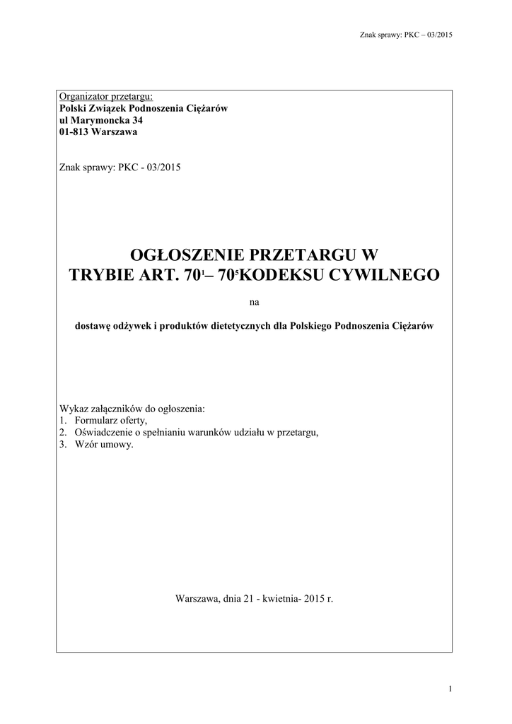 Znak sprawy: PKC – 03/2015 Organizator przetargu: Polski Związek Podnoszenia Ciężarów ul Marymoncka 34 01-813 Warszawa Znak sprawy: PKC - 03/2015 OGŁOSZENIE PRZETARGU W TRYBIE ART. 701– 705KODEKSU CYWILNEGO na dostawę odżywek i produktów dietetycznych dla Polskiego Podnoszenia Ciężarów Wykaz załączników do ogłoszenia: 1. Formularz oferty, 2. Oświadczenie o spełnianiu warunków udziału w przetargu, 3. Wzór umowy. Warszawa, dnia 21 - kwietnia- 2015 r. 1 Znak sprawy: PKC – 03/2015 Rozdział 1. Nazwa i adres Organizatora przetargu Organizatorem przetargu jest Polski Związek Podnoszenia Ciężarów w Warszawie (01-813), ul Marymoncka 34 telefon (22) 834 1142, fax (22) 834 11 42, strona internetowa www.pzpc.pl - zwany dalej Zamawiającym Rozdział 2. Postanowienia Ogólne 1. Zamówienie prowadzone jest przy odpowiednim zastosowaniu przepisów dotyczących udzielania przetargu w trybie art. 701 – 705 Kodeksu cywilnego (Dz. U. z 1964, Nr 16, poz. 93 ze zm.) – zwanego dalej kodeksem cywilnym. 2. W wyniku przeprowadzonego przetargu Zamawiającym zamierza wyłonić jednego Wykonawcę, z którym zawrze umowę w przedmiocie realizacji zamówienia. 3. W sprawach nieuregulowanych w niniejszym ogłoszeniu stosuje się kodeks cywilny. Rozdział 3. Przedmiot zamówienia 1. Przedmiotem zamówienia objętego niniejszym postępowaniem jest dostawa odżywek i produktów dietetycznych dla Polskiego Związku Podnoszenia Ciężarów. l.p. Nazwa Dawka/postać 1 Odżywka węglowodanowa z Aminokwasami 3000g 2 36 3 Preparat awierający L-karnityne, guarane, L- 30 amp/10ml tyrozyny (aminokwas), tauryne, kwas cytrusowy, kofeine, sorbinian potasu (środek konserwujący), aromat cytrynowy. Guarana+l-carnityna+Cholina+tauryna 30amp/ 10ml 4 TribulusTerrestris+AvenaSativa+ZMA 120 caps 52 5 Zawiera na 100g: Koncentrat białek co najmniej 75g, Węglowodany 13g, Tłuszcze 3,2g, L-glutamina 500mg, cynk 7,69 mg, magnez 167 mg, witamina B6 1,08 mg,żelazo 6,23 mg Zawiera na 100g: Koncentrat białek co najmniej 75g, Węglowodany 13g, Tłuszcze 3,2g, L-glutamina 500mg, cynk 7,69 mg, magnez 167 mg, witamina B6 1,08 mg,żelazo 6,23 mg 1 kapsułka zawiera: Monohydrat kreatyny najwyższej czystości 500mg, fosforan potasu 6,1mg, fosforan sodu 10,5mg, chrom 7,5mcg, selenian sodu 0,0048mcg, tauryna 2000g/op 34 1000g/op 49 504g 35 6 7 Ilość opakowań 40 46 2 Znak sprawy: PKC – 03/2015 8 9 10 11 67,5mg, glicyna 21,3mg Zawiera na 100g: (BCAA) Leucyna 20g, Valina 2,5g, Isoleucyna 2,5g, Tauryna 5g, Fosforan Magnezu 281mg Odżywka węglowodaanowa z Aminokwasami 1 żel zawiera: 129kcal, węglowodany( mieszanka: maltoza, polisacharydy, maltorioza, glukoza, ryboza) 22,8g, MCT 4070mg Koncentrat wraz ze składnikami mineralnymi, na 100ml: 70kcal, Węglowodany: 17,5g, Sód 73mg, Chlorki 89mg, Potas 21mg, Węglan Magnezu 3,8mg 450g 30 3000g 40 żel 37g/ 15szt/op 80 1litr/ koncentrat 55 2. Jeżeli Zamawiający dokonując szczegółowego opisu przedmiotu zamówienia wskazał przykładowo nazwę handlową (nazwę producenta, typ produktu), tym samym określił minimalne dopuszczalne parametry oferowanego asortymentu, to w tym zakresie Zamawiający dopuszcza możliwość składania ofert równoważnych, tj. obejmujących towary innych producentów, o innej nazwie handlowej, które posiadają nie gorsze cechy jakościowe, wydajnościowe oraz medyczne od asortymentu wskazanego przez Zamawiającego. 3. Zamawiający dopuszcza realizację zamówienia przez podwykonawców. Wykonawca zobowiązany jest wskazać w ofercie części zamówienia, których wykonanie zamierza powierzyć podwykonawcom. Wykonawca ponosi pełną odpowiedzialność za prace wykonane przez podwykonawców również za usterki gwarancyjne. 4. Zamawiający ma prawo do niezrealizowania pełnej szacunkowej wielkości zamówienia. Zakres zamówienia może być zrealizowany w 50% ogólnej wartości niniejszej umowy. Zakup pozostałej ilości odżywek i produktów dietetycznych zależeć będzie od potrzeb Zamawiającego (prawo opcji). Wykonawcy nie przysługuje prawo roszczeń z tytułu niewykorzystania pełnej wartości umowy. 5. Zamawiającemu w ramach niniejszego zamówienia przysługuje prawo zwiększenia lub zmniejszenia ilości poszczególnych odżywek i produktów dietetycznych pod warunkiem nie przekroczenia wartości umowy. Wykonawcy nie przysługuje prawo do roszczeń z tego tytułu. 6. Zamawiający nie przewiduje możliwość zamówień uzupełniających. 7. Zamawiający nie dopuszcza składania ofert częściowych. Wykonawcy muszą złożyć jedną ofertę na cały przedmiot zamówienia. 8. Zamawiający nie dopuszcza składania ofert wariantowych. Rozdział 4. Termin i miejsce realizacji zamówienia 1. Umowa obowiązuje w okresie od dnia podpisania umowy do dnia 31 grudnia 2015 r. z zastrzeżeniem, że, umowa ulega rozwiązaniu po wyczerpaniu maksymalnego wynagrodzenia Wykonawcy określonego w umowie. 3 Znak sprawy: PKC – 03/2015 2. Termin każdorazowej dostawy nie może być dłuższy niż 5 dni roboczych, licząc od dnia złożenia zamówienia przez Zamawiającego przekazanego Wykonawcy za pośrednictwem e-maila lub faksu. Przez dni robocze rozumie się w niniejszej umowie dni od poniedziałku do piątku z wyjątkiem dni ustawowo wolnych od pracy. 3. Za datę dostawy przyjmuje się dzień podpisania przez obie strony bez zastrzeżeń protokołu odbioru ilościowego. 4. Miejscem dostawy jest siedziba Polskiego Związku Podnoszenia Ciężarów lub inne miejsce na terenie kraju, wskazane przez Zamawiającego. Rozdział 5. Warunki udziału w przetargu oraz opis sposobu dokonywania oceny spełnienia tych warunków 1. O udzielenie zamówienia ubiegać się mogą Wykonawcy, którzy: 1) Spełniają warunki określone dotyczące: a) posiadania uprawnień do wykonywania określonej działalności lub czynności; Zamawiający uzna ww. warunek za spełniony jeżeli Wykonawca wykaże, że: jeżeli przepisy prawa nakładają obowiązek ich posiadani, Wykonawca
