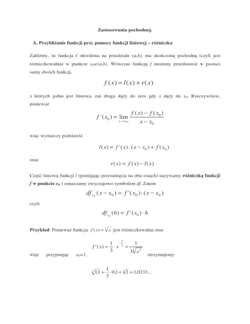 Zastosowania pochodnej. A. Przybli anie funkcji przy pomocy funkcji liniowej – ró niczka Załó my, e funkcja f okre lona na przedziale (a,b), ma sko czon pochodn (czyli jest ró niczkowalna) w punkcie x0∈(a,b). Wówczas funkcj f mo emy przedstawi w postaci sumy dwóch funkcji, f ( x) = l ( x) + r ( x) z których jedna jest liniowa, za druga d y do zera gdy x d y do x0. Rzeczywi cie, poniewa f ' ( x0 ) = lim x → x0 f ( x) − f ( x0 ) x − x0 wi c wystarczy podstawi l ( x) = f ' ( x) ⋅ ( x − x0 ) + f ( x0 ) oraz Cz r ( x) = f ( x) − l ( x) liniow funkcji l (pomijaj c przesuni cia na obu osiach) nazywamy ró niczk funkcji f w punkcie x0 i oznaczamy zwyczajowo symbolem df. Zatem df x0 ( x − x0 ) = f ' ( x0 ) ⋅ ( x − x0 ) czyli df x0 (h) = f ' ( x0 ) ⋅ h Przykład: Poniewa funkcja f ( x) = 3 x jest ró niczkowalna oraz 2 wi c przyjmuj c x0=1, 1 − 1 f ' ( x) = ⋅ x 3 = 3 33 x 2 3 otrzymujemy 1 1,1 ≈ ⋅ 0,1 + 3 1 = 1,0333... 3 B. Przybli anie funkcji przy pomocy wielomianu – wzór Taylora Je eli wszystkie pochodne funkcji f do rz du n-1 wł cznie s ci głe w przedziale [x0,x0+h] oraz istnieje pochodna rz du n w przedziale (x0,x0+h), to f ' ( x0 ) f ' ' ( x0 ) 2 f ( n−1) ( x0 ) n−1 f ( x + h ) = f ( x0 ) + h+ h + ... + h + Rn (n − 1)! 1! 2! gdzie reszta wzoru Taylora Rn jest postaci f ( n ) ( x0 + ah) n Rn = h n! dla pewnej liczby a z przedziału (0,1). Wielomian Wn−1 (h) = f ( x0 ) + f ( k ) ( x0 ) k h k! n −1 k =1 nazywamy wielomianem Taylora funkcji f w punkcie x0. Je li x0=0, to wzór Taylora przyjmuje posta zwan wzorem Maclaurina gdzie f ' ( 0) f ' ' ( 0) 2 f ( n−1) (0) n−1 f ( x ) = f ( 0) + x+ x + ... + x + Rn ( x) (n − 1)! 1! 2! f ( n ) (ax) n Rn ( x) = x n! Przykład: Stosuj c wzór Maclaurina do funkcji f(x)=ex mo emy obliczy liczb e z dowoln dokładno ci . Rzeczywi cie, poniewa dla dowolnego x wi c f ' ( x) = f ' ' ( x) = ... = f ( n ) ( x) = e x f (0) = f ' (0) = f ' ' (0) = ... = f ( n ) (0) = 1 Zatem oraz 1 1 1 e1 = 1 + 1 + 12 + ... + 1n−1 + Rn (1) 1! 2! (n − 1)! Rn (1) = Je eli chcemy wyznaczy liczb wielomian Taylora dla n=8, gdy R8 (1) < ea e 3 < < n! n! n! e z dokładno ci do 0,0001, to wystarczy obliczy 3 1 1 = < = 0,0001 8! 13440 10000 Przybli ona warto liczby e wynosi w tym przypadku W7 (1) = 1 + 1 + 1 1 1 1 1 1 + + + + + = 2,7183 2! 3! 4! 5! 6! 7! C. Obliczanie granic wyra e nieoznaczonych – twierdzenia de l’Hospitala Załó my, e funkcje f ' ( x) f ( x) i s okre lone w pewnym s siedztwie punktu x0 oraz h' ( x ) h( x ) lim f ( x) = lim g ( x) = g x → x0 gdzie g=0, g=∞ lub g=Je li istnieje granica lim x→ x 0 x → x0 ∞. f ' ( x) f ( x) f ' ( x) = lim , to lim . x→ x0 h( x ) x→ x0 h' ( x ) h' ( x ) Analogiczne twierdzenie zachodzi tak e dla granic jednostronnych oraz dla x→∞ i x→-∞. sin(3 x) 0 sin' (3 x) cos(3 x) ⋅ 3 = = lim = lim =3 x →0 sin x x → 0 sin' x x →0 0 cos x lim Przykłady: x 0 = = lim x →0 tg ( x ) x →0 0 lim xctg ( x) = lim x →0 1 = lim cos 2 x = 1 x →0 1 2 cos x 1 (ln x )' = lim x = 0 ln x ∞ lim = = lim x →∞ x x →∞ x →∞ 1 ∞ x' Uwaga: Warunkiem koniecznym stosowania twierdzenia de l’Hospitala jest granica postaci 0 ∞ lub . ∞ 0
