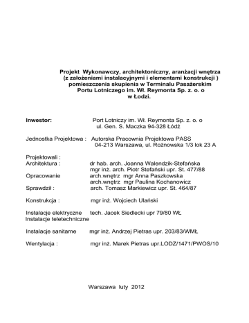 Projekt Wykonawczy, architektoniczny, aranżacji wnętrza (z założeniami instalacyjnymi i elementami konstrukcji ) pomieszczenia skupienia w Terminalu Pasażerskim Portu Lotniczego im. Wł. Reymonta Sp. z. o. o w Łodzi. Inwestor: Port Lotniczy im. Wł. Reymonta Sp. z. o. o ul. Gen. S. Maczka 94-328 Łódź Jednostka Projektowa : Autorska Pracownia Projektowa PASS 04-213 Warszawa, ul. Rożnowska 1/3 lok 23 A Projektowali : Architektura : Sprawdził : dr hab. arch. Joanna Walendzik-Stefańska mgr inż. arch. Piotr Stefański upr. St. 477/88 arch.wnętrz mgr Anna Paszkowska arch.wnętrz mgr Paulina Kochanowicz arch. Tomasz Markiewicz upr. St. 464/87 Konstrukcja : mgr inż. Wojciech Ulański Opracowanie Instalacje elektryczne tech. Jacek Siedlecki upr 79/80 WŁ Instalacje teletechniczne Instalacje sanitarne mgr inż. Andrzej Pietras upr. 203/83/WMŁ Wentylacja : mgr inż. Marek Pietras upr.LODZ/1471/PWOS/10 Warszawa luty 2012 Zawartość projektu A. Architektura I. Część opisowa II Część rysunkowa A. Projekt architektoniczny 1. 2. Rzut pomieszczeń z układem projektowanych ścian skala Rzut pomieszczeń (technologiczny) z układem wyposażenia stałego i ruchomego skala 3. Rzut - układ posadzki skala 4. Widok sufitu z układem oświetlenia i określeniem stref inst. skala 5. Przekrój a-a skala 6. Przekrój b-b skala 7. Przekrój c-c skala 8. Widok ściany ołtarzowej skala 9. Widok ściany tylnej skala 10. Aneks lewy -widok ściany bocznej (strona lewa) skala 11. Aneks lewy - widok ściany bocznej (strona prawa) 12. Aneks prawy – widok ściany bocznej (strona lewa) 13. Aneks prawy – widok ściany bocznej (strona prawa) 14. Kolorystyka – schematy skala 14.a Kolorystyka – schematy skala 14.b Kolorystyka – schematy skala 14.c Kolorystyka – schematy skala B 15. 16. 17. 18. 19. 20. 21. 22. 23. 24. 25.. 26. 27. 28. 29. 30. 30a 30b Projekty mebli i elementów wyposażenia Tabernakulum, witraż, wieczna lampka ( 1,1a,1b) Krzyż ( 2) Ołtarz (3) Półka na ampułki i kielich ( 3a) Pulpit ambona (4) Miejsce przewodniczenia ( siedziska) ( 5) Miejsce przewodniczenia ( pulpit) ( 5a) Pulpit pod pisma ( 6) Ławki w nawie ( 7) Ołtarz maryjny w lewym aneksie ( 8) Szafy na szaty i elementy związane z liturgią ( 9) Konfesjonał ( 10) Osłona grzejnika i mocowanie paneli z psalmami ( 11,12) Wnęka z witrażami w ścianie tylnej Półka w przedsionku i skarbonka ( 16 ,15) Witraż w prezbiterium (,1b) Witraże w ścianie tylnej (13) Profil wycięcia otworu – wieczna lampka ( 1a) 1: 25 1: 25 1: 25 1: 25 1: 25 1: 25 1: 25 1: 25 1: 25 1: 25 skala 1: 25 skala 1: 25 skala 1: 25 1: 50 1: 50 1: 50 1: 50 skala 1:10 skala 1:10 1:25,1:10 skala 1:10 skala 1:20 skala 1:10 skala 1:10 skala 1:10 skala 1:10 skala 1:25 skala 1:25 skala 1:20 skala 1:10 skala 1:10 skala 1:10 skala 1:20 skala 1;20 skala 1:2 B. Projekt konstrukcji . A. Architektura . I. Część opisowa - Opis techniczny . I. Stan istniejący Lokalizacja Przestrzeń przeznaczona na pomieszczenie skupienia znajduje się w nowym Terminalu Portu Lotniczego na antresoli I piętra. Jest to fragment obiektu na planie prostokąta, bez-okienny, pomiędzy ogólnodostępnymi toaletami, a przyszłymi powierzchniami usługowymi, o powierzchni 82.0 m2. Konstrukcja Obecnie przestrzeń przeznaczona na pomieszczenie skupienia jest wydzielona od korytarza i sąsiedniego sklepu ścianą z podwójnych płyt STG gr.15 z wypełnieniem 5 cm wełną mineralną. Ścianę pomiędzy nią, a salą konferencyjną wykonano z bloczków gazobetonowych gr. 20 cm. W przestrzeni pomieszczenia skupienia znajdują się fragmenty dwóch żelbetowych słupów układu konstrukcyjnego Terminala i szacht wentylacyjny. Posadzka istniejąca – gładź cementowa. . Instalacje W przestrzeni powyżej istniejących ścian znajdują się obecnie główne ciągi wentylacji mechanicznej ( nawiewy i wywiewy ) na różnych poziomach, instalacja wodna, instalacja p. poż.( tryskacze), instalacja elektryczna i SAP, instalacja c.o ( istniejący w pomieszczeniu grzejnik panelowy). II. Założenia projektowe - charakter wnętrza.( np. projektu koncepcyjnego) 1. Program Projekt opiera się na programie przygotowanym przez Kapelanię Portu Lotniczego im. Wł . Reymonta w Łodzi. 2. Założenia projektowe - charakter wnętrza. Pomieszczenie skupienia na terenie nowego portu lotniczego jest jedynym pomieszczeniem o charakterze religijnym. Ma służyć podróżnym i pracownikom portu. Jego wnętrze powinno być współczesne, prostotą form korespondujące z architekturą całości obiektu. Wyjątkowy, sakralny charakter wnętrza należy uzyskać poprzez wprowadzoną ikonografię, rozwiązania kolorystyczno-materiałowe i operowanie światłem. Należy zastosować rozwiązania proste, wymowne i symboliczne, nawiązujące do tradycji kościoła polskiego, a jednocześnie poważne i przyjazne podróżnym. Wnętrze pomieszczenia powinno wyciszać, sprzyjać skupieniu i zadumie. 3.Ikonografia Użyta symbolika form nawiązuje do Starego i Nowego Testamentu. Centrum prezbiterium stanowią krzyż i ołtarz, którego trójkątne linie nawiązują do umieszczonego w tle poziomego witraża, w który wtapia się tabernakulum. Tabernakulum to symboliczna łódź, z żaglem będącym również symboliczną, podświetloną wieczną lampką. Trójkątna forma ołtarza ( idealna geometrycznie). Witraże, zaprojektowano na tylnej ścianie pomieszczenia. W prawym aneksie przewidziano wykorzystanie 4 szklanych tablic z tekstem Psalmu zapisanym w 4 językach. Lewy aneks to strefa MB i JP II. 4.Rozwiązania funkcjonalno przestrzenne Wnętrze pomieszczenia skupienia zaprojektowano w układzie podłużnym z wyodrębnionym przedsionkiem ( I), wyodrębnioną nawą ( III) , prezbiterium ( II) oraz dwoma aneksami : lewym zawierającym mini przestrzeń maryjną ( IV) i prawym z konfesjonałem ( V). Aneks prawy prowadzi do wydzielonego dla Kapelanii Portu zaplecza. Projektowany podział przestrzeni wnętrza podkreśla układ 