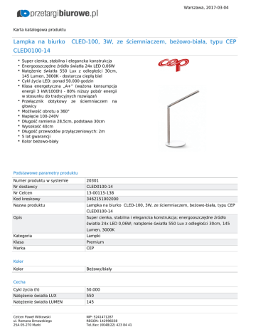 Warszawa, 2017-03-04 Karta katalogowa produktu Lampka na biurko CLED-100, 3W, ze ściemniaczem, beżowo-biała, typu CEP CLED0100-14 Super cienka, stabilna i elegancka konstrukcja Energooszczędne źródło światła 24x LED 0,06W Natężenie światła 550 Lux z odległości 30cm, 145 Lumen, 3000K - dostarcza ciepłą biel Cykl życia LED: ponad 50.000 godzin Klasa energetyczna „A+” (ważona konsumpcja energii 3 kW/1000h) - 80% niższy pobór energii w stosunku do tradycyjnych rozwiązań Przełącznik dotykowy ze ściemniaczem na głowicy Możliwość obrotu o 360° Napięcie 100-240V Długość ramienia 28,5cm, podstawa 30cm Wysokość 40cm Długość przewodów przyłączeniowych: 2m 5 lat gwarancji Kolor beżowo-biały Podstawowe parametry produktu Numer produktu w systemie 20301 Nr dostawcy CLED0100-14 Nr Celcen 13-00115-138 Kod kreskowy 3462151002000 Nazwa produktu Lampka na biurko CLED-100, 3W, ze ściemniaczem, beżowo-biała, typu CEP CLED0100-14 Opis Super cienka, stabilna i elegancka konstrukcja; energooszczędne źródło światła 24x LED 0,06W; natężenie światła 550 Lux z odległości 30cm, 145 Lumen, 3000K Kategoria Lampki Klasa Premium Marka CEP Kolor Kolor Beżowy/biały Cecha Cykl życia (h) 50.000 Natężenie światła LUX 550 Natężenie światła LUMEN 145 Celcen Paweł Witkowski ul. Romana Dmowskiego 25A 05-270 Marki NIP: 5241471287 REGON: 142996558 Tel./fax: (0048/22) 423 84 41 Warszawa, 2017-03-04 Karta katalogowa produktu cd. Lampka na biurko CLED-100, 3W, ze ściemniaczem, beżowo-biała, typu CEP CLED0100-14 Materiał Metal/plastik Produkt Lampka stojąca Rodzaj 3W Typ LED W ofercie od 2014-03 Klasa energetyczna A+ Wymiary Rozmiar 3W Wysokość (mm) B.d. Certyfikaty Hit Standard Ilość lat gwarancji 5 Nowy produkt w ofercie Standard Wspólny słownik zamówień CPV 31521100-5 Lampy na biurko Zamiennik Zamiennik 2001000201 Jesteśmy przekonani, że z pomocą przetargibiurowe.pl usprawnicie Państwo własne procesy biznesowe związane ze żmudnym poszukiwaniem odpowiadających Państwu produktów oraz opracowaniem specyfikacjii zapytań ofertowych. Serdecznie zapraszamy do wspópracy Zespół, PrzetargiBiurowe.pl Celcen Paweł Witkowski ul. Romana Dmowskiego 25A 05-270 Marki NIP: 5241471287 REGON: 142996558 Tel./fax: (0048/22) 423 84 41