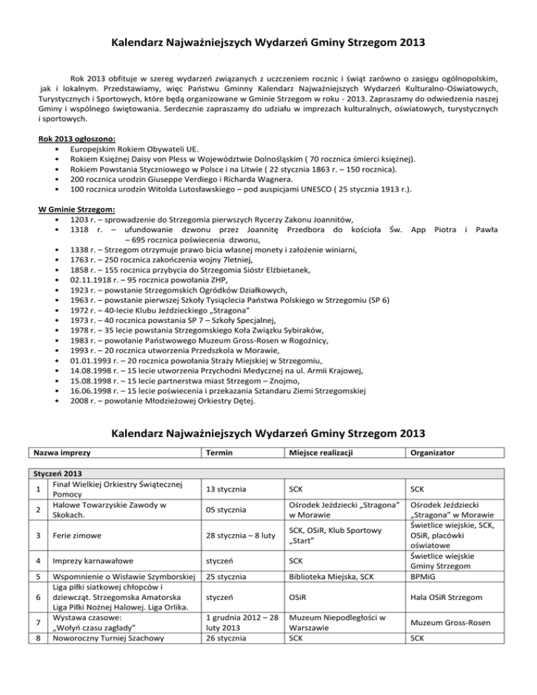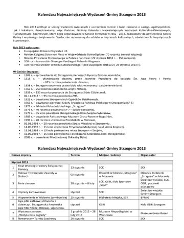Kalendarz Najważniejszych Wydarzeń Gminy Strzegom 2013