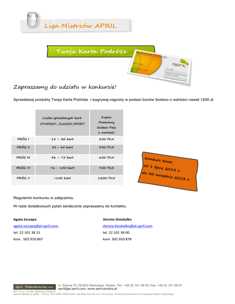 Liga Mistrzów APRIL Twoja Karta Podróże Zapraszamy do udziału w konkursie! Sprzedawaj produkty Twoja Karta Podróże i wygrywaj nagrody w postaci bonów Sodexo o wartości nawet 1200 zł. Liczba sprzedanych kart: STUDENT, CLASSIC,SPORT Kupon Premiowy Sodexo Pass o wartości PRÓG I 15 – 30 kart 250 PLN PRÓG II 31– 45 kart 350 PLN PRÓG III 46 – 75 kart 650 PLN PRÓG IV 76 - 150 kart 950 PLN PRÓG V >150 kart 1200 PLN Regulamin konkursu w załączeniu. W razie dodatkowych pytań serdecznie zapraszamy do kontaktu. Agata Szczapa Dorota Dziubałko [email protected], [email protected] tel. 22 101 38 15 tel. 22 101 38 00 kom. 502 910 867 kom. 502 910 878 ul. Sienna 73, 00-833 Warszawa, Polska, Tel.: +48 22 101 38 00, Fax: +48 22 101 38 01 [email protected], www.april-polska.pl NIP 113-21-16-390, REGON 013244077 kapitał zakładowy spółki – 100 tys. PLN, KRS 0000314202, Sąd Rejonowy dla m.st. Warszawy, XII Wydział Gospodarczy Krajowego Rejestru Sądowego Regulamin Konkursu pt. „Liga Mistrzów APRIL” organizowanego przez APRIL POLSKA SERVICE Spółka z o.o. §1 1. Organizatorem Konkursu jest APRIL POLSKA SRVICE Spółka z o.o. z siedzib w Warszawie przy ul. Siennej 73-00-833 Warszawa, zwaną dalej Organizatorem. 2. Konkurs prowadzony będzie w terminie od 01 lipca 2013 r. do 30 września 2013 r. 3. Niniejszy Regulamin („Regulamin”) jest dokumentem zawierającym warunki uczestnictwa w Konkursie oraz ustalającym zasady obowiązujące pomiędzy Uczestnikiem Konkursu a Organizatorem. §2 1. Konkurs skierowany jest do współpracowników Organizatora posiadającymi status Pośrednika Ubezpieczeniowego lub Partnera Współpracującego z Organizatorem, zwanymi dalej Uczestnikiem. 2. Użyte w Regulaminie Konkursu określenia oznaczają: 1) Pośrednik Ubezpieczeniowy – osoba fizyczna prowadząca działalność gospodarczą lub osoba prawna lub osoba nie posiadająca osobowości prawnej, której przepisy szczególne przyznają zdolność prawną, zawierająca we współpracy z Organizatorem Umowy ubezpieczenia na podstawie umowy o współpracy zawartej z Organizatorem; 2) Partner Współpracujący osoba fizyczna prowadząca działalność gospodarczą lub osoba prawna lub osoba nie posiadająca osobowości prawnej, której przepisy szczególne przyznają zdolność prawną, zawierająca we współpracy z Organizatorem Umowy ubezpieczenia na podstawie umowy o współpracy zawartej z Organizatorem 3) Produkt – Twoja Karta Podróże STUDENT, Twoja Karta Podróże CLASSIC, Twoja Karta Podróże SPORT 3. Uczestnictwo w Konkursie jest dobrowolne. 4. Za prawidłowy przebieg Konkursu, weryfikację wyników oraz ogłoszenie wyników ostatecznych odpowiedzialna jest Komisja Konkursowa. §3 1. Uczestników uprawnionych do otrzymania nagrody w związku z uczestnictwem w Konkursie wyłania Komisja. 2. Podstawą do przyznania nagrody w Konkursie jest uzyskanie lub przekroczenie progów sprzedażowych Produktu w okresie trwania Konkursu. 3. Wyniki Konkursu zostaną ustalone w terminie 30 dni od daty zakończenia Konkursu na podstawie danych sprzedażowych będących w posiadaniu Organizatora. 4. Ostateczne wyniki Konkursu zostaną podane do wiadomości Uczestników w terminie do dnia 30 października 2013 r. § 4 ul. Sienna 73, 00-833 Warszawa, Polska, Tel.: +48 22 101 38 00, Fax: +48 22 101 38 01 [email protected], www.april-polska.pl NIP 113-21-16-390, REGON 013244077 kapitał zakładowy spółki – 100 tys. PLN, KRS 0000314202, Sąd Rejonowy dla m.st. Warszawy, XII Wydział Gospodarczy Krajowego Rejestru Sądowego 1. Nagrody w Konkursie przyznawane są Uczestnikom, którzy w okresie obowiązywania Konkursu uzyskali wynik na sprzedaży Produktu uprawniający do otrzymania Nagrody. 2. Ustala się następujące progi sprzedażowe z podziałem na kategorie oraz przypisane im nagrody: PRÓG I PRÓG II PRÓG III PRÓG IV PRÓG V Liczba sprzedanych kart: STUDENT, CLASSIC,SPORT (łącznie) Kupon Premiowy Sodexo Pass o wartości 15 – 30 kart 250 PLN 31– 45 kart 350 PLN 46 – 75 kart 650 PLN 76 - 150 kart 950 PLN >150 kart 1200 PLN 3. Wyniki uzyskane przez poszczególnych Uczestników nie mogą być łączone. 4. Nagrody przyznane Uczestnikom zostaną wysłane na ich adresy. §5 1. Organizator zastrzega sobie prawo do modyfikowania niniejszego Regulaminu w każdym czasie. 2. W przypadku zmiany Regulaminu Organizator będzie zobowiązany do poinformowania uczestników konkursu o zmianie oraz udostępnienia Uczestnikom obowiązującego Regulaminu. 3. Regulamin dostępny jest w siedzibie Organizatora. 4. Skład komisji: Leszek Gierada – Przewodniczący Komisji, Dorota Dziubałko, Agata Szczapa 5. Ilość wygranych: nieograniczona, do otrzymania nagrody, uprawniony będzie każdy uczestnik, który spełni warunki określone w § 4ust. 2. 6. Odwołania od decyzji Komisji mogą być przesyłane na adres organizatora w ciągu 14 dni od daty ogłoszenia wyników. ul. Sienna 73, 00-833 Warszawa, Polska, Tel.: +48 22 101 38 00, Fax: +48 22 101 38 01 [email protected], www.april-polska.pl NIP 113-21-16-390, REGON 013244077 kapitał zakładowy spółki – 100 tys. PLN, KRS 0000314202, Sąd Rejonowy dla m.st. Warszawy, XII Wydział Gospodarczy Krajowego Rejestru Sądowego
