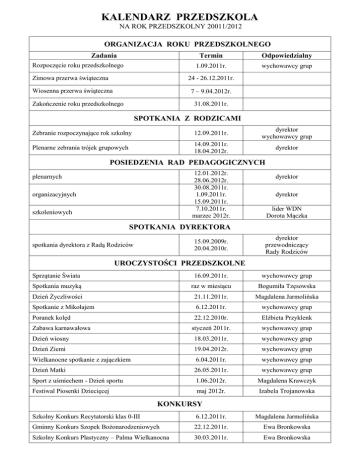 KALENDARZ PRZEDSZKOLA NA ROK PRZEDSZKOLNY 20011/2012 ORGANIZACJA ROKU PRZEDSZKOLNEGO Zadania Rozpoczęcie roku przedszkolnego Zimowa przerwa świąteczna Termin Odpowiedzialny 1.09.2011r. wychowawcy grup 24 - 26.12.2011r. Wiosenna przerwa świąteczna 7 – 9.04.2012r. Zakończenie roku przedszkolnego 31.08.2011r. SPOTKANIA Z RODZICAMI Zebranie rozpoczynające rok szkolny 12.09.2011r. dyrektor wychowawcy grup Plenarne zebrania trójek grupowych 14.09.2011r. 18.04.2012r. dyrektor POSIEDZENIA RAD PEDAGOGICZNYCH 12.01.2012r. 28.06.2012r. 30.08.2011r. 1.09.2011r. 15.09.2011r. 7.10.2011r. marzec 2012r. plenarnych organizacyjnych szkoleniowych dyrektor dyrektor lider WDN Dorota Mączka SPOTKANIA DYREKTORA 15.09.2009r. 20.04.2010r. spotkania dyrektora z Radą Rodziców dyrektor przewodniczący Rady Rodziców UROCZYSTOŚCI PRZEDSZKOLNE Sprzątanie Świata 16.09.2011r. wychowawcy grup Spotkania muzyką raz w miesiącu Bogumiła Tzęsowska Dzień Życzliwości 21.11.2011r. Magdalena Jarmolińska Spotkanie z Mikołajem 6.12.2011r. wychowawcy grup Poranek kolęd 22.12.2010r. Elżbieta Przyklenk styczeń 2011r. wychowawcy grup Dzień wiosny 18.03.2011r. wychowawcy grup Dzień Ziemi 19.04.2012r. wychowawcy grup Wielkanocne spotkanie z zajączkiem 6.04.2011r. wychowawcy grup Dzień Matki 26.05.2011r. wychowawcy grup Sport z uśmiechem - Dzień sportu 1.06.2012r. Magdalena Krawczyk Festiwal Piosenki Dziecięcej maj 2012r. Izabela Trojanowska Zabawa karnawałowa KONKURSY Szkolny Konkurs Recytatorski klas 0-III 6.12.2011r. Magdalena Jarmolińska Gminny Konkurs Szopek Bożonarodzeniowych 22.12.2011r. Ewa Bronkowska Szkolny Konkurs Plastyczny – Palma Wielkanocna 30.03.2011r. Ewa Bronkowska