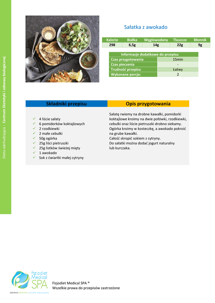 Sałatka z awokado Dieta odchudzająca - Centrum Dietetyki i odnowy biologicznej Kalorie 298 Białka 6,5g Węglowodany 14g Tłuszcze 22g Informacje dodatkowe do przepisu Czas przygotowania 15min Czas pieczenia Trudność przepisu Łatwy Wykonane porcje: 2 Składniki przepisu 4 liście sałaty 6 pomidorków koktajlowych 2 rzodkiewki 2 małe cebulki 50g ogórka 25g liści pietruszki 25g listków świeżej mięty 1 awokado Sok z ćwiartki małej cytryny Opis przygotowania Sałatę rwiemy na drobne kawałki, pomidorki koktajlowe kroimy na dwie połówki, rzodkiewki, cebulki oraz liście pietruszki drobno siekamy. Ogórka kroimy w kosteczkę, a awokado pokroić na grube kawałki. Całość skropić sokiem z cytryny. Do sałatki można dodać jogurt naturalny lub kurczaka. Fizjodiet Medical SPA ® Wszelkie prawa do przepisów zastrzeżone Błonnik 9g