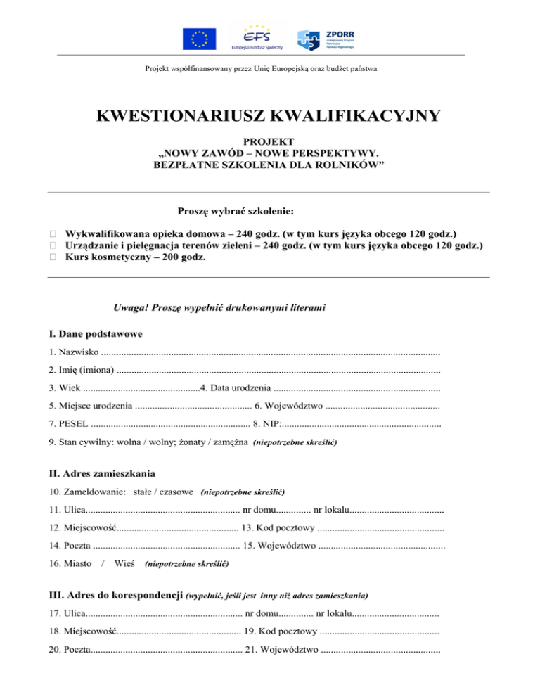 Projekt współfinansowany przez Unię Europejską oraz budŜet państwa KWESTIONARIUSZ KWALIFIKACYJNY PROJEKT „NOWY ZAWÓD – NOWE PERSPEKTYWY. BEZPŁATNE SZKOLENIA DLA ROLNIKÓW” Proszę wybrać szkolenie: Wykwalifikowana opieka domowa – 240 godz. (w tym kurs języka obcego 120 godz.) Urządzanie i pielęgnacja terenów zieleni – 240 godz. (w tym kurs języka obcego 120 godz.) Kurs kosmetyczny – 200 godz. Uwaga! Proszę wypełnić drukowanymi literami I. Dane podstawowe 1. Nazwisko ........................................................................................................................................ 2. Imię (imiona) .................................................................................................................................. 3. Wiek ...............................................4. Data urodzenia ................................................................... 5. Miejsce urodzenia ............................................... 6. Województwo .............................................. 7. PESEL ................................................................ 8. NIP:................................................................ 9. Stan cywilny: wolna / wolny; Ŝonaty / zamęŜna (niepotrzebne skreślić) II. Adres zamieszkania 10. Zameldowanie: stałe / czasowe (niepotrzebne skreślić) 11. Ulica.............................................................. nr domu.............. nr lokalu...................................... 12. Miejscowość................................................. 13. Kod pocztowy ................................................... 14. Poczta ........................................................... 15. Województwo ................................................... 16. Miasto / Wieś (niepotrzebne skreślić) III. Adres do korespondencji (wypełnić, jeśli jest inny niŜ adres zamieszkania) 17. Ulica............................................................... nr domu.............. nr lokalu................................... 18. Miejscowość.................................................. 19. Kod pocztowy ................................................ 20. Poczta............................................................. 21. Województwo ................................................ IV. Dane kontaktowe 22. Tel. domowy ............................................... 23. Tel. kom. ...................................................... 24. Tel. do pracy ............................................... 25. Email ............................................................ V. Dane dodatkowe 26. Wykształcenie (proszę wybrać z poniŜszych moŜliwości): wyŜsze magisterskie z tytułem magistra, lekarza lub równorzędnym wyŜsze zawodowe z tytułem licencjata, inŜyniera lub równorzędnym policealne średnie ogólnokształcące średnie zawodowe zasadnicze zawodowe ponadgimnazjalne gimnazjalne podstawowe niepełne podstawowe 27. Pochodzenie: Miasto / Wieś (niepotrzebne skreślić) VI. Dane dotyczące zatrudnienia 28. Zawód wykonywany (proszę wybrać z poniŜszych moŜliwości): urzędnik specjalista nauk fizycznych, matematycznych i technicznych specjalista nauk przyrodniczych i ochrony zdrowia specjalista szkolnictwa średni personel techniczny średni personel w zakresie nauk biologicznych i ochrony zdrowia nauczyciel praktycznej nauki zawodu i instruktorzy pracownik pozostałych specjalności pracownik obsługi biurowej pracownik obrotu pienięŜnego i obsługi klientów pracownik usług osobistych i ochrony pracownik sektora badawczo naukowego modelka, sprzedawca i demonstrator rolnik doradca rolniczy ogrodnik leśnik i rybak rolnik i rybak pracujący na własne potrzeby górnik i robotnik budowlany robotnik obróbki metali i mechanicy maszyn i urządzeń robotnik zawodów precyzyjnych, ceramicy, wytwórcy wyrobów galanteryjnych, robotnicy poligrafii pozostali robotnicy przemysłowi i rzemieślnicy operator maszyn i urządzeń wydobywczych i przetwórczych operator i monter maszyn kierownik i operator pojazdów pracownik przy pracach prostych w handlu i usługach robotnik pomocniczy w górnictwie, przemyśle, budownictwie i transporcie inne: ............................................................................................................... VII. Załączniki Do Kwestionariusza Kwalifikacyjnego załączam: Kopię dowodu osobistego Kopię zaświadczenia z KRUS Kopię nakazu płatniczego VIII. Oświadczenia Oświadczam, Ŝe: Zapoznałem się z Regulaminem Projektu „Nowy zawód – nowe perspektywy. Bezpłatne szkolenia dla rolników” i zobowiązuję się do udziału w projekcie na warunkach określonych w Regulaminie Projektu i umowie uczestnictwa. Spełniam kryteria Beneficjenta Ostatecznego dla Działania 2.3 ZPORR określone w Regulaminie Projektu – jestem: rolnikiem / domownikiem (niepotrzebne skreślić) WyraŜam zgodę na wykorzystanie i przetwarzanie przez organizatora projektu oraz przez Wojewódzki Urząd Pracy w Lublinie moich danych na potrzeby związane z realizacją projektu i jego monitoringiem (zgodnie z ustawą z dnia 29.08.1997 o ochronie danych osobowych Dz.U. 02.101.926). PowyŜsze dane przedstawione przeze mnie w związku z udziałem w projekcie odpowiadają stanowi faktycznemu i jestem świadomy/a odpowiedzialności karnej za podanie nieprawdziwych danych. .................................................... ........................................................... Miejscowość, data Podpis IX. Przetwarzanie danych osobowych w celach marketingowych WyraŜam zgodę / nie wyraŜam zgody na przetwarzanie moich danych w celach marketingowych przez Lubelską Szkołę Biznesu z siedzibą w Lublinie, ul. Konstantynów 1H. Podanie danych jest dobrowolne. Oświadczam, Ŝe zostałem poinformowany o prawie dostępu do treści moich danych oraz prawie ich poprawiania. WyraŜam zgodę Nie wyraŜam zgody ......................................................