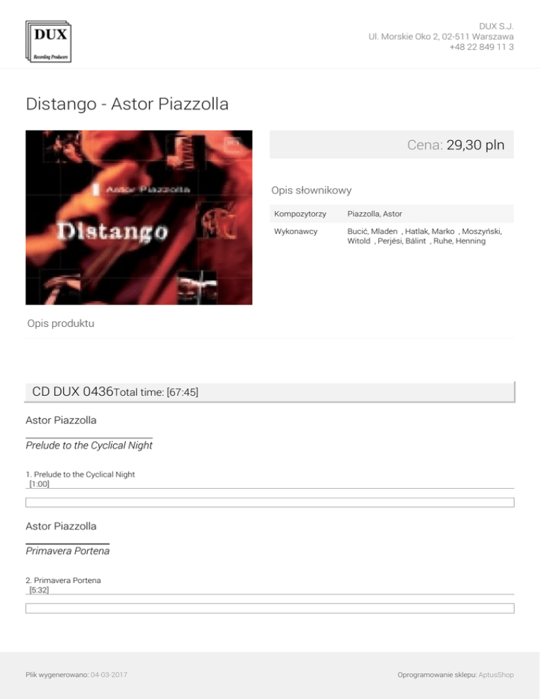 DUX S.J. Ul. Morskie Oko 2, 02-511 Warszawa +48 22 849 11 3 Distango - Astor Piazzolla Cena: 29,30 pln Opis słownikowy Kompozytorzy Piazzolla, Astor ∎ Wykonawcy Bucić, Mladen ∎, Hatlak, Marko ∎, Moszyński, Witold ∎, Perjési, Bálint ∎, Ruhe, Henning ∎ Opis produktu CD DUX 0436Total time: [67:45] Astor Piazzolla Prelude to the Cyclical Night 1. Prelude to the Cyclical Night [1:00] Astor Piazzolla Primavera Portena 2. Primavera Portena [5:32] Plik wygenerowano: 04-03-2017 Oprogramowanie sklepu: AptusShop DUX S.J. Ul. Morskie Oko 2, 02-511 Warszawa +48 22 849 11 3 Astor Piazzolla Biyuya 3. Biyuya [6:18] Astor Piazzolla Soledad 4. Soledad [9:05] Astor Piazzolla Verano Porteno 5. Verano Porteno [6:26] Astor Piazzolla Resurrección del Ángel 6. Resurrección del Ángel [7:15] Astor Piazzolla Contrabajisimo 7. Contrabajisimo [12:12] Astor Piazzolla Plik wygenerowano: 04-03-2017 Oprogramowanie sklepu: AptusShop DUX S.J. Ul. Morskie Oko 2, 02-511 Warszawa +48 22 849 11 3 Michelangelo 70 8. Michelangelo 70 [2:49] Astor Piazzolla Milonga del Ángel 9. Milonga del Ángel [7:38] Astor Piazzolla Concierto para Quinteto 10. Concierto para Quinteto [9:32] Wykonawcy: Bálint Perjési /skrzypce/ Henning Ruhe /fortepian/ Marko Hatlak /akordeon/ Mladen Bucić /gitara/ Witold Moszyński /kontrabas/ Plik wygenerowano: 04-03-2017 Powered by TCPDF (www.tcpdf.org) Oprogramowanie sklepu: AptusShop