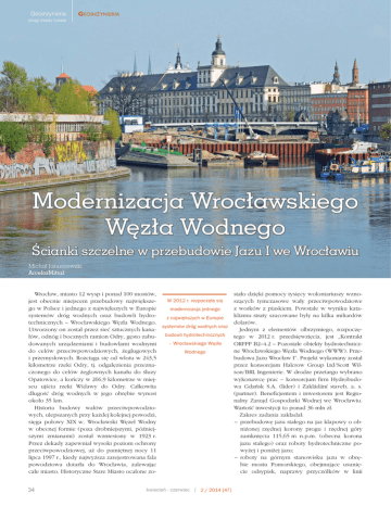 Geoinżynieria GEOINŻYNIERIA drogi mosty tunele Modernizacja Wrocławskiego Węzła Wodnego Ścianki szczelne w przebudowie Jazu I we Wrocławiu Michał Januszewski ArcelorMittal Wrocław, miasto 12 wysp i ponad 100 mostów, W 2012 r. rozpoczęła się jest obecnie miejscem przebudowy największego w Polsce i jednego z największych w Europie modernizacja jednego systemów dróg wodnych oraz budowli hydroz największych w Europie technicznych – Wrocławskiego Węzła Wodnego. systemów dróg wodnych oraz Utworzony on został przez sieć sztucznych kanałów, odnóg i bocznych ramion Odry, gęsto zabu- budowli hydrotechnicznych – Wrocławskiego Węzła dowanych urządzeniami i budowlami wodnymi do celów przeciwpowodziowych, żeglugowych Wodnego i przemysłowych. Rozciąga się od wlotu w 243,5 kilometrze rzeki Odry, tj. odgałęzienia przeznaczonego do celów żeglownych kanału do śluzy Opatowice, a kończy w 266,9 kilometrze w miejscu ujścia rzeki Widawy do Odry. Całkowita długość dróg wodnych w jego obrębie wynosi około 35 km. Historia budowy wałów przeciwpowodziowych, ulepszanych przy każdej kolejnej powodzi, sięga połowy XIX w. Wrocławski Węzeł Wodny w obecnej formie (poza drobniejszymi, późniejszymi zmianami) został wzniesiony w 1923 r. Przez dekady zapewniał wysoki poziom ochrony przeciwpowodziowej, aż do pamiętnej nocy 11 lipca 1997 r., kiedy najwyższa zarejestrowana fala powodziowa dotarła do Wrocławia, zalewając całe miasto. Historyczne Stare Miasto ocalone zo34 kwiecień - czerwiec 2 / 2014 [47] stało dzięki pomocy tysięcy wolontariuszy wznoszących tymczasowe wały przeciwpowodziowe z worków z piaskiem. Powstałe w wyniku kataklizmu straty szacowane były na kilka miliardów dolarów. Jednym z elementów olbrzymiego, rozpoczętego w 2012 r. przedsięwzięcia, jest „Kontrakt ORFPP B2–4.2 – Pozostałe obiekty hydrotechniczne Wrocławskiego Węzła Wodnego (WWW). Przebudowa Jazu Wrocław I”. Projekt wykonany został przez konsorcjum Halcrow Group Ltd/Scott Wilson/BRL Ingenierie. W drodze przetargu wybrano wykonawcę prac – konsorcjum firm Hydrobudowa Gdańsk S.A. (lider) i Zakládání staveb, a. s. (partner). Beneficjentem i inwestorem jest Regionalny Zarząd Gospodarki Wodnej we Wrocławiu. Wartość inwestycji to ponad 36 mln zł. Zakres zadania zakładał: – przebudowę jazu stałego na jaz klapowy o obniżonej rzędnej korony progu i rzędnej góry zamknięcia 115,65 m n.p.m. (obecna korona jazu stałego) oraz roboty hydrotechniczne powyżej i poniżej jazu; – roboty na górnym stanowisku jazu w obrębie mostu Pomorskiego, obejmujące usunięcie odsypisk, naprawy przyczółków w linii GEOINŻYNIERIA Geoinżynieria drogi mosty tunele 2. 3. Fot. 1. Fot. 2. Fot. 3. Jaz Wrocław I – widok z mostu Sikorskiego Jaz Wrocław I – grodza jazu Jaz Wrocław I – widok od strony WD przywodnej oraz wzmocnienie ubezpieczeń dna rzeki pomiędzy mostem a jazem; – wykonanie dotychczas nieistniejącej dwukierunkowej przepławki dla ryb w celu uzyskania ciągłości morfologicznej rzeki. Technologia prac Technologia zabezpieczeń w postaci stalowych ścianek szczelnych odegrała istotną rolę w opisywanym przedsięwzięciu. Projekt przebudowy jazu przewidywał m.in. wykonanie, pod osłoną gródz stalowych i istniejącego jazu, nowego progu jazowego z galerią komunikacyjną, o długości (łącznie z niecką wypadu) ok. 24,8 m, szerokości całkowitej 62 m, w tym dwóch przęseł o szerokości po 22 m, z filarem o szerokości 4,0 i przyczółkiem lewym o szerokości 3 m i prawym ze sterownią o zmiennej szerokości 7–11 m. Grodze wykonano od strony wody dolnej, poniżej istniejących ubezpieczeń betonowych dna. Konstrukcję powiązano ze ścianką okalającą prawy przyczółek jazu ze sterownią. Ścianka szczelna od strony progu istniejącego jazu, równoległa do osi jazu i usytuowana w licu projektowanej budowli, pełniła rolę deskowania traconego i zabezpieczenia przeciwfiltracyjnego nowej budowli. Od strony wody górnej funkcję grodzy pełniły istniejące zamknięcia obu upustów oraz jaz stały. Po zakończeniu robót ścianka stalowa od strony wody dolnej obcięta zostanie na poziomie niecki wypadowej i pozostawiona jako zabezpieczenie przeciwerozyjne i przeciwfiltracyjne jazu. kwiecień - czerwiec Zgodnie z wymaganiami rozporządzenia Ministra Środowiska z dnia 20 kwietnia 2007 r. w sprawie warunków technicznych, jakim powinny odpowiadać budowle hydrotechniczne i ich usytuowanie, dla potrzeb projektu budowlanego wykonano hydrauliczne badania modelowe zdolności przepustowej i kształtu budowli, które wykazały potrzebę poprawy warunków hydraulicznych napływu na jaz. W tym celu zaprojektowano przebudowę murów oporowych na brzegu prawym od strony wody górnej. Projektowana budowla usytuowana jest w łuku, pomiędzy przyczółkiem istniejącego mostu a projektowanym prawym przyczółkiem jazu, zachowując istniejące zmienne rzędne korony (118,1–117,7 m Kr) i terenu przyległego. Roboty w pierwszym etapie, przewidującym obniżenie terenu do rzędnych 116,30 m Kr, wykonywano pod osłoną istniejących murów. Właściwa budowa nowej konstrukcji oporowej o długości ok. 61 m zrealizowana została pod osłoną grodzy ze stalowych ścianek szczelnych. Dno rzeki na odcinku pomiędzy nową konstrukcją a istniejącymi ubezpieczeniami dna zabezpieczono materacami siatkowo-kamiennymi o grubości 0,5 m. Grodza dla budowy przepławki powiązana została z grodzą jazu. Jej trasa przebiega równolegle do nabrzeża brzegu lewego. Ścianki grodzy wzmocnione zostały kotwami wierconymi, gruntowymi. Po zakończeniu robót ścianka stalowa grodzy zostanie obcięta na poziomie korony ścian przepławki. Projektowana przepławka posiadać będzie łącznie 38 komór, w tym 35 komór o długości (w osi przegród) 4,4 m i 3 komory spoczynkowe długości 8,8 m, o szerokości wewnętrznej komór 5 m i napełnieniu 1,8 m, spadku
