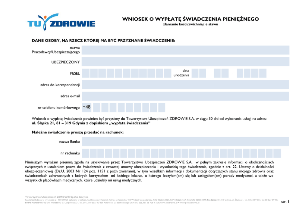 WNIOSEK O WYPŁATĘ ŚWIADCZENIA PIENIĘŻNEGO złamanie kości/zwichnięcie stawu DANE OSOBY, NA RZECZ KTÓREJ MA BYĆ PRZYZNANE ŚWIADCZENIE: nazwa Pracodawcy/Ubezpieczającego UBEZPIECZONY data urodzenia PESEL - - adres do korespondencji adres e-mail nr telefonu komórkowego +48 Wniosek o wypłatę świadczenia powinien być przysłany do Towarzystwa Ubezpieczeń ZDROWIE S.A. w ciągu 30 dni od wykonania usługi na adres: ul. Śląska 21, 81 – 319 Gdynia z dopiskiem „wypłata świadczenia” Należne świadczenie proszę przesłać na rachunek: nazwa Banku nr rachunku Niniejszym wyrażam pisemną zgodę na uzyskiwanie przez Towarzystwo Ubezpieczeń ZDROWIE S.A. w pełnym zakresie informacji o okolicznościach związanych z ustaleniem prawa do świadczenia z zawartej umowy ubezpieczenia i wysokością tego świadczenia, zgodnie z art. 22. Ustawy o działalności ubezpieczeniowej (Dz.U. 2003 Nr 124 poz. 1151 z późn zmianami), w tym wszelkich informacji i dokumentacji dotyczących stanu mojego zdrowia oraz świadczeniach zdrowotnych z których korzystałem od każdego lekarza, u którego leczyłem(am) się lub zasięgałem(am) porady medycznej, a także we wszystkich placówkach medycznych, które udzielały mi usług medycznych. Towarzystwo Ubezpieczeń ZDROWIE Spółka Akcyjna Kapitał zakładowy w wysokości 21 950 000 zł. opłacony w całości, Sąd Rejonowy Gdańsk-Północ w Gdańsku, VIII Wydział Gospodarczy, KRS 0000362027, NIP 5862257567, REGON 221064894; Siedziba: 81-319 Gdynia, ul. Śląska 21, tel. 58 728 9 555, fax 58 627 59 95; Biura Handlowe: 02-071 Warszawa, ul. Langiewicza 31, tel. 58 728 9 555; 40-859 Katowice, ul. Bocheńskiego 38A lok. 225, tel. 58 728 9 509; www.tuzdrowie.pl • www.polisalekowa.pl str. 1 WNIOSEK O WYPŁATĘ ŚWIADCZENIA PIENIĘŻNEGO złamanie kości/zwichnięcie stawu ZDARZENIE UBEZPIECZENIOWE: w okienku przy nazwie świadczenia prosimy o zaznaczenie, którego świadczenia dotyczy wniosek, wypełnienie pozostałych danych i wpisanie liczby kopii dokumentacji medycznej złamanie kości dzień złamania nazwa podmiotu leczniczego udzielającego 1szej pomocy dzień udzielenia 1szej pomocy dzień zwichnięcia nazwa podmiotu leczniczego udzielającego 1szej pomocy dzień udzielenia 1szej pomocy zwichnięcie stawu Do wniosku dołączam kopie: badania RTG badania USG karty ze Szpitalnego Oddziału Ratunkowego karty z pobytu w szpitalu zaświadczenia z punktu pomocy doraźnej szt. szt. szt. szt. szt. inne, proszę podać jakie szt. inne, proszę podać jakie szt. Oświadczam, że wszystkie podane dobrowolnie dane zawarte w tym wniosku są prawdziwe i zgodne z moją najlepszą wiedzą. . podpis Ubezpieczonego lub opiekuna prawnego Towarzystwo Ubezpieczeń ZDROWIE Spółka Akcyjna Kapitał zakładowy w wysokości 21 950 000 zł. opłacony w całości, Sąd Rejonowy Gdańsk-Północ w Gdańsku, VIII Wydział Gospodarczy, KRS 0000362027, NIP 5862257567, REGON 221064894; Siedziba: 81-319 Gdynia, ul. Śląska 21, tel. 58 728 9 555, fax 58 627 59 95; Biura Handlowe: 02-071 Warszawa, ul. Langiewicza 31, tel. 58 728 9 555; 40-859 Katowice, ul. Bocheńskiego 38A lok. 225, tel. 58 728 9 509; www.tuzdrowie.pl • www.polisalekowa.pl str. 2
