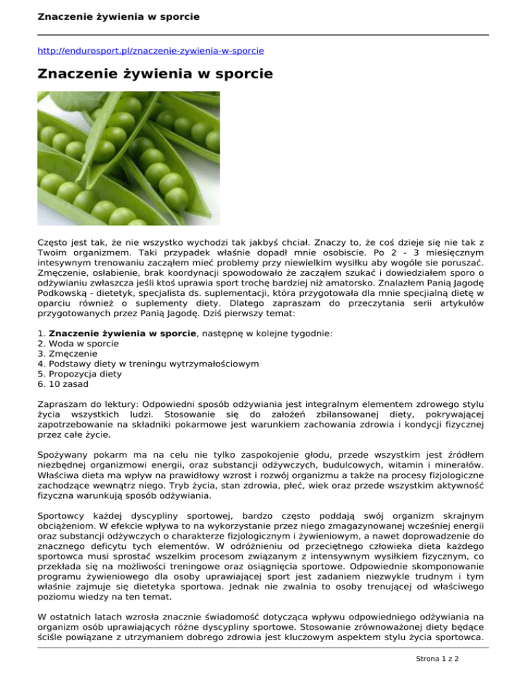 Znaczenie żywienia w sporcie http://endurosport.pl/znaczenie-zywienia-w-sporcie Znaczenie żywienia w sporcie Często jest tak, że nie wszystko wychodzi tak jakbyś chciał. Znaczy to, że coś dzieje się nie tak z Twoim organizmem. Taki przypadek właśnie dopadł mnie osobiscie. Po 2 - 3 miesięcznym intesywnym trenowaniu zacząłem mieć problemy przy niewielkim wysiłku aby wogóle sie poruszać. Zmęczenie, osłabienie, brak koordynacji spowodowało że zacząłem szukać i dowiedziałem sporo o odżywianiu zwłaszcza jeśli ktoś uprawia sport trochę bardziej niż amatorsko. Znalazłem Panią Jagodę Podkowską - dietetyk, specjalista ds. suplementacji, która przygotowała dla mnie specjialną dietę w oparciu również o suplementy diety. Dlatego zapraszam do przeczytania serii artykułów przygotowanych przez Panią Jagodę. Dziś pierwszy temat: 1. 2. 3. 4. 5. 6. Znaczenie żywienia w sporcie, następnę w kolejne tygodnie: Woda w sporcie Zmęczenie Podstawy diety w treningu wytrzymałościowym Propozycja diety 10 zasad Zapraszam do lektury: Odpowiedni sposób odżywiania jest integralnym elementem zdrowego stylu życia wszystkich ludzi. Stosowanie się do założeń zbilansowanej diety, pokrywającej zapotrzebowanie na składniki pokarmowe jest warunkiem zachowania zdrowia i kondycji fizycznej przez całe życie. Spożywany pokarm ma na celu nie tylko zaspokojenie głodu, przede wszystkim jest źródłem niezbędnej organizmowi energii, oraz substancji odżywczych, budulcowych, witamin i minerałów. Właściwa dieta ma wpływ na prawidłowy wzrost i rozwój organizmu a także na procesy fizjologiczne zachodzące wewnątrz niego. Tryb życia, stan zdrowia, płeć, wiek oraz przede wszystkim aktywność fizyczna warunkują sposób odżywiania. Sportowcy każdej dyscypliny sportowej, bardzo często poddają swój organizm skrajnym obciążeniom. W efekcie wpływa to na wykorzystanie przez niego zmagazynowanej wcześniej energii oraz substancji odżywczych o charakterze fizjologicznym i żywieniowym, a nawet doprowadzenie do znacznego deficytu tych elementów. W odróżnieniu od przeciętnego człowieka dieta każdego sportowca musi sprostać wszelkim procesom związanym z intensywnym wysiłkiem fizycznym, co przekłada się na możliwości treningowe oraz osiągnięcia sportowe. Odpowiednie skomponowanie programu żywieniowego dla osoby uprawiającej sport jest zadaniem niezwykle trudnym i tym właśnie zajmuje się dietetyka sportowa. Jednak nie zwalnia to osoby trenującej od właściwego poziomu wiedzy na ten temat. W ostatnich latach wzrosła znacznie świadomość dotycząca wpływu odpowiedniego odżywiania na organizm osób uprawiających różne dyscypliny sportowe. Stosowanie zrównoważonej diety będące ściśle powiązane z utrzymaniem dobrego zdrowia jest kluczowym aspektem stylu życia sportowca. Strona 1 z 2 Znaczenie żywienia w sporcie Nie ma znaczenia czy należy on do sportowej elity przygotowującej się do mistrzostw świata lub wydarzeń olimpijskich, jest pół-profesjonalnym zawodnikiem pragnącym zwiększać swoje umiejętności i wyniki czy amatorem lubiącym sport, który trenuje dla przyjemności i chciałby kontynuować swoje treningi z biegiem lat. Coraz częściej mówi się, że odpowiednia dieta to połowa sukcesu! Autor: Jagoda Podkowska - dietetyk, specjalista ds. suplementacji Strona 2 z 2 Powered by TCPDF (www.tcpdf.org)