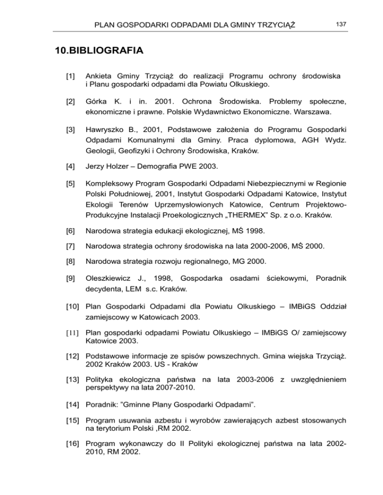 PLAN GOSPODARKI ODPADAMI DLA GMINY TRZYCIĄś 137 10.BIBLIOGRAFIA [1] Ankieta Gminy TrzyciąŜ do realizacji Programu ochrony środowiska i Planu gospodarki odpadami dla Powiatu Olkuskiego. [2] Górka [3] Hawryszko B., 2001, Podstawowe załoŜenia do Programu Gospodarki Odpadami Komunalnymi dla Gminy. Praca dyplomowa, AGH Wydz. Geologii, Geofizyki i Ochrony Środowiska, Kraków. [4] Jerzy Holzer – Demografia PWE 2003. [5] Kompleksowy Program Gospodarki Odpadami Niebezpiecznymi w Regionie K. i in. 2001. Ochrona Środowiska. Problemy społeczne, ekonomiczne i prawne. Polskie Wydawnictwo Ekonomiczne. Warszawa. Polski Południowej, 2001, Instytut Gospodarki Odpadami Katowice, Instytut Ekologii Terenów Uprzemysłowionych Katowice, Centrum ProjektowoProdukcyjne Instalacji Proekologicznych „THERMEX” Sp. z o.o. Kraków. [6] Narodowa strategia edukacji ekologicznej, MŚ 1998. [7] Narodowa strategia ochrony środowiska na lata 2000-2006, MŚ 2000. [8] Narodowa strategia rozwoju regionalnego, MG 2000. [9] Oleszkiewicz J., 1998, Gospodarka osadami ściekowymi, Poradnik decydenta, LEM s.c. Kraków. [10] Plan Gospodarki Odpadami dla Powiatu Olkuskiego – IMBiGS Oddział zamiejscowy w Katowicach 2003. [11] Plan gospodarki odpadami Powiatu Olkuskiego – IMBiGS O/ zamiejscowy Katowice 2003. [12] Podstawowe informacje ze spisów powszechnych. Gmina wiejska TrzyciąŜ. 2002 Kraków 2003. US - Kraków [13] Polityka ekologiczna państwa na lata 2003-2006 z uwzględnieniem perspektywy na lata 2007-2010. [14] Poradnik: ”Gminne Plany Gospodarki Odpadami”. [15] Program usuwania azbestu i wyrobów zawierających azbest stosowanych na terytorium Polski ,RM 2002. [16] Program wykonawczy do II Polityki ekologicznej państwa na lata 20022010, RM 2002. PLAN GOSPODARKI ODPADAMI DLA GMINY TRZYCIĄś 138 [17] Raporty o stanie środowiska na obszarze województwa małopolskiego, IOŚ WIOŚ w Krakowie, Kraków 1999, 2000, 2001, 2002. [18] Spójna polityka strukturalna rozwoju obszarów wiejskich i rolnictwa, MR i RW 1999. [19] Strategia rozwoju Gminy TrzyciąŜ, mgr inŜ.H.Kubit 1999. [20] Strategia zrównowaŜonego rozwoju Polski do roku 2025, MŚ 1999. [21] Studium uwarunkowań i kierunków zagospodarowania przestrzennego Gminy TrzyciąŜ - IGPiK Kraków 2000. [22] Wojewódzki Plan Gospodarki Odpadami na lata 2003-2010. Zarząd Województwa Małopolskiego – Załącznik do Uchwały Nr XI/125/03 Sejmiku Województwa Małopolskiego z dnia 25 sierpnia 2003 r. [23] Wybrane dane o powiatach i gminach województwa małopolskiego w 2001 roku, Urząd Statystyczny w Krakowie, 2002. [24] Wytyczne dotyczące zasad i zakresu uwzględniania zagadnień ochrony środowiska w programach sektorowych , RM 2002.