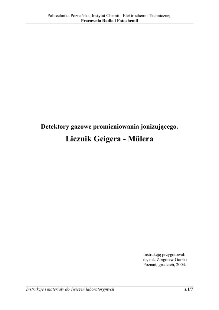 Politechnika Poznańska, Instytut Chemii i Elektrochemii Technicznej, Pracownia Radio i Fotochemii Detektory gazowe promieniowania jonizującego. Licznik Geigera - Mülera Instrukcję przygotował: dr, inż. Zbigniew Górski Poznań, grudzień, 2004. Instrukcje i materiały do ćwiczeń laboratoryjnych s.1/7 Politechnika Poznańska, Instytut Chemii i Elektrochemii Technicznej, Pracownia Radio i Fotochemii ` 1. CEL ĆWICZENIA Zapoznanie się z: - podstawami fizycznymi działania liczników gazowych ich konstrukcją przeznaczeniem, - parametrami pracy licznika Geigera –Müllera, - konstrukcją i obsługą przelicznika elektronowego. 2. APARATURA I ŹRÓDŁA PROMIENIOWANIA 1. Okienkowy licznik Geigera -Müllera typu BOH-45, umocowany w sondzie pomiarowej SSU i umieszczony w domku osłonnym. 2. Uniwersalny radiometr laboratoryjny URS-3 3. Źródło uranowe promieniowania na aluminiowej miseczce pomiarowej OPIS APARATURY 1. Licznik Geigera -Müllera, typu BOH -45 jest kielichowym licznikiem cienkookienkowym przeznaczonym do pomiarów promieniowania beta. Napięcie pracy licznika dobiera się w zakresie tzw. „ plateau” licznika, to jest w zakresie, w którym szybkość liczenia cząstek (N) z danego źródła beta w stałych warunkach geometrycznych, nie zależy od wielkości przyłożonego napięcia (V). Napięcie to może się wahać w zakresie od 300 do 2000V. Dobry licznik Geigera -Müllera powinno charakteryzować długie plateau (powyżej 200V), równoległe lub minimalnie nachylone (<3%) do osi napięciowej na wykresie N = f (V). 2. Uniwersalny radiometr laboratoryjny URS-3 jest przyrządem uniwersalnym dostosowanym do pomiarów natężenia promieniowania jonizującego detektorami gazowymi i scyntylacyjnymi (fot.1). Instrukcje i materiały do ćwiczeń laboratoryjnych s.2/7 Politechnika Poznańska, Instytut Chemii i Elektrochemii Technicznej, Pracownia Radio i Fotochemii ` 4 3 2 1 Fot.1. Uniwersalny radiometr laboratoryjny URS-3 1- zasilacz wysokiego napięcia, 2 – licznik impulsów, 3 – integrator impulsów, 4 – dyskryminator/analizator impulsów Stanowi zwarty układ modułów (fot.1.) zawierający: - regulowany zasilacz wysokiego napięcia 400-2800 V przeznaczony do zasilania sond pomiarowych z licznikami gazowymi i scyntylacyjnymi, - integrator impulsów - licznika impulsów elektrycznych pracującego, - przełączanego dyskryminatora/analizatora impulsów elektrycznych, Typowe stanowisko pomiarowe wykorzystujące uniwersalny radiometr laboratoryjny URS-3 przedstawia fotografia 2. Instrukcje i materiały do ćwiczeń laboratoryjnych s.3/7 Politechnika Poznańska, Instytut Chemii i Elektrochemii Technicznej, Pracownia Radio i Fotochemii ` 2 3 1 Fot.2. Typowe stanowisko pomiarowe wykorzystujące uniwersalny radiometr laboratoryjny URS-3 1 – radiometr, 2 – sonda pomiarowa, 3 – domek pomiarowy. Sonda pomiarowa zawierająca dostosowana do detekcji mierzonego promieniowania jest zasilana z wzmacniacz wysokiego napięcia. Sygnał pomiarowy detektora jest transmitowany do wzmacniacz liniowego gdzie następuje dopasowanie parametrów uzyskiwanego impulsu do możliwości toru pomiarowego radiometru. Po wzmocnieniu sygnał kierowany jest do dyskryminatora/analizatora wysokości impulsów. Jeżeli stosujemy dyskryminator impulsów następuje odrzucenie z ciągu impulsów napływających do radiometru tych, których amplituda jest mniejsza niż ustawiona pokrętłem „próg dyskryminacji”, a wysokość wszystkich pozostałych jest zmieniona do poziomy napięcia odpowiadającemu logicznej „1” (stan H) układu zliczającego. Stosując dyskryminator amplitudy możemy obniżyć udział różnego pochodzenia „szumów” i zmniejszyć udział tła promieniowania w ogólnym wyniku pomiaru. Eliminujemy impulsy pochodzące z detektora i pozostałej części toru pomiarowego o amplitudzie podprogowej. Jeżeli stosujemy analizator amplitudy impulsów (jednokanałowy analizator) z ciągu impulsów napływających z detektora zostaną odrzucone te, których wysokość jest mniejsza od dolnego i większa od górnego progu dyskryminacji. Wysokość impulsów mieszczących się między założonymi progami dyskryminacji zostanie zmieniona jak poprzednio do poziomy napięcia odpowiadającemu logicznej „1” (stan H) układu zliczającego. Podstawowym celem stosowania jednokanałowego analizatora amplitudy impulsów jest elektroniczna separacja sygnału pochodzącego od cząstek lub kwantów o precyzyjnie Instrukcje i materiały do ćwiczeń laboratoryjnych s.4/7 Politechnika Poznańska, Instytut Chemii i Elektrochemii Technicznej, Pracownia Radio i Fotochemii ` wybranym zakresie energii. Zabieg ten pozwala np. mierzyć ilość interesującego nas radioizotopu w mieszaninie kilku izotopów promieniotwórczych emitujących promieniowanie o innym zakresie energetycznym. Po wyjściu z układu dyskryminatora/analizatora amplitudy impulsów sygnał pomiarowy kierowany jest do pracujących równolegle okładów licznika i integratora impulsów. Wymik zliczania impulsów może być rejestrowany na drukarce, a wynik integracji (uśredniania w zadanym czasie) może być rejestrowany na rejestratorze X/t. Drukarka i rejestrator X/t stanowią odrębne urządzenia niewchodzące w skład radiometru. Schemat logiczny stanowiska pomiarowego do detekcji promieniowania jonizującego z wykorzystaniem radiometru URS-3 przedstawia rysunek 1. detektor Układ zasilania i przedwzmacniacz Zasilacz wysokiego napięcia SONDA POMIAROWA Wzmacniacz liniowy Dyskryminator/analizator amplitudy impulsów drukarka Licznik impulsów rejestrator Integrator Zegar RADIOMETR URS-3 Rys. 1. Schemat logiczny stanowiska pomiarowego do detekcji promieniowania jonizującego wykorzystującego radiometr URS-3. Instrukcje i materiały do ćwiczeń laboratoryjnych s.5/7 Politechnika Poznańska, Instytut Chemii i Elektrochemii Technicznej, Pracownia Radio i Fotochemii ` PRZYGOTOWANIE APARATURY DO PRACY UWAGA !!! Włączenie aparatury