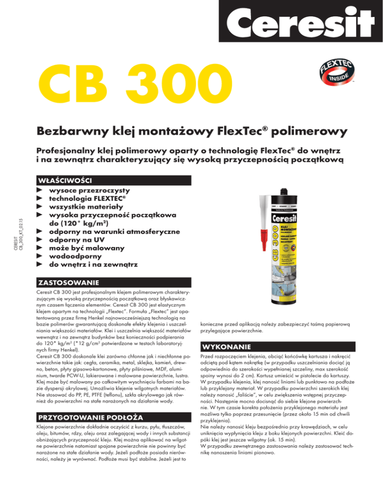 CB 300 Bezbarwny klej montażowy FlexTec® polimerowy CERESIT CB_300_KT_02.15 Profesjonalny klej polimerowy oparty o technologię FlexTec® do wnętrz i na zewnątrz charakteryzujący się wysoką przyczepnością początkową WŁAŚCIWOŚCI wysoce przezroczysty technologia FLEXTEC® wszystkie materiały wysoka przyczepność początkowa do (120* kg/m2) odporny na warunki atmosferyczne odporny na UV może być malowany wodoodporny do wnętrz i na zewnątrz ZASTOSOWANIE Ceresit CB 300 jest profesjonalnym klejem polimerowym charakteryzującym się wysoką przyczepnością początkową oraz błyskawicznym czasem łączenia elementów. Ceresit CB 300 jest elastycznym klejem opartym na technologii „Flextec”. Formuła „Flextec” jest opatentowaną przez firmę Henkel najnowocześniejszą technologią na bazie polimerów gwarantującą doskonałe efekty klejenia i uszczelniania większości materiałów. Klei i uszczelnia większość materiałów wewnątrz i na zewnątrz budynków bez konieczności podpierania do 120* kg/m2 (*12 g/cm2 potwierdzone w testach laboratoryjnych firmy Henkel). Ceresit CB 300 doskonale klei zarówno chłonne jak i niechłonne powierzchnie takie jak: cegła, ceramika, metal, sklejka, kamień, drewno, beton, płyty gipsowo-kartonowe, płyty pilśniowe, MDF, aluminium, twarde PCW-U, lakierowane i malowane powierzchnie, lustra. Klej może być malowany po całkowitym wyschnięciu farbami na bazie dyspersji akrylowej. Umożliwia klejenie wilgotnych materiałów. Nie stosować do PP, PE, PTFE (teflonu), szkła akrylowego jak również do powierzchni na stałe narażonych na działanie wody. PRZYGOTOWANIE PODŁOŻA Klejone powierzchnie dokładnie oczyścić z kurzu, pyłu, tłuszczów, oleju, bitumów, rdzy, oleju oraz zalegającej wody i innych substancji obniżających przyczepność kleju. Klej można aplikować na wilgotne powierzchnie natomiast spajane powierzchnie nie powinny być narażone na stałe działanie wody. Jeżeli podłoże posiada nierówności, należy je wyrównać. Podłoże musi być stabilne. Jeżeli jest to konieczne przed aplikacją należy zabezpieczyć taśmą papierową przylegające powierzchnie. WYKONANIE Przed rozpoczęciem klejenia, obciąć końcówkę kartusza i nakręcić odciętą pod kątem nakrętkę (w przypadku uszczelniania dociąć ją odpowiednio do szerokości wypełnianej szczeliny, max szerokość spoiny wynosi do 2 cm). Kartusz umieścić w pistolecie do kartuszy. W przypadku klejenia, klej nanosić liniami lub punktowo na podłoże lub przyklejany materiał. W przypadku powierzchni szerokich klej należy nanosić „faliście”, w celu zwiększenia wstępnej przyczepności. Następnie mocno docisnąć do siebie klejone powierzchnie. W tym czasie korekta położenia przyklejonego materiału jest możliwa tylko poprzez przesunięcie (przez około 15 min od chwili przyklejenia). Nie należy nanosić kleju bezpośrednio przy krawędziach, w celu uniknięcia wypłynięcia kleju z boku klejonych powierzchni. Kleić dopóki klej jest jeszcze wilgotny (ok. 15 min). W przypadku zewnętrznego zastosowania należy zastosować technikę nanoszenia liniami pionowo. Aplikowany klej nie może być nałożony w sposób ciągły na powierzchni klejonej, ponieważ utwardzanie kleju następuje pod wpływem wilgoci zawartej w powietrzu lub w podłożu. W przypadku klejenia dwóch elementów o powierzchniach niechłonnych zaaplikowany klej nie może być całkowicie odcięty od dostępu powietrza. W zależności od powierzchni, na jakich klejone są elementy, wymagane może być podparcie ciężkich przedmiotów przez min. 24 godziny. W przypadku uszczelniania powierzchnię Ceresit CB 300 należy wygładzić narzędziem zwilżanym w wodnym roztworze mydła. W przypadku uszczelniania nie stosować do dylatacji konstrukcyjnych. Świeże zabrudzenia natychmiast po zastosowaniu należy czyścić za pomocą suchej ściereczki, a następnie acetonem lub benzyną lakową. Utwardzony materiał można usunąć tylko mechanicznie. Wszelkie porady techniczne można uzyskać pod numerami telefonów: +48 800 120 241 +48 41 3710124. Poza informacjami podanymi w niniejszej karcie technicznej należy przestrzegać zasad sztuki budowlanej, wytycznych branżowych instytutów i stowarzyszeń, przedmiotowych norm krajowych i europejskich, dokumentów aprobacyjnych, przepisów BHP, itp. Wymienione powyżej cechy i właściwości techniczne określone zostały w oparciu o praktyczne doświadczenia oraz przeprowadzone badania. Wszelkie właściwości oraz zastosowania materiałów wykraczające poza zakres podany w niniejszej karcie technicznej wymagają naszego pisemnego potwierdzenia. Wszelkie dane odnoszą się do temperatury podłoża, otoczenia i materiału +23°C oraz wilgotności względnej powietrza 50%, o ile nie podano inaczej. W innych warunkach klimatycznych podane parametry mogą ulec zmianie. Informacje zawarte w niniejszej karcie technicznej, w szczególności zalecenia dotyczące sposobu i warunków aplikacji oraz zakresu zastosowania i użytkowania naszych produktów, zostały opracowane na podstawie naszego doświadczenia zawodowego. Niniejsza karta techniczna określa zakres stosowania materiału i zalecany sposób prowadzenia robót, ale nie może zastąpić zawodowego przygotowania wykonawcy. Producent gwarantuje jakość wyrobu, natomiast nie ma wpływu na warunki i sposób jego użycia. Biorąc pod uwagę, że warunki, w których stosowane są produkty mogą ulegać zmianie, w przypadku wątpliwości zalecane jest przeprowadzenie własnych prób. Nie ponosimy odpowiedzialności z tytułu powyżej wymienionych informacji lub jakiejkolwiek rekomendacji słownej z tym związanej, z wyjątkiem przypadków rażącego niedbalstwa lub winy umyślnej. Niniejsza karta techniczna zastępuje wszystkie poprzednie wersje, mające zastosowanie do tego produktu. UWAGA Prace należy wykonywać w suchych warunkach, przy temperaturze powietrza i podłoża o