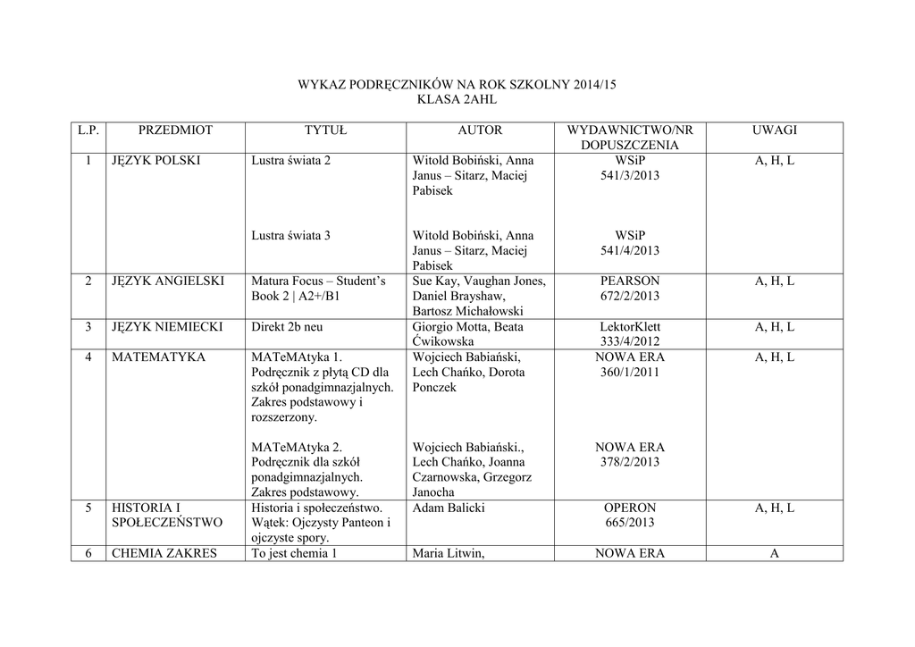 wykaz podręczników na rok szkolny 2014/15 klasa 2ahl lp przedmiot
