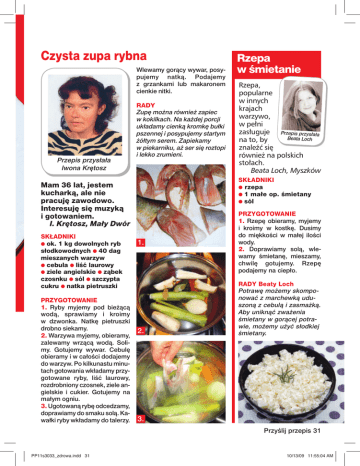 Czysta zupa rybna Wlewamy gorący wywar, posypujemy natką. Podajemy z grzankami lub makaronem cienkie nitki. Przepis przysłała Iwona Krętosz RADY Zupę można również zapiec w kokilkach. Na każdej porcji układamy cienką kromkę bułki pszennej i posypujemy startym żółtym serem. Zapiekamy w piekarniku, aż ser się roztopi i lekko zrumieni. PRZYGOTOWANIE 1. Ryby myjemy pod bieżącą wodą, sprawiamy i kroimy w dzwonka. Natkę pietruszki drobno siekamy. 2. Warzywa myjemy, obieramy, zalewamy wrzącą wodą. Solimy. Gotujemy wywar. Cebulę obieramy i w całości dodajemy do warzyw. Po kilkunastu minutach gotowania wkładamy przygotowane ryby, liść laurowy, rozdrobniony czosnek, ziele angielskie i cukier. Gotujemy na małym ogniu. 3. Ugotowaną rybę odcedzamy, doprawiamy do smaku solą. Kawałki ryby wkładamy do talerzy. Rzepa, popularne w innych krajach warzywo, w pełni zasługuje Przepis przysłała Beata Loch na to, by znaleźć się również na polskich stołach. Beata Loch, Myszków SKŁADNIKI ● rzepa ● 1 małe op. śmietany ● sól Mam 36 lat, jestem kucharką, ale nie pracuję zawodowo. Interesuję się muzyką i gotowaniem. I. Krętosz, Mały Dwór SKŁADNIKI ● ok. 1 kg dowolnych ryb słodkowodnych ● 40 dag mieszanych warzyw ● cebula ● liść laurowy ● ziele angielskie ● ząbek czosnku ● sól ● szczypta cukru ● natka pietruszki Rzepa w śmietanie 1. 2. PRZYGOTOWANIE 1. Rzepę obieramy, myjemy i kroimy w kostkę. Dusimy do miękkości w małej ilości wody. 2. Doprawiamy solą, wlewamy śmietanę, mieszamy, chwilę gotujemy. Rzepę podajemy na ciepło. RADY Beaty Loch Potrawę możemy skomponować z marchewką uduszoną z cebulą i zasmażką. Aby uniknąć zważenia śmietany w gorącej potrawie, możemy użyć słodkiej śmietany. 3. Przyślij przepis 31 PP11s3033_zdrowa.indd 31 10/13/09 11:55:04 AM