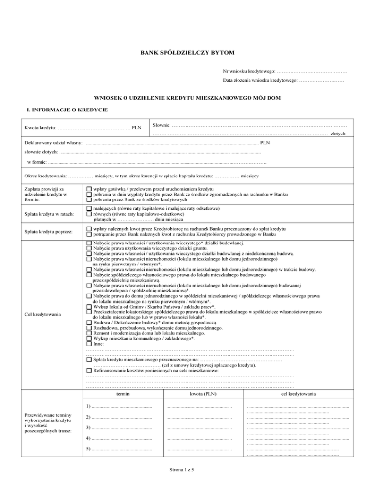 BANK SPÓŁDZIELCZY BYTOM Nr wniosku kredytowego: …………………………………… Data złożenia wniosku kredytowego: ……………………… WNIOSEK O UDZIELENIE KREDYTU MIESZKANIOWEGO MÓJ DOM I. INFORMACJE O KREDYCIE Kwota kredytu: …………….………………………. PLN Słownie: ……………………………..…………………….……………………………………… ………………….………………………………..……………………………………… złotych Deklarowany udział własny: ......................................................................................................................................... PLN słownie złotych: ................................................................................................................................................................ w formie: ...................................................................................................................................................……………….. Okres kredytowania: …………… miesięcy, w tym okres karencji w spłacie kapitału kredytu: …………… miesięcy Zapłata prowizji za udzielenie kredytu w formie: wpłaty gotówką / przelewem przed uruchomieniem kredytu pobrania w dniu wypłaty kredytu przez Bank ze środków zgromadzonych na rachunku w Banku pobrania przez Bank ze środków kredytowych Spłata kredytu w ratach: malejących (równe raty kapitałowe i malejące raty odsetkowe) równych (równe raty kapitałowo-odsetkowe) płatnych w …………………. dniu miesiąca Spłata kredytu poprzez: wpłaty należnych kwot przez Kredytobiorcę na rachunek Banku przeznaczony do spłat kredytu potrącanie przez Bank należnych kwot z rachunku Kredytobiorcy prowadzonego w Banku Cel kredytowania Nabycie prawa własności / użytkowania wieczystego* działki budowlanej. Nabycie prawa użytkowania wieczystego działki gruntu. Nabycie prawa własności / użytkowania wieczystego działki budowlanej z niedokończoną budową. Nabycie prawa własności nieruchomości (lokalu mieszkalnego lub domu jednorodzinnego) na rynku pierwotnym / wtórnym*. Nabycie prawa własności nieruchomości (lokalu mieszkalnego lub domu jednorodzinnego) w trakcie budowy. Nabycie spółdzielczego własnościowego prawa do lokalu mieszkalnego budowanego przez spółdzielnię mieszkaniową. Nabycie prawa własności nieruchomości (lokalu mieszkalnego lub domu jednorodzinnego) budowanej przez dewelopera / spółdzielnię mieszkaniową*. Nabycie prawa do domu jednorodzinnego w spółdzielni mieszkaniowej / spółdzielczego własnościowego prawa do lokalu mieszkalnego na rynku pierwotnym / wtórnym*. Wykup lokalu od Gminy / Skarbu Państwa / zakładu pracy*. Przekształcenie lokatorskiego spółdzielczego prawa do lokalu mieszkalnego w spółdzielcze własnościowe prawo do lokalu mieszkalnego lub w prawo własności lokalu*. Budowa / Dokończenie budowy* domu metodą gospodarczą. Rozbudowa, przebudowa, wykończenie domu jednorodzinnego. Remont i modernizacja domu lub lokalu mieszkalnego. Wykup mieszkania komunalnego / zakładowego*. Inne: ……………………………………………………………………………………………………………. ……………………………………………………………………………………………………………. Spłata kredytu mieszkaniowego przeznaczonego na: …………………………………………. …………………………………. (cel z umowy kredytowej spłacanego kredytu). Refinansowanie kosztów poniesionych na cele mieszkaniowe: ……………………………………………………………………………………………………………. ……………………………………………………………………………………………………………. ……………………………………………………………………………………………………………. termin Przewidywane terminy wykorzystania kredytu i wysokość poszczególnych transz: kwota (PLN) 1) ................................................ .................................................... 2) ................................................ .................................................... 3) ................................................ .................................................... 4) ................................................ .................................................... 5) ................................................ .................................................... Strona 1 z 5 cel kredytowania ................................................................................. ................................................................. ................................................................................. ................................................................. ................................................................................. ................................................................. ................................................................................. ................................................................. ......................................................................... ......................................................................... Wartość nieruchomości będącej zabezpieczeniem kredytu: …………….………………………. PLN Adres nieruchomości będącej zabezpieczeniem kredytu: Słownie: ……………………………..…………………….……………………………………… ………………….………………………………..…………………………………………… złotych ………………….………………………………..………………………………………………………… pierwsza hipoteka na nieruchom