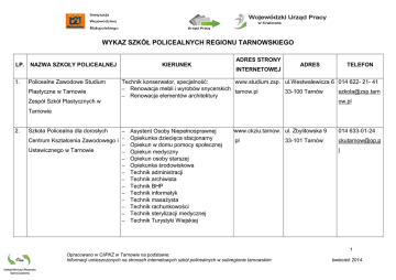 WYKAZ SZKÓŁ POLICEALNYCH REGIONU TARNOWSKIEGO LP. 1. NAZWA SZKOŁY POLICEALNEJ Policealne Zawodowe Studium Plastyczne w Tarnowie Zespół Szkół Plastycznych w KIERUNEK ADRES STRONY INTERNETOWEJ ADRES TELEFON Technik konserwator, specjalność: www.studium.zsp. ul.Westwalewicza 6 014 622- 21- 41 Renowacja mebli i wyrobów snycerskich tarnow.pl 33-100 Tarnów [email protected] Renowacja elementów architektury ow.pl Tarnowie 2. Szkoła Policealna dla dorosłych Centrum Kształcenia Zawodowego i Ustawicznego w Tarnowie Asystent Osoby Niepełnosprawnej Opiekunka dziecięca stacjonarny Opiekun w domu pomocy społecznej Opiekun medyczny Opiekun osoby starszej Opiekunka środowiskowa Technik administracji Technik archiwista Technik BHP Technik informatyk Technik masażysta Technik rachunkowości Technik sterylizacji medycznej Technik Turystyki Wiejskiej wwww.ckziu.tarnow. ul. Zbylitowska 9 pl 33-101 Tarnów 014 633-01-24 [email protected] l 1 Opracowano w CIiPKZ w Tarnowie na podstawie: Informacji umieszczonych na stronach internetowych szkół policealnych w subregionie tarnowskim kwiecień 2014 3. Szkoła Policealna Zespół Szkół Technicznych Technik informatyk, Technik farmaceutyczny www.zst.tarnow.pl ul. Kwiatkowskiego im. Ignacego Mościckiego 17 014 688-99-01 33-101 Tarnów [email protected] w Tarnowie – Mościcach 4. Szkoła Policealna 014 688-99-00 l www.zsoiz.ciezko ul. Łuczkiewiczów 014 651-10-80 Zespół Szkół Ogólnokształcących i wice.pl/o- 12 sekretariat.zsoiz Zawodowych im. Ignacego Jana szkole/kontakt 33-190 Ciężkowice @interia.pl Terapeuta zajęciowy Paderewskiego w Ciężkowicach 5. Policealna Szkoła Zawodowa w Brzesku 6. Policealne Studium Zawodowe Niepublicznej Szkoły Biznesu Asystent osoby niepełnosprawnej Florysta Opiekun medyczny Opiekunka środowiskowa Technik administracji Technik archiwista Technik bezpieczeństwa i higieny pracy Technik drogownictwa Technik geodeta Technik informatyk Technik pojazdów samochodowych Technik rachunkowości Technik turystyki wiejskiej Technik usług kosmetycznych www.brzesko.edu. ul. Piastowska 7 14 66 33 242 pl technikum@brze Asystentka stomatologiczna Opiekun medyczny Opiekun w domu pomocy społecznej www.nsb.com.pl 32-800 Brzesko sko.edu.pl ul. Szujskiego 15 014 627-50-15 33-100 Tarnów nsbtarnow@nsb. 2 Opracowano w CIiPKZ w Tarnowie na podstawie: Informacji umieszczonych na stronach internetowych szkół policealnych w subregionie tarnowskim kwiecień 2014 w Tarnowie Uprawnienia szkoły publicznej 7. 8. Cosinus Bezpłatne szkoły Centrum Nauki i Biznesu „Żak” Oddział w Tarnowie Opiekunka dziecięca Technik administracji Technik dentystyczny Technik farmaceutyczny Technik informatyk Technik masażysta Technik rachunkowości Terapeuta zajęciowy Aranżacja krajobrazu Biomasaż Dekorator wnętrz Florysta Fryzjerstwo damskie Grafika komputerowa multimediów Ochrona fizyczna osób i mienia Opiekun w domu pomocy społecznej Technik administracji Technik BHP Technik informatyk Technik rachunkowości Technik usług kosmetycznych Wizażystka - stylistka DWULETNIE POLICEALNE STUDIUM: Opiekun w domu pomocy społecznej Technik administracji Technik bhp Technik informatyk Technik rachunkowości Technik usług kosmetycznych Technik turystyki wiejskiej com.pl www.cosinus.pl/ ul. Sienna 5 014 626-22-36 33-100 Tarnów tarnow@cosinu. pl www.tarnow.zak.e ul. Mickiewicza 1/2 du.pl/ 33-100 Tarnów 014 627-33-16 014 627-37-90 [email protected] .pl 3 Opracowano w CIiPKZ w Tarnowie na podstawie: Informacji umieszczonych na stronach internetowych szkół policealnych w subregionie tarnowskim kwiecień 2014 9. Policealna Szkoła Detektywów i JEDNOROCZNE POLICEALNE STUDIUM: Asystent Osoby Niepełnosprawnej Asystent zarządu Biomasażysta Dekorator Wnętrz Ekspedytor Florysta Florysta Fryzjer damski Fryzjer męski Instruktor fitness Konsultant ds. żywienia Ogrodnik terenów zieleni Opiekunka środowiskowa Pracownik ds. osobowych Rysunek malarstwo Rysunek i Malarstwo Terapeuta ds. uzależnień Wizażystka/Stylistka Technik ochrony fizycznej osób i mienia www.skorpion.akr ul. Kopernika 10 Pracowników Ochrony w Tarnowie 10. „Profesja” Centrum Kształcenia Kadr on.com.pl Agent Celny Agrobiznes Architektura krajobrazu Archiwizacja Asystent osoby niepełnosprawnej Asystentka stomatologiczna Badania Marketingowe 33-100 Tarnów www.profesja.edu. ul. Krakowska 6 pl/ 33-100 Tarnów 014 622-31-51 (014) 621-60-12 014 630-06-88 014 630-06-89 tarnow@profesja .edu.pl 4 Opracowano w CIiPKZ w Tarnowie na podstawie: Informacji umieszczonych na stronach internetowych szkół policealnych w subregionie tarnowskim kwiecień 2014 BHP Budowa dróg Budownictwo Bukieciarstwo Charakteryzacja Dekoracja Wnętrz Dietetyka Drukarz Ekonomia i zarządzanie Elektronika Elektronika i informatyka medyczna Elektryka Finanse i Rachunkowość Florysta Fotografia /Fotoreportaż Fototechnik Fryzjerstwo Geodezja Geologia Górnictwo podziemne Handel Higienistka stomatologiczna Hostessa Hotelarstwo Informacja Turystyczna Informatyka Kasjer Kelner Kosmetyka Kosztorysowanie Budowlane 5 Opracowano w CIiPKZ w Tarnowie na podstawie: Informacji umieszczonych na stronach internetowych szkół policealnych w subregionie tarnowskim kwiecień 2014 Krupier Księgarstwo Kucharz Logistyka Manikiur Masaż Mechanika Mechatronika Modelka / Model Obsługa Baz Danych Ochrona Fizyczna Osób i Mienia Opieka środowiskowa Opiekun medyczny Opiekun osoby starszej Opiekun Seniora Opiekun w Domu Pomocy Społecznej Opiekunka dziecięca Opiekunka Dziecięca Domowa Optyka Organizacja Biur Podróży Organizacja Imprez / Katering Organizacja Imprez Sportowych Pedikiur Pilot Wycieczek Pojazdy samochodowe Prawo i Administracja Produkcja Filmowa i Telewizyjna Protetyk słuchu Prowadzenie Domu Przedstawicielstwo Handlowe 6 Opracowano w CIiPKZ w Tarnowie na podstawie: Informacji umieszczonych na stronach internetowych szkół policealnych w subregionie tarnowskim kwiecień 2014 Przetwórstwo mleczarskie 