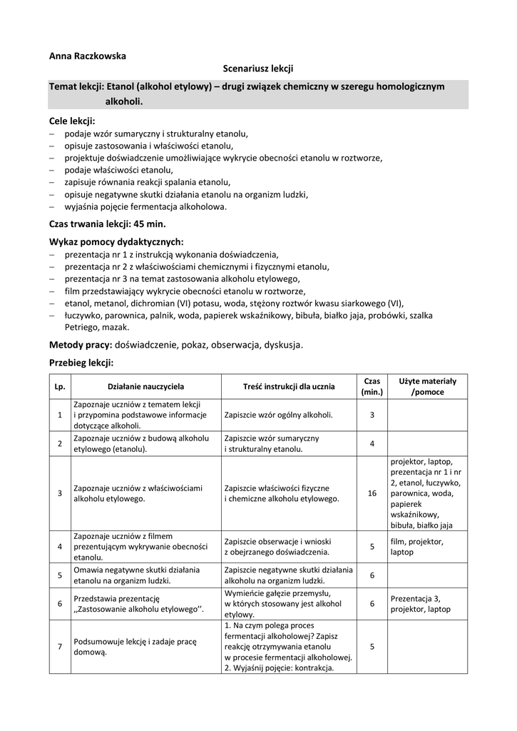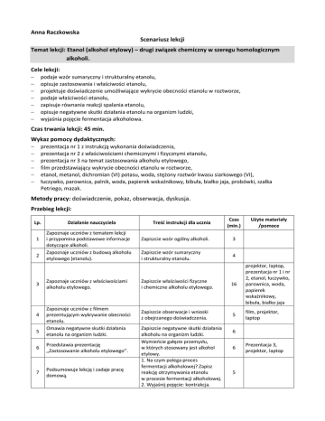 Anna Raczkowska Scenariusz lekcji Temat lekcji: Etanol (alkohol