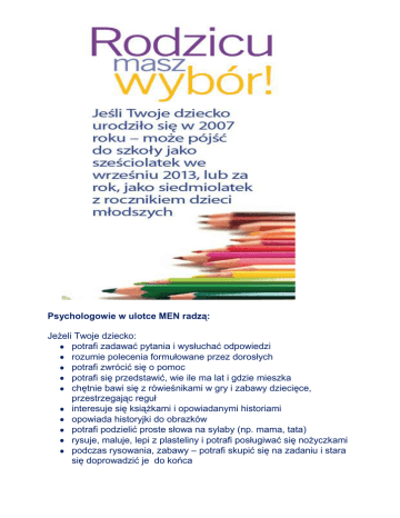 Psychologowie w ulotce MEN radzą: Jeżeli Twoje dziecko: potrafi zadawać pytania i wysłuchać odpowiedzi rozumie polecenia formułowane przez dorosłych potrafi zwrócić się o pomoc potrafi się przedstawić, wie ile ma lat i gdzie mieszka chętnie bawi się z rówieśnikami w gry i zabawy dziecięce, przestrzegając reguł interesuje się książkami i opowiadanymi historiami opowiada historyjki do obrazków potrafi podzielić proste słowa na sylaby (np. mama, tata) rysuje, maluje, lepi z plasteliny i potrafi posługiwać się nożyczkami podczas rysowania, zabawy – potrafi skupić się na zadaniu i stara się doprowadzić je do końca potrafi liczyć, dodawać i odejmować na przedmiotach i na palcach umie pokazać prawą i lewą stronę to znaczy, że z powodzeniem rozpocznie naukę w pierwszej klasie. Jeżeli Twoje dziecko chce iść do szkoły i radzi sobie w wymienionych wyżej zakresach, da sobie radę w pierwszej klasie. Przed podjęciem tej bardzo dla Państwa decyzji warto zapoznać się z dodatkowymi informacjami: Na stronie krakowskiego Portalu Edukacyjnego: http://www.portaledukacyjny.krakow.pl/index.php?type=szesciolatki tu można znaleźć informacje z naszej szkoły: http://www.portaledukacyjny.krakow.pl/index.php?type=szesciolatki&action=news&id=45 http://www.portaledukacyjny.krakow.pl/index.php?type=szesciolatki&action=news&id=41 Inne ważne informacje: PODSTAWA PROGRAMOWA I ETAPU EDUKACJI http://www.portaledukacyjny.krakow.pl/index.php?type=szesciolatki&action=news&id=64 RAPORT O SZEŚCIOLATKACH W KRAKOWSKICH SZKOŁACH SAMORZĄDOWYCH http://www.portaledukacyjny.krakow.pl/index.php?type=szesciolatki&action=news&id=72 CZY TWÓJ PRZEDSZKOLAK DOJRZAŁ DO PODJĘCIA NAUKI SZKOLNEJ? http://www.portaledukacyjny.krakow.pl/files/Krakow_zGotowosc_szkolna_fragmenty_wykladu.pdf Sześciolatek w szkole strona dla rodziców http://www.ore.edu.pl/index.php?option=com_content&view=category&layout=b log&id=161&Itemid=1599 Na stronie Ministerstwa Edukacji NarodowejMam 6 lat: http://men.gov.pl/index.php?option=com_content&view=category&layout=blog& id=267&Itemid=341 Harmonogram dni otwartych w SP86: DATA GODZ . 17.00 TEMAT DLA RODZICÓW „Oferta szkoły” 17.00 „Dojrzałość szkolna” 10.04 środa 17.00 „Opiekuńczo – wychowawcza rola szkoły” 28.05 wtorek 17.00 „Jak przygotować dziecko do podjęcia nauki szkolnej” 13.02 środa 06.03 środa ZAJĘCIA DLA DZIECI Zajęcia plastyczne dla dzieci. Spotkanie z matematyką i przyrodą– wesołe gry i zabawy... Lubię tańczyć, lubię śpiewać – pląsy i zabawy ruchowe także w j. angielskim. Mój przyjaciel komputer. W trakcie spotkań możliwe będą indywidualne konsultacje z pedagogiem, psychologiem, logopedą oraz nauczycielami nauczania początkowego. Planujemy także specjalny dzień otwarty dla rodziców sześciolatków (rocznik 2007) rozważających zapisanie dzieci do klas 1.