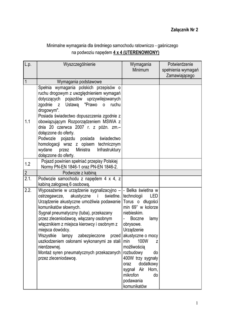 Załącznik Nr 2 Minimalne wymagania dla średniego samochodu ratowniczo - gaśniczego na podwoziu napędem 4 x 4 (UTERENOWIONY) L.p. 1 1.1 1.2 2 2.1. 2.2. Wyszczególnienie Wymagania podstawowe Spełnia wymagania polskich przepisów o ruchu drogowym z uwzględnieniem wymagań dotyczących pojazdów uprzywilejowanych zgodnie z Ustawą "Prawo o ruchu drogowym". Posiada świadectwo dopuszczenia zgodnie z obowiązującym Rozporządzeniem MSWiA z dnia 20 czerwca 2007 r. z późn. zm.– dołączone do oferty. Podwozie pojazdu posiada świadectwo homologacji wraz z opisem technicznym wydane przez Ministra Infrastruktury dołączone do oferty. Pojazd powinien spełniać przepisy Polskiej Normy PN-EN 1846-1 oraz PN-EN 1846-2. Podwozie z kabiną Podwozie samochodu z napędem 4 x 4, z kabiną załogową 6 osobową. Wyposażenie w urządzenie sygnalizacyjno – ostrzegawcze, akustyczne i świetlne. Urządzenie akustyczne umożliwia podawanie komunikatów słownych. Sygnał pneumatyczny (tuba), przekazany przez zleceniodawcę, włączany osobnym włącznikiem z miejsca kierowcy i osobnym z miejsca dowódcy. Wszystkie lampy zabezpieczone przed uszkodzeniem osłonami wykonanymi ze stali nierdzewnej. Montaż syren pneumatycznych przekazanych przez zleceniodawcę. Wymagania Minimum Potwierdzenie spełnienia wymagań Zamawiającego - Belka świetlna w technologii LED Torus o długości min 69’’ w kolorze niebieskim. - Boczne lamy obrysowe. Urządzenie akustyczne o mocy min 100W z możliwością rozbudowy do 400W trzy sygnały oraz dodatkowy sygnał Air Horn, mikrofon do podawania komunikatów 1 słownych, sterowanie za pomocą manipulatora, możliwość zmiany modulacji za pomocą klaksonu. 2.3. 2.4. 2.5. 2.6. Dodatkowe 2 lampy sygnalizacyjne niebieskie pulsacyjne umieszczone z przodu pojazdu typu LED. Podwozie samochodu z manualną skrzynią Min. moc 290KM biegów - z silnikiem o zapłonie samoczynnym. Silnik spełniający obowiązujące normy czystości spalin. Silnik samochodu przystosowany do zasilania biopaliwami lub paliwami z dodatkiem biokomponentów w ilości nie mniejszej niż 5%. W instrukcji użytkowania samochodu muszą znaleźć się zapisy o warunkach technicznych oraz czynnościach obsługowych koniecznych przy zasilaniu silnika biopaliwami lub paliwami z biokomponentami. Gwarancja na pojazd nie może wyłączać stosowania ww. paliwa. W załączeniu do oferty dokument producenta podwozia potwierdzający stosowanie biopaliw. Maksymalna wysokość całkowita pojazdu; - 3500 mm maksymalna wysokość górnej krawędzi - nie wyżej niż najwyższej półki lub szuflady w położeniu 1850 mm od roboczym (po wysunięciu lub rozłożeniu). poziomu terenu Półki na prowadnicach ze stali nierdzewnej z możliwością regulacji wysokości. Pojazd wyposażony w podesty umożliwiające łatwy dostęp do sprzętu przy każdej żaluzji, przy czym otwarcie lub wysunięcie podestów sygnalizowane w kabinie kierowcy. Napęd 4 x 4 uterenowiony: - możliwość odłączania napędu osi przedniej, możliwość blokady mechanizmu różnicowego przedniej i tylnej osi, - przekładnia rozdzielcza z przełożeniem terenowym i szosowym, - na osi przedniej koła pojedyncze, na osi tylnej koła podwójne, 2 2.7. - hamulce tarczowe, - system ABS, - silnik wyposażony w hamulec silnikowy. Kabina czterodrzwiowa, fabrycznie jednomodułowa, zapewniająca dostęp do silnika, w układzie miejsc 1 + 1 + 4 (siedzenia przodem do kierunku jazdy), Kabina wyposażona w: indywidualne oświetlenie nad siedzeniem dowódcy, radiotelefon przewoźny typu Motorola GM360, dodatkowo w przedziale autopompy zainstalowany musi być głośnik z mikrofonem współpracujący z ww radiotelefonem, niezależny układ ogrzewania i wentylacji, umożliwiający ogrzewanie kabiny przy wyłączonym silniku, szyberdach, rolety wewnętrzne, elektryczne szyby przednie, sterowanie elektryczne lusterek i podgrzewanie, zawieszenie kabiny na poduszkach pneumatycznych, klimatyzację. Podest z zasilaniem radiotelefonów przenośnych, latarek itp, Poręcz lub uchwyty do trzymania w tylnej części kabiny Za siedzeniem kierowcy oraz dowódcy mocowania na dwie szt. Aparatów powietrznych jednobutlowych radioodtwarzacz 2.8. Fotele wyposażone w pasy bezpieczeństwa: siedzenia pokryte materiałem łatwo zmywalnym, odpornym na rozdarcie i ścieranie, fotele wyposażone w zagłówki, fotel dla kierowcy z regulacją wysokości, odległości i pochylenia oparcia. 2.9. Instalacja elektryczna jednoprzewodowa 24V, z biegunem ujemnym na masie lub 3 2.10. 2.11. 2.12. 2.13. 2.14. 2.15. 2.16. 2.17. 2.18. 2.19. 2.20. dwuprzewodowa w przypadku zabudowy z tworzywa sztucznego. Moc alternatora i pojemność akumulatorów zapewnia pełne zapotrzebowanie na energię elektryczną przy jej maksymalnym obciążeniu. Instalacja elektryczna wyposażona w główny wyłącznik prądu. Pojazd wyposażony w gniazdo (z wtyczką) do ładowania akumulatorów ze źródła zewnętrznego umieszczone po lewej stronie (sygnalizacja podłączenia do zewnętrznego źródła w kabinie kierowcy). Samochód wyposażony w instalację antenową na pasmo radiowe 148 MHz. Pojazd wyposażony w sygnalizację świetlną i dźwiękową włączonego biegu wstecznego, jako sygnalizację świetlną dopuszcza się światło cofania oraz wyposażony w kamerę cofania. Maksymalna prędkość na najwyższym biegu. - nie mniejsza niż 85 km/h Kolorystyka: oznakowanie numerami samochód – RAL 3000 elementy błotników i zderzaków – operacyjnymi białe/szare elementy podwozia – czarne Instalacja pneumatyczna pojazdu - dodatkowe złącze zapewniająca możliwość wyjazdu w ciągu 60 pneumatyczne do ze źródła s, od chwili uruchomienia silnika samochodu, zasilania zewnętrznego z równocześnie zapewnione prawidłowe lewej strony pod funkcjonowanie hamulców. zderzakiem Wylot spalin nie skierowany na stanowisko obsługi poszczególnych urządzeń pojazdu, zapewnić ochronę przed oparzeniami podczas normalnej p