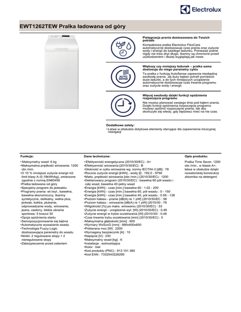 EWT1262TEW Pralka ładowana od góry Pielęgnacja prania dostosowana do Twoich potrzeb Kompaktowa pralka Electrolux FlexCare automatycznie dostosowuje czas prania oraz zużycie wody i energii do każdego ładunku. Ponieważ pranie nigdy nie trwa zbyt długo, tkaniny są chronione przed uszkodzeniem i dłużej wyglądają jak nowe. Większy czy mniejszy ładunek – pralka sama dostosuje do niego parametry cyklu Ta pralka z funkcją AutoSense zapewnia niezbędną swobodę prania. Jej duży bęben potrafi pomieścić duże ładunki, a do tych mniejszych urządzenie automatycznie dostosowuje czas trwania programu oraz zużycie wody i energii. Więcej swobody dzięki funkcji opóźnienia rozpoczęcia programu Nie musisz planować swojego dnia pod kątem prania. Dzięki funkcji opóźnienia rozpoczęcia programu możesz opóźnić rozpoczęcie prania, tak aby skończyło się wtedy, gdy będziesz mieć na nie czas. Dodatkowe zalety: • Łatwe w obsłudze dotykowe elementy sterujące dla zapewnienia intuicyjnej nawigacji Funkcje: Dane techniczne: Opis produktu: • Maksymalny wsad: 6 kg •Maksymalna prędkość wirowania: 1200 obr./min. •O 10 % mniejsze zużycie energii niż limit klasy A (0,19kWh/kg), zmierzone zgodnie z normą EN60456 •Pralka ładowana od góry •Specjalny program do jedwabiu •Programy prania: wł./wył., bawełna, bawełna ekonomiczny, tkaniny syntetyczne, delikatny, wełna plus, jedwab, kołdra, płukanie, odprowadzanie wody, wirowanie, jeans, zasłony, lekkie ubrania sportowe, 5 koszul 30 •Opcja opóźnienia startu •Samopozycjonowanie się bębna •Automatyczne wyważanie wsadu •Technologia Fuzzy Logic dostosowująca parametry do wsadu •Nóżki: 2 regulowane stopy + 2 nieregulowane stopy •Zabezpieczenie przed zalaniem • Efektywność energetyczna (2010/30/EC) : A+ •Efektywność wirowania [2010/30/EC] : B •Głośność w cyklu wirowania wg. normy IEC704-3 [dB] : 78 •Roczne zużycie energii [kWh] - wody [l] : 192,0 - 9790 •Maks. prędkość wirowania [obr./min.] (2010/30/EC) : 1200 •Deklarowany program (2010/30/EC) : bawełna 60 pół wsadu i cały wsad, bawełna 40 pełny wsad •Energia [kWh] - czas [min.] bawełna 60 : 1.02 - 200 •Energia [kWh] - czas [min.] bawełna 60, pół wsadu : 0 - 150 •Energia [kWh] - czas [min.] bawełna 40, pół wsadu : 0.59 - 138 •Poziom hałasu - pranie [dB(A) re 1 pW] (2010/30/EC : 58 •Poziom hałasu - wirowanie [dB(A) re 1 pW] (2010/30 : 78 •Wilgotność [%] po maks. wirowaniu (2010/30/EC) : 53 •Zużycie energii - urządzenie wył. [W] (2010/30/EC) : 0,48 •Zużycie energii w trybie oczekiwania [W] (2010/30/ : 0,48 •Czas trwania trybu oczekiwania [min] (2010/30/EC) : 5 •Maksymalna głębokość [mm] : 600 •Wymiary WxSzxG [mm] : 890x400x600 •Pobierana moc [W] : 2200 •Wymagany bezpiecznik [A] : 10 •Napięcie [V] : 230 •Maksymalny wsad [kg] : 6 •Instalacja : wolnostojąca •Kolor : biel •Kod produktu (PNC) : 913 101 380 •Kod EAN : 7332543226290 Pralka Time Saver, 1200 obr./min., w klasie A+, łatwa w obsłudze dzięki nowatorskiej konstrukcji zbiornika na detergent.